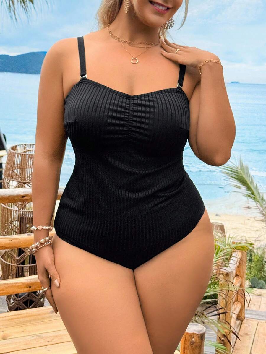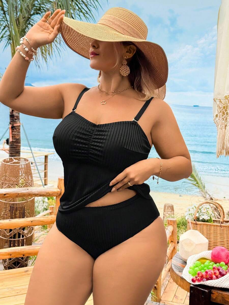 Lushoire traje de bano de 2 piezas de estilo minimalista solido negro para mujer de talla grande, con top brasier sin tirantes ajustable y bottom de cintura alta