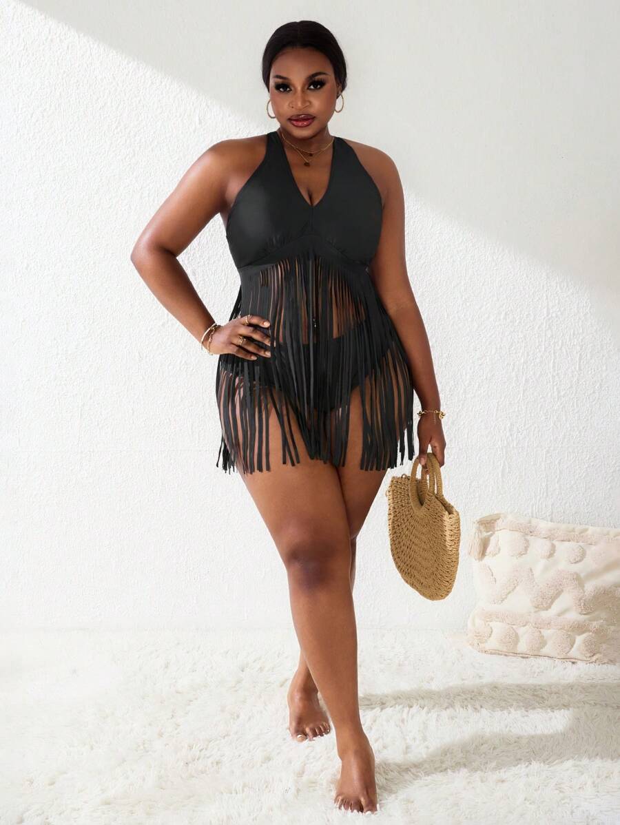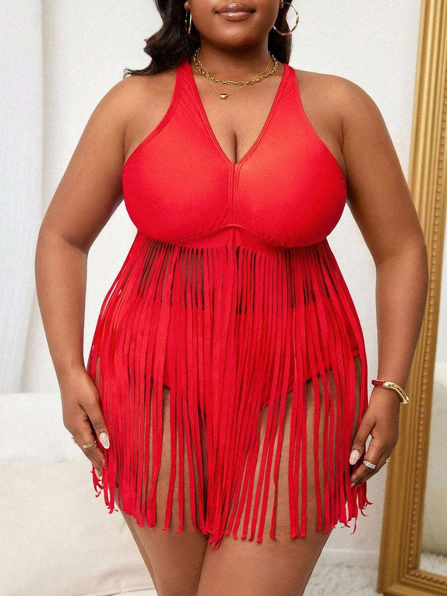 Top de bikini con diseno de flecos y estampado de leopardo colorido para mujer de talla grande