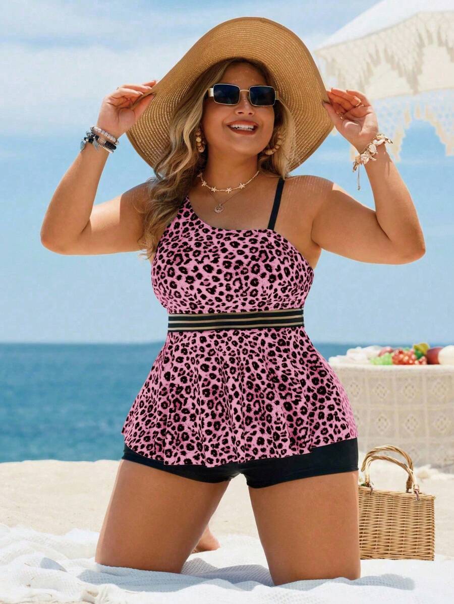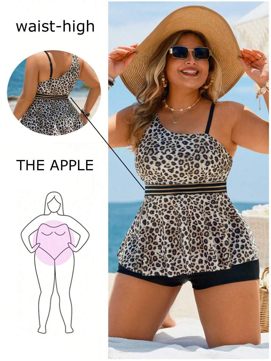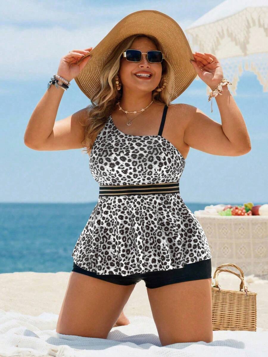 Lushoire conjunto de tankini de talla grande para mujer de 2 piezas con estampado de leopardo, tirantes y volantes en la bottom de la cintura alta