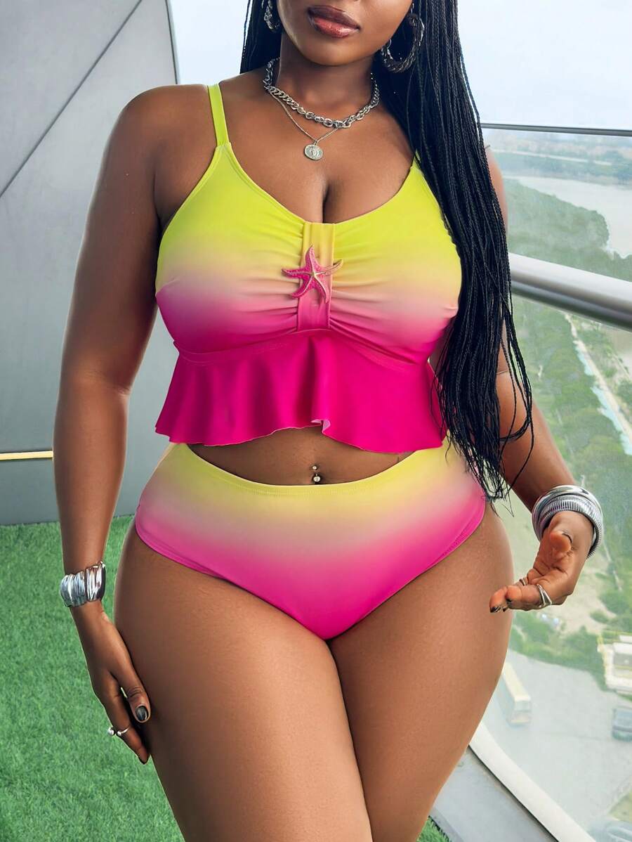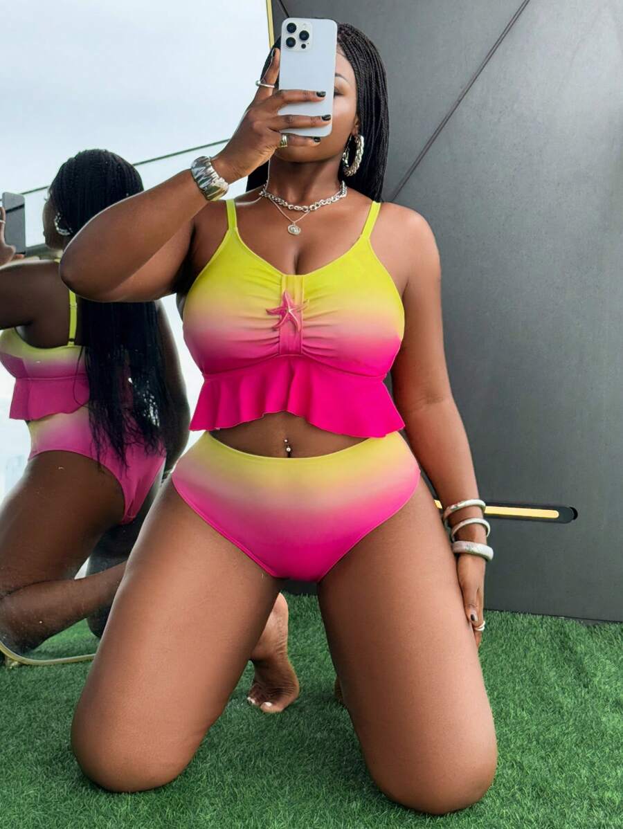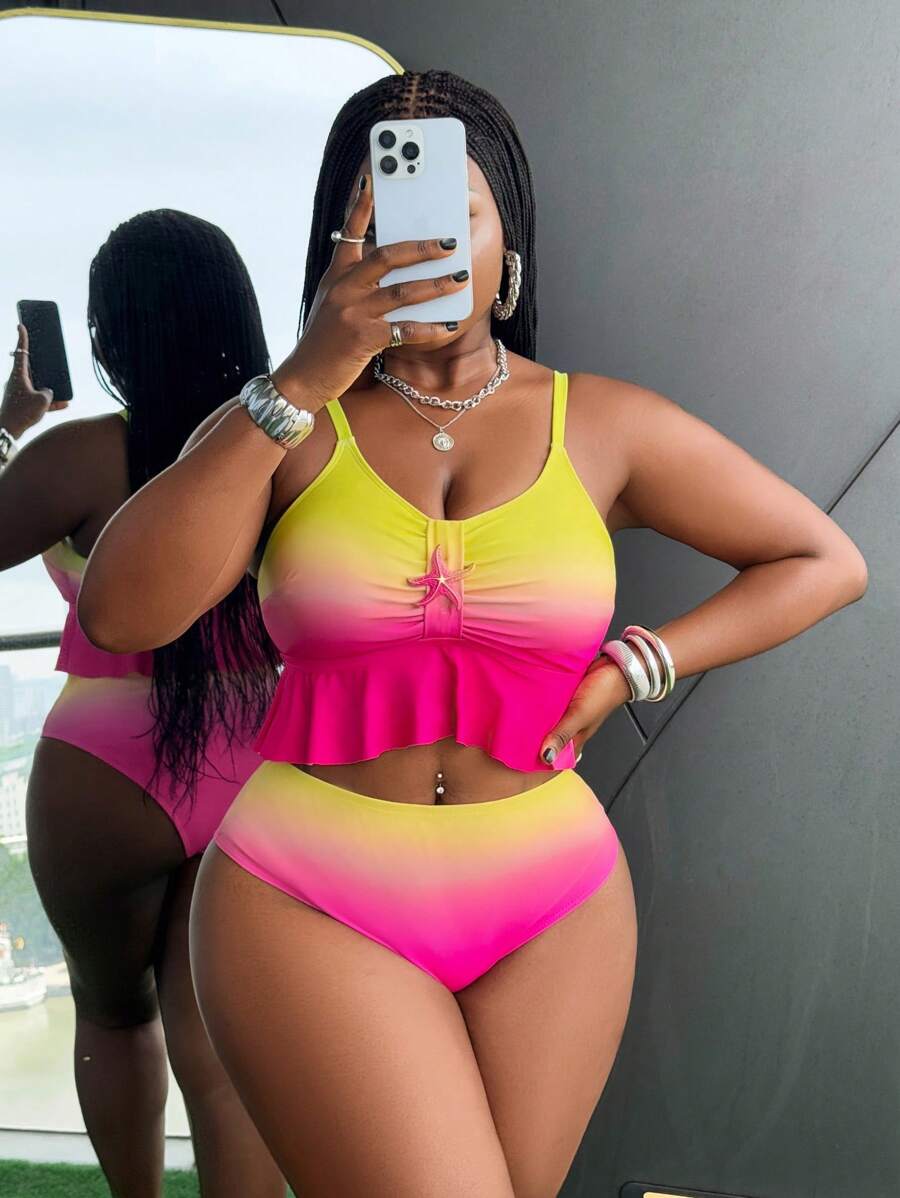 Conjunto de bikini de 2 piezas de talla grande para mujer con estilo minimalista, de cintura alta, con diseno de tenido anudado degradado y tirantes finos para vacaciones