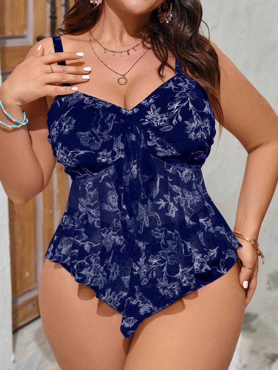 Traje de bano tipo tankini, con camisa de tirar por delante y estampado floral, para mujeres de talla grande
