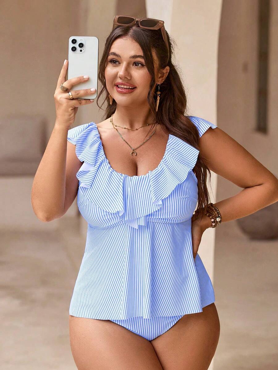 Conjunto de 2 piezas de bikini talla grande para mujer con parte superior tipo crop top y bottom con tiras plisadas y a rayas