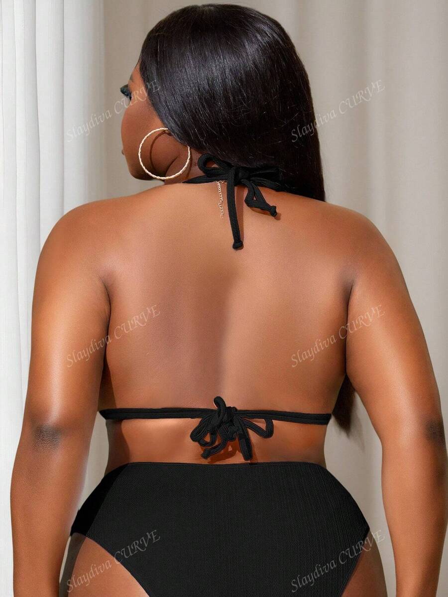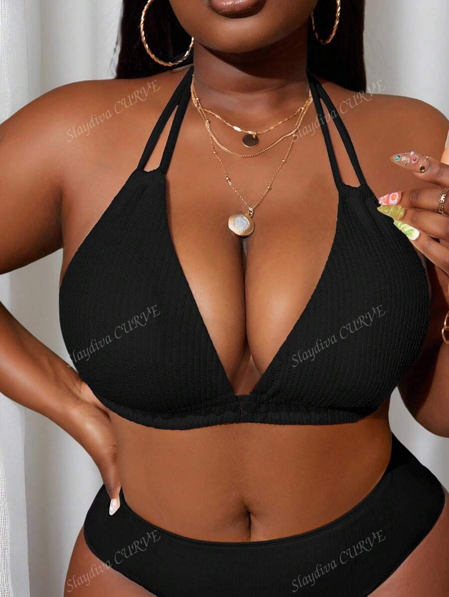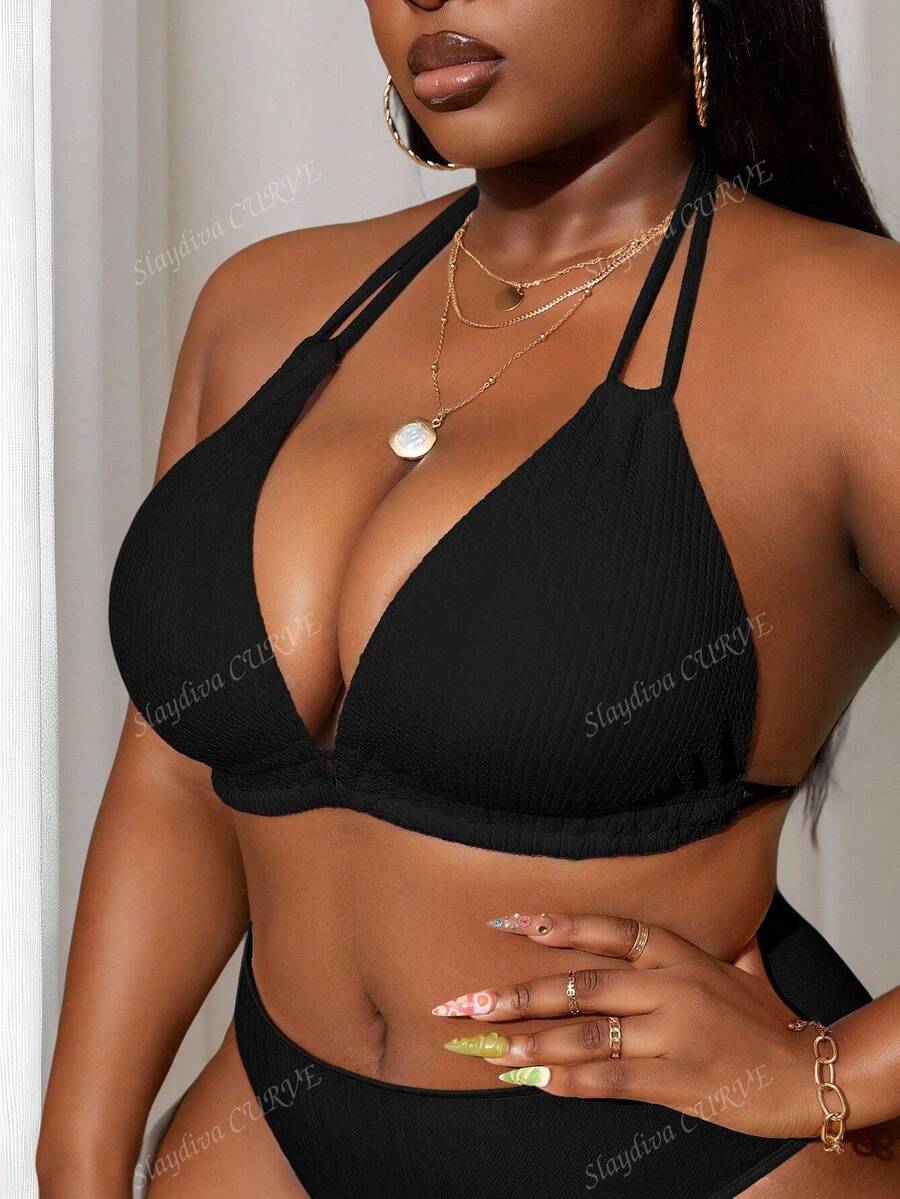 Top de natacion de tela texturizada de unicolor con cuello halter para tallas grandes, de verano