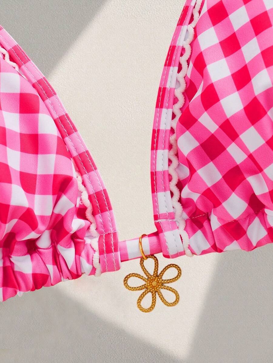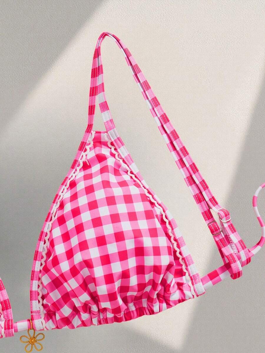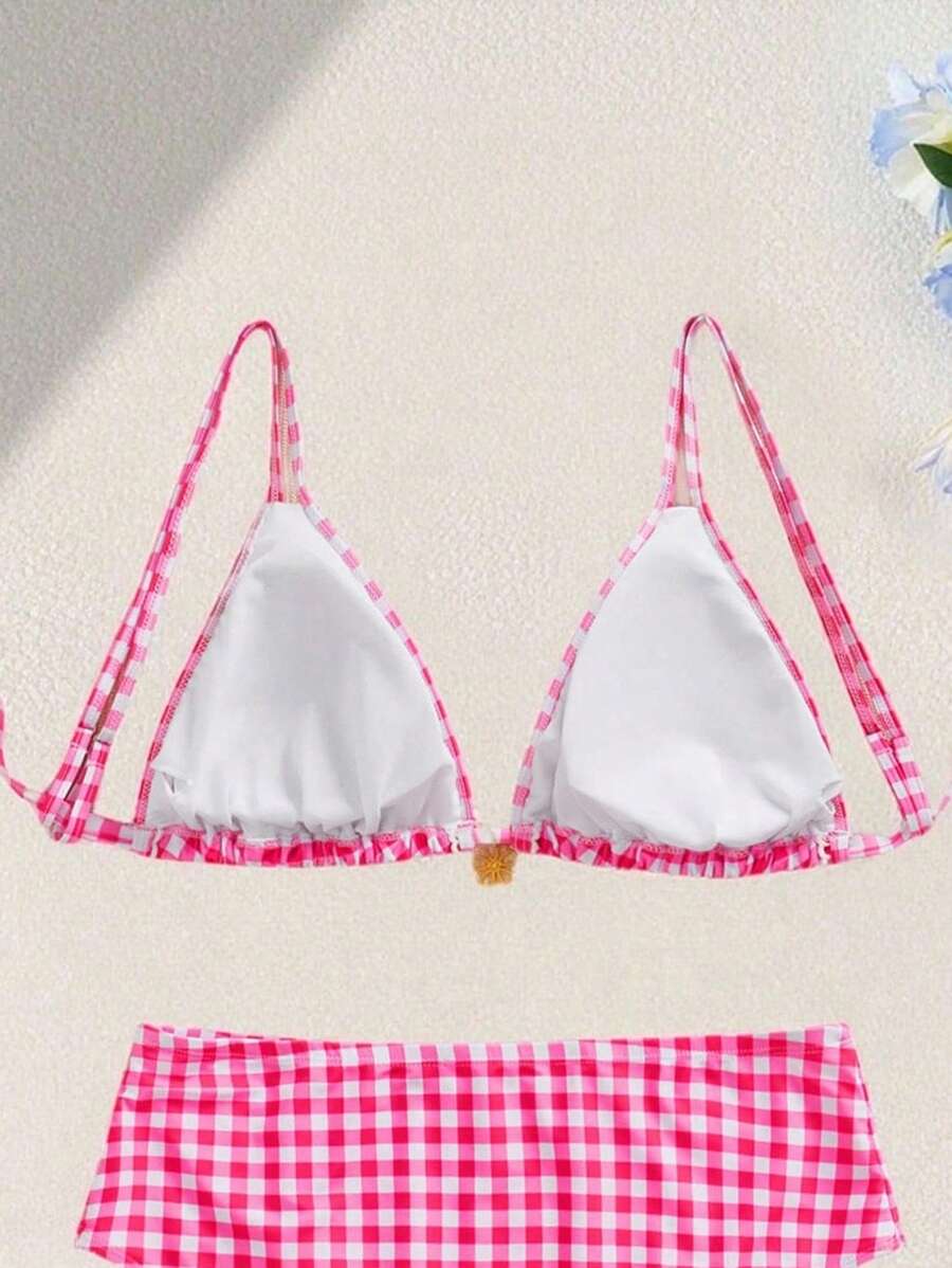 Bikini de tallas grandes para mujer con parte superior con impresion aleatoria linda, vichy blanco y rosa, tirantes ajustables, acento floral, para vacaciones de verano en la playa