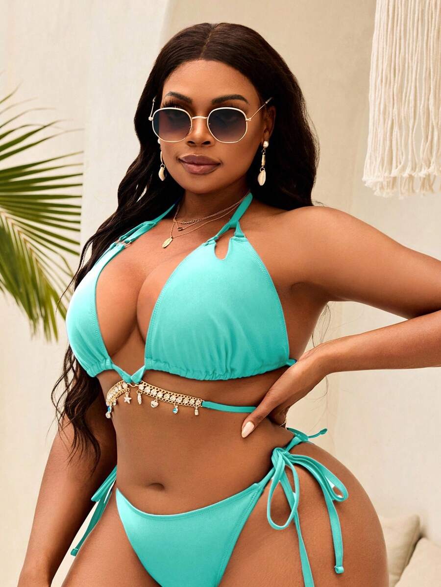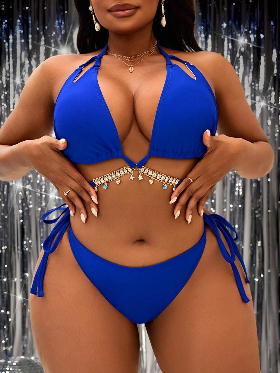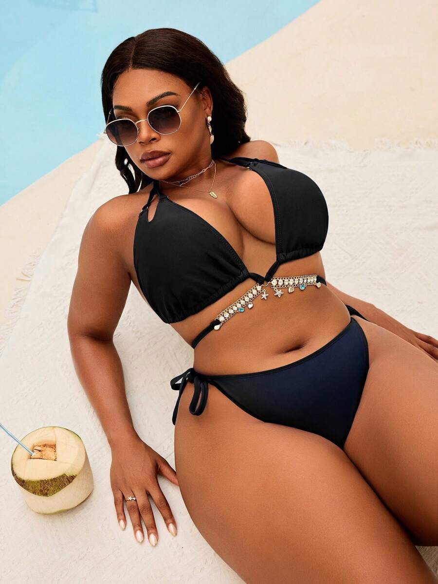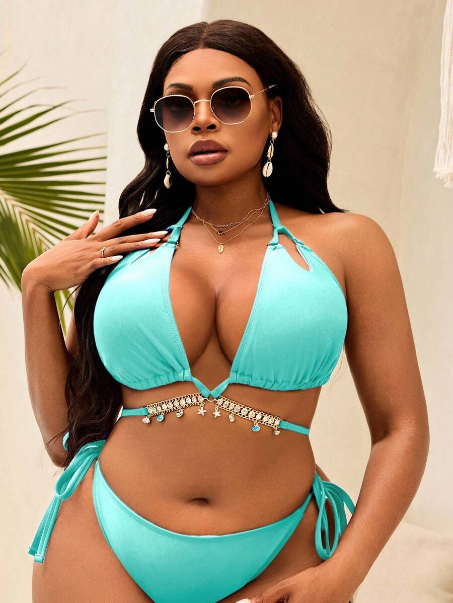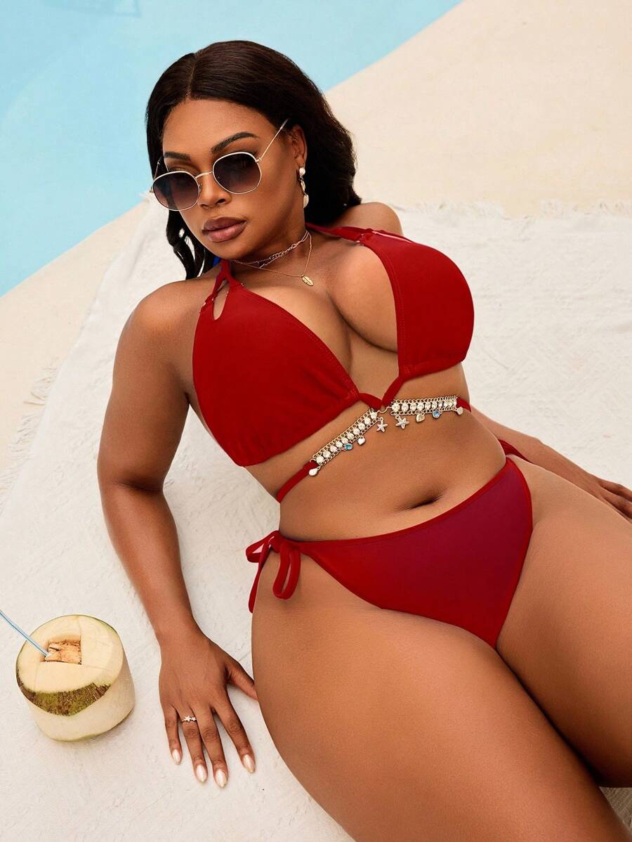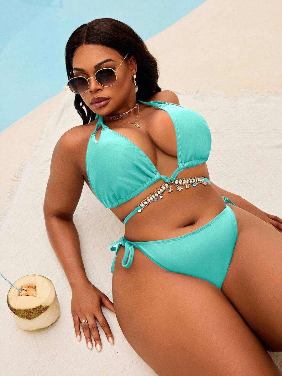 Top de bikini con tallas grandes de unicolor, de escote halter con atar, copa triangular y decoracion con cadena de cristal, traje de bano sexy de moda para vacaciones