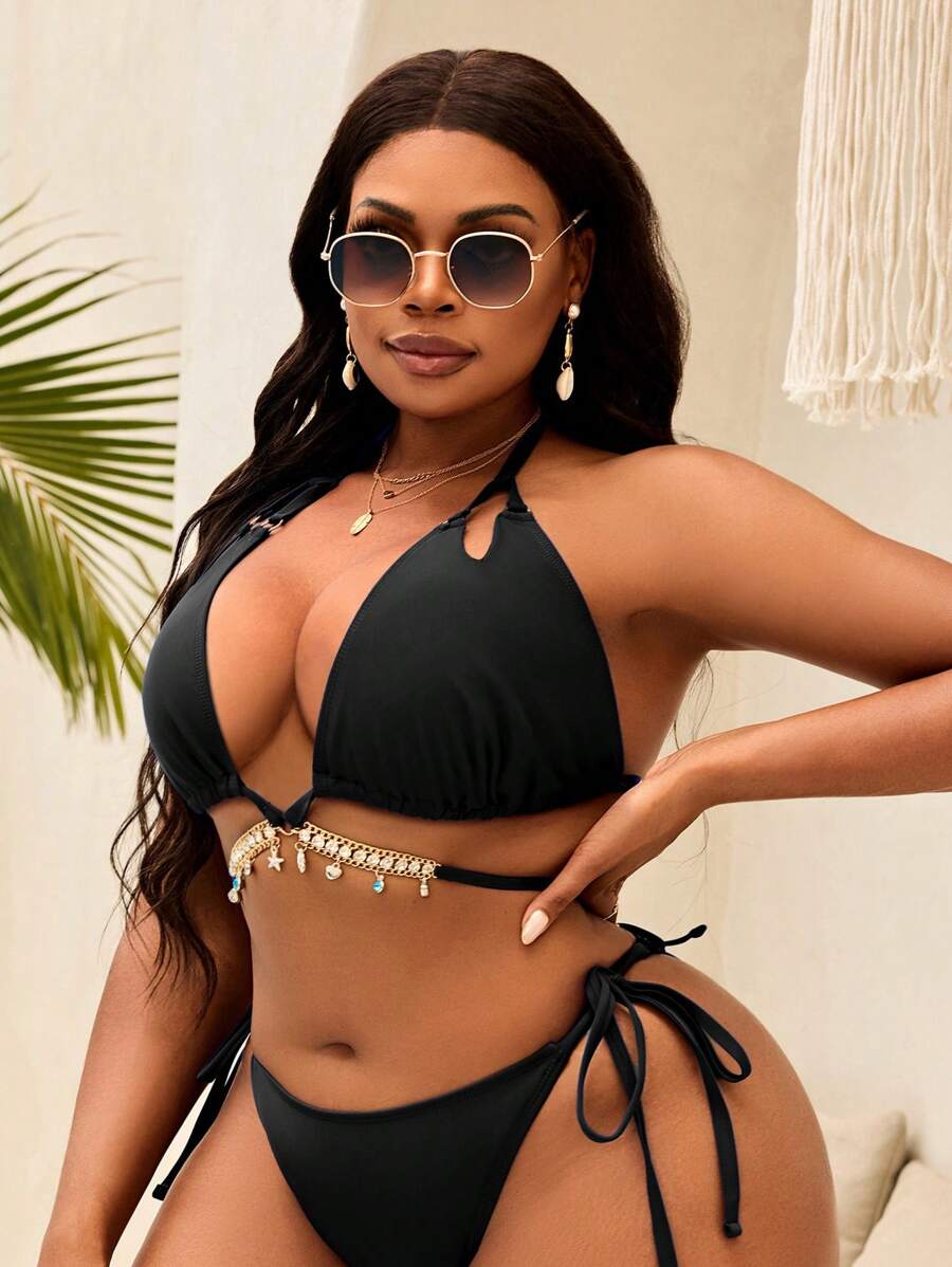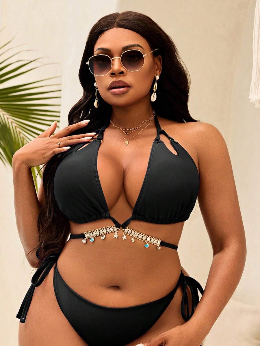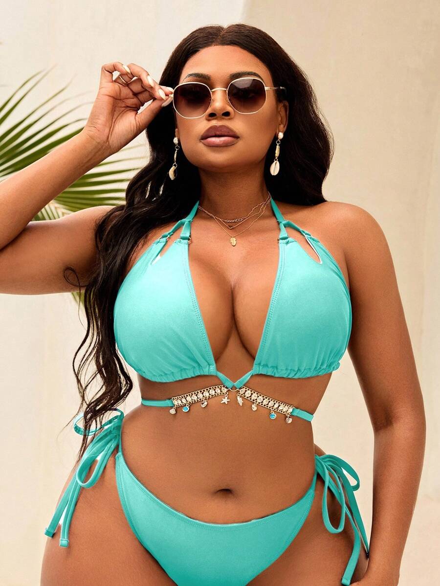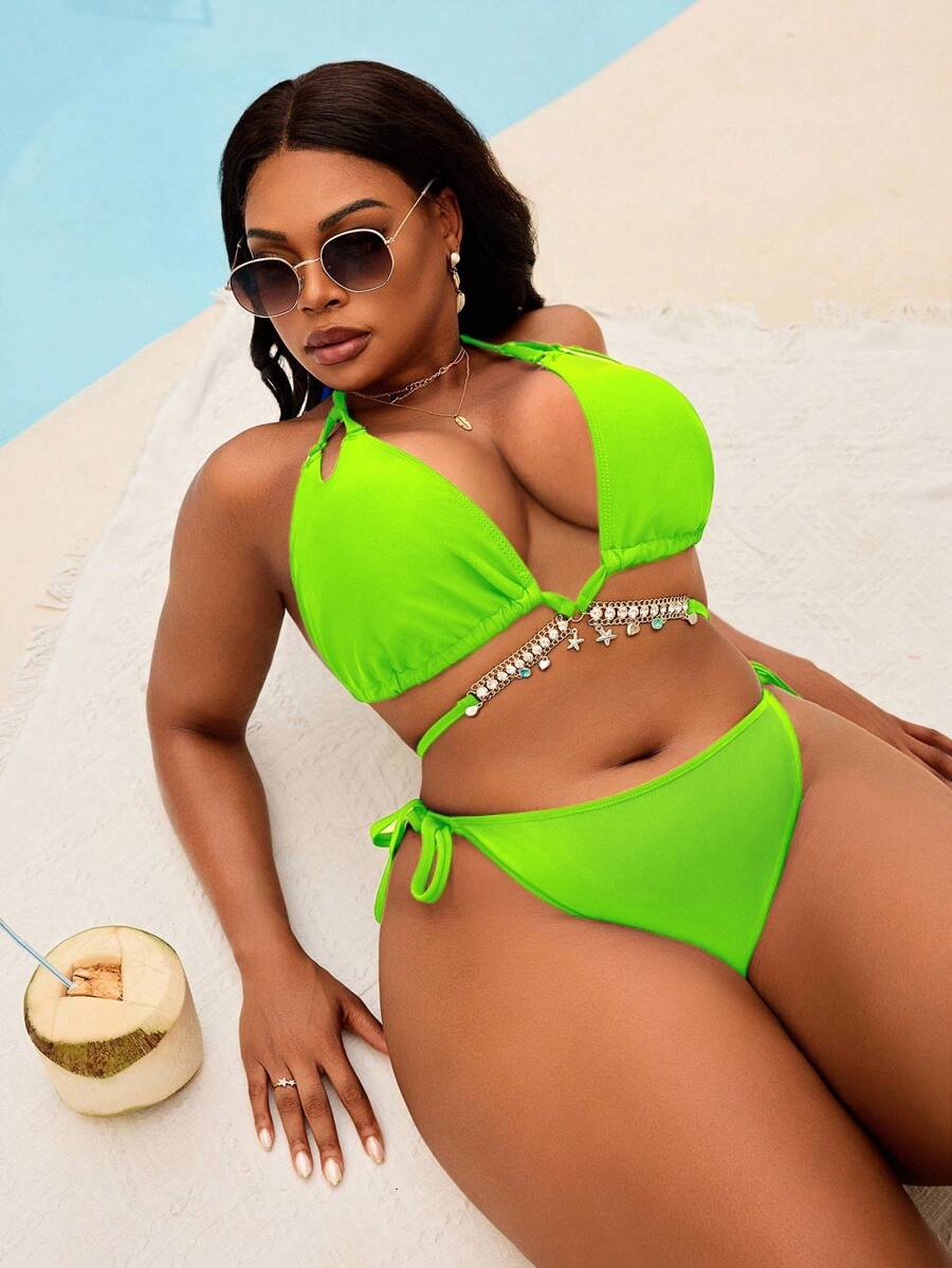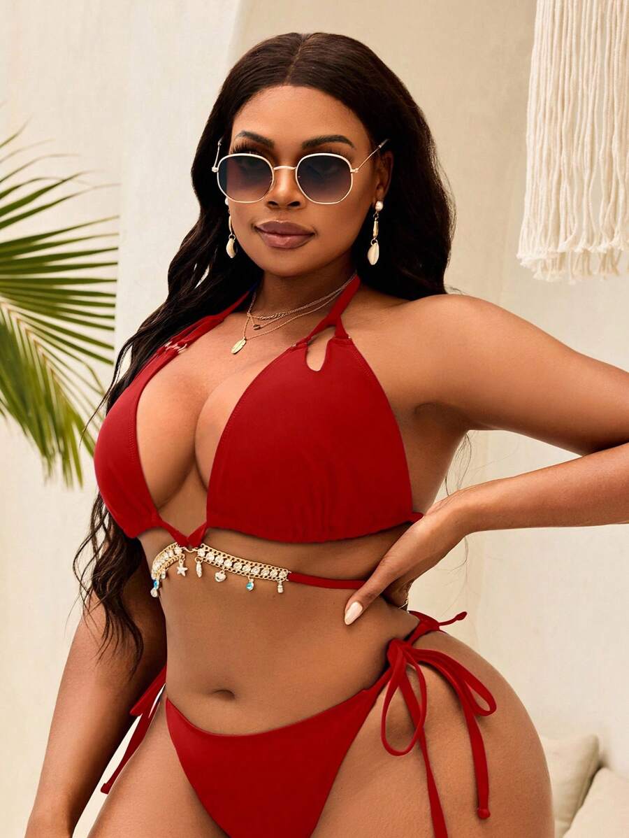 Top de bikini con tallas grandes de unicolor, de escote halter con atar, copa triangular y decoracion con cadena de cristal, traje de bano sexy de moda para vacaciones