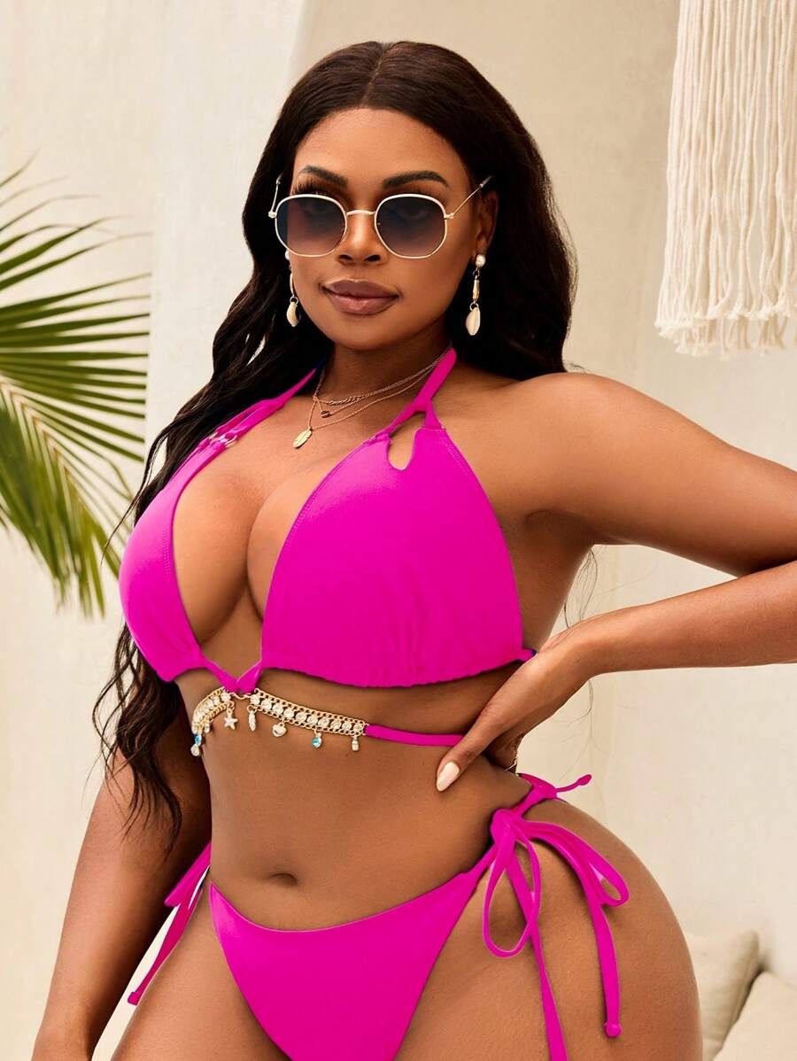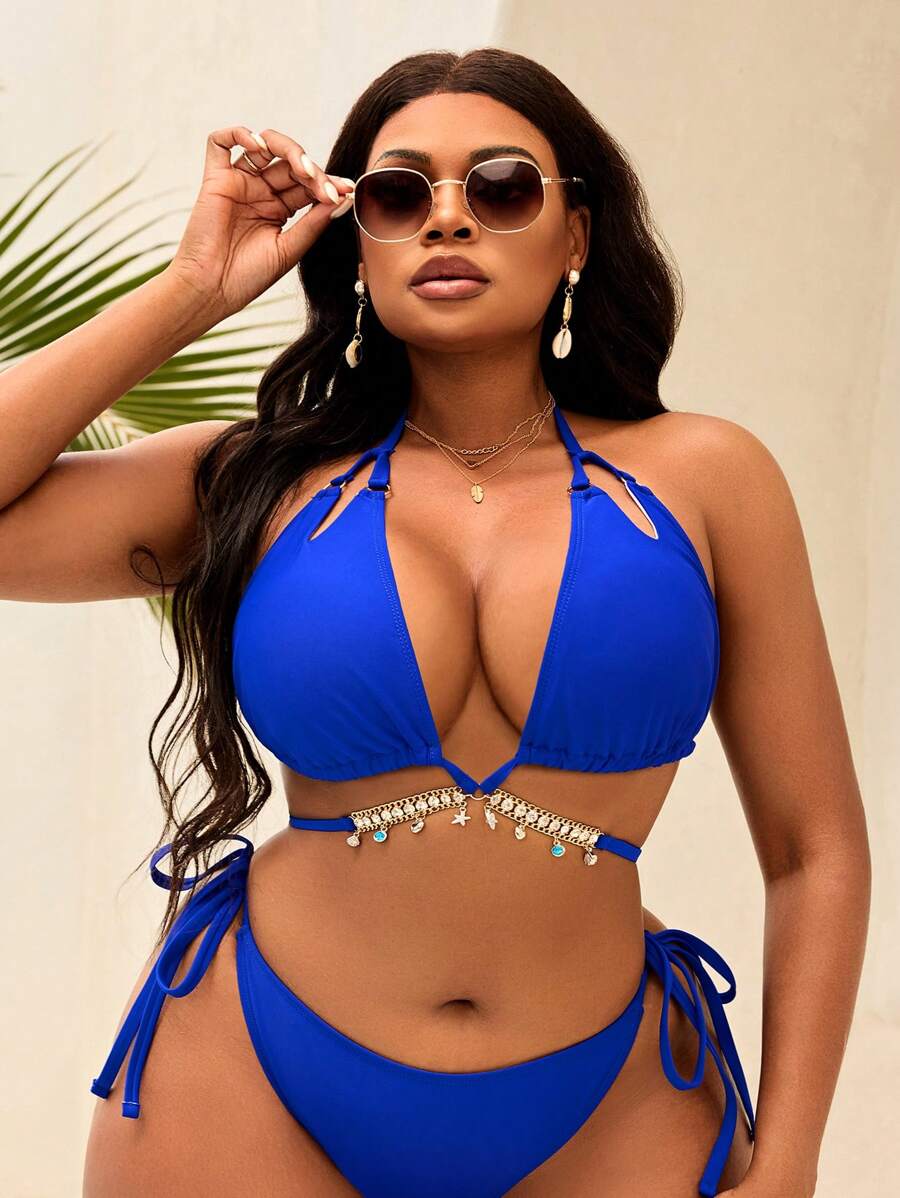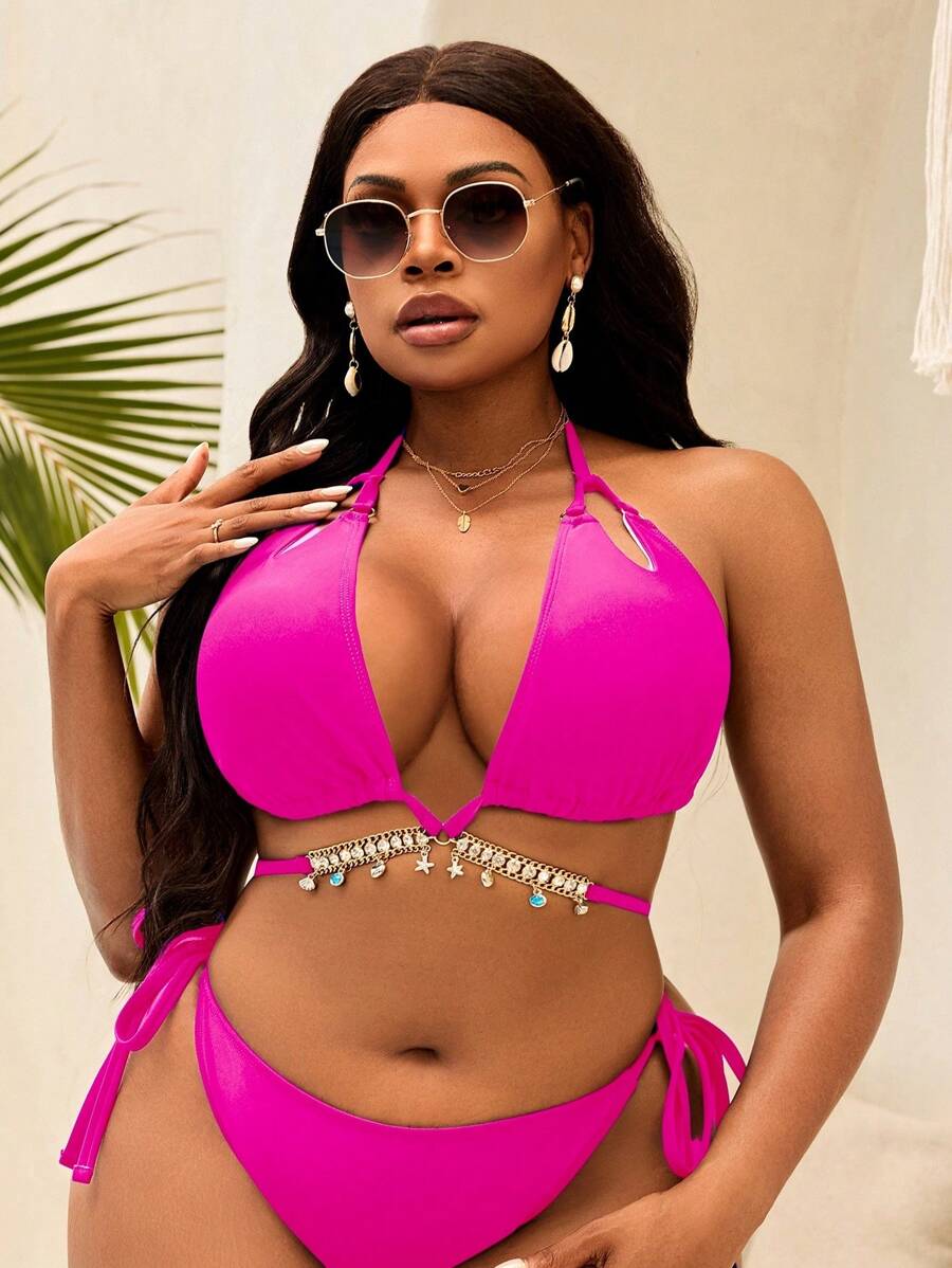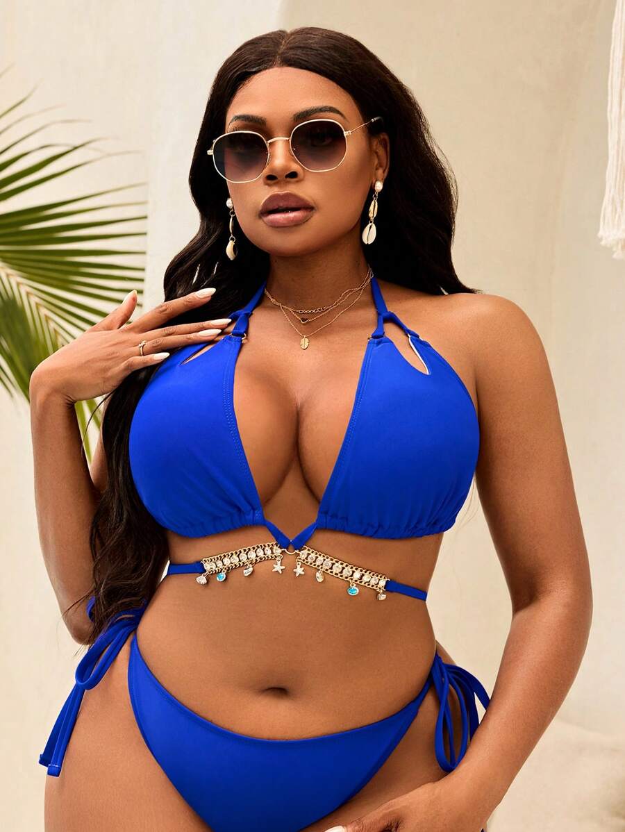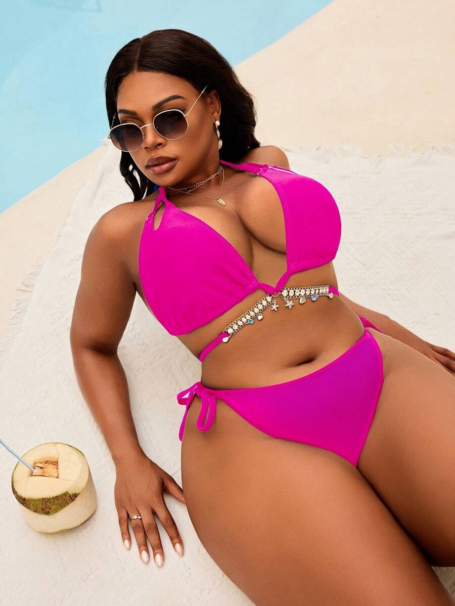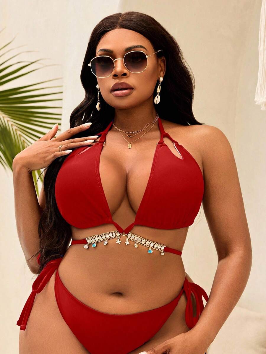 Top de bikini con tallas grandes de unicolor, de escote halter con atar, copa triangular y decoracion con cadena de cristal, traje de bano sexy de moda para vacaciones