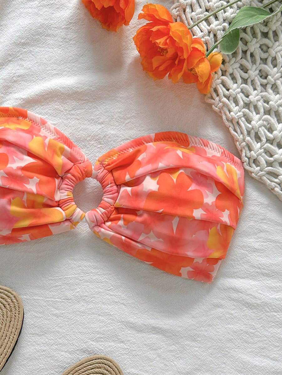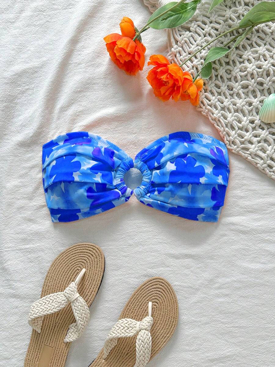Parte superior de bikini tipo brasier sin tirantes con estampado floral, fruncidos y decoracion de anillo para mujer