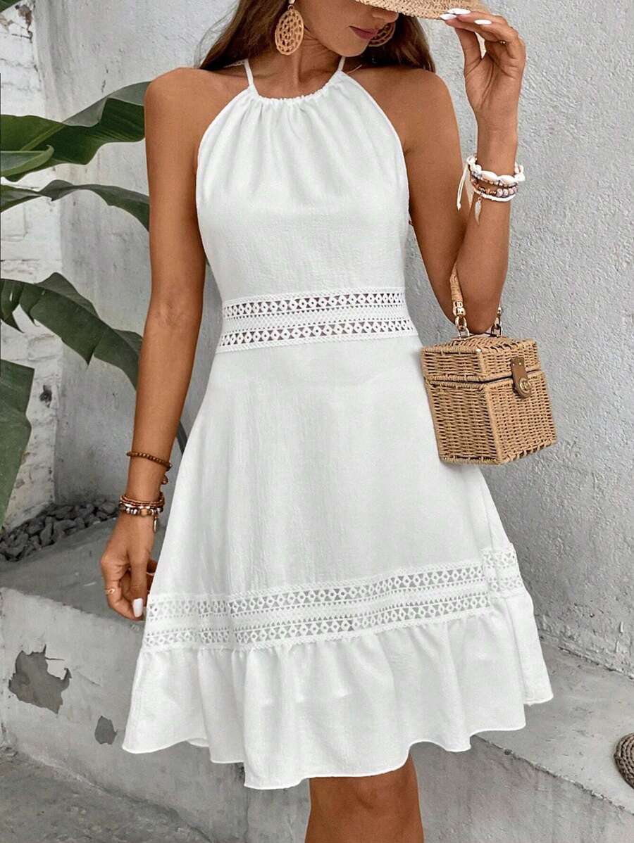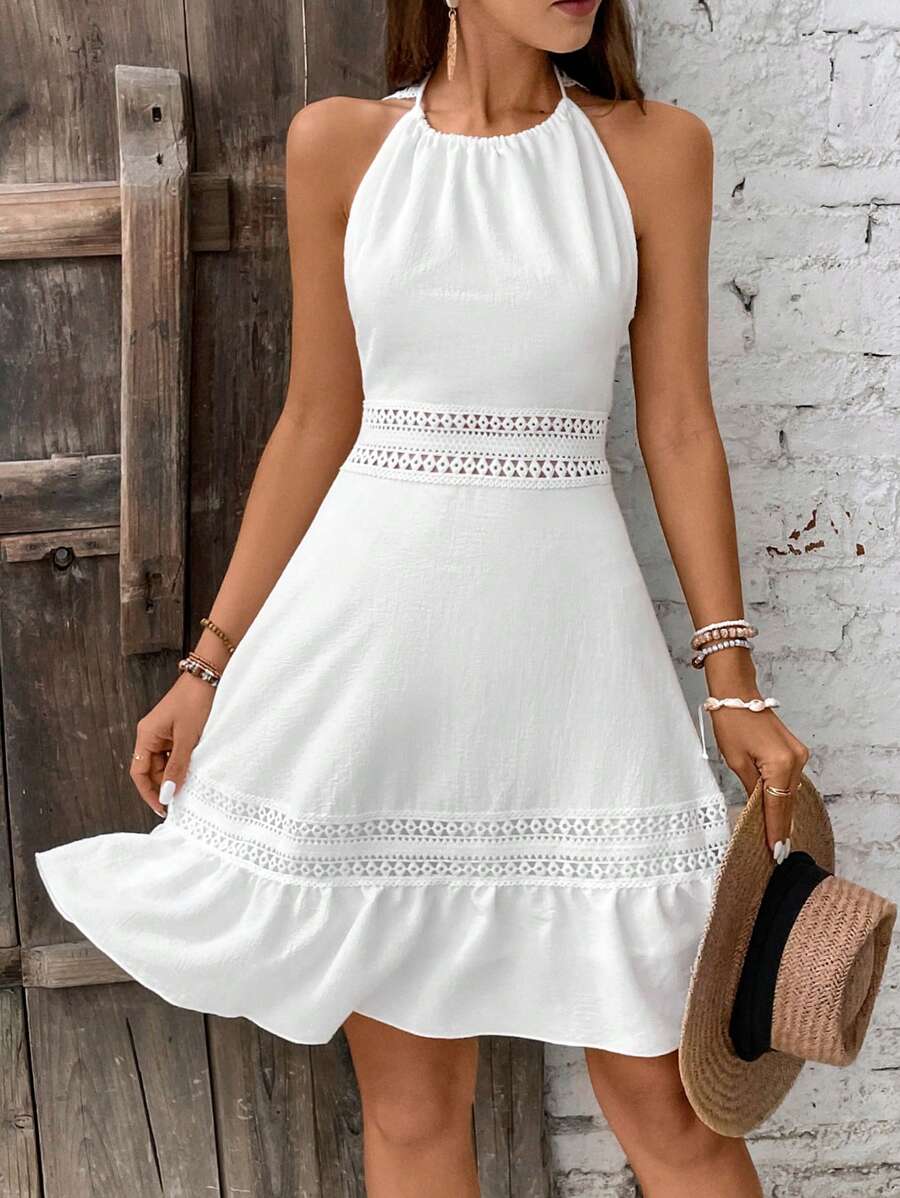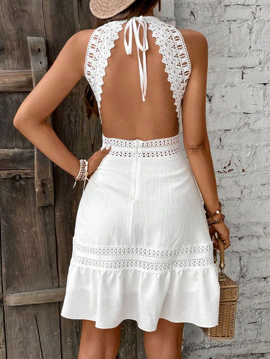 Vestido con bajo asimetrico y espalda descubierta con detalles de encaje soluble, vestido sexy de mujer con espalda descubierta, encaje de contraste, bajo con volantes sin mangas de cuello halter de ajuste regular corto color caqui liso en