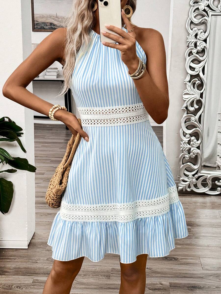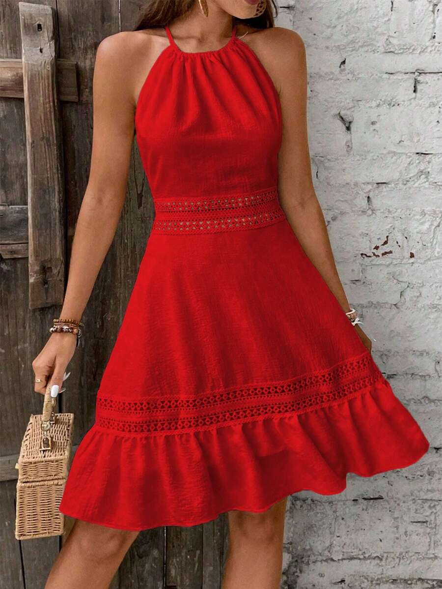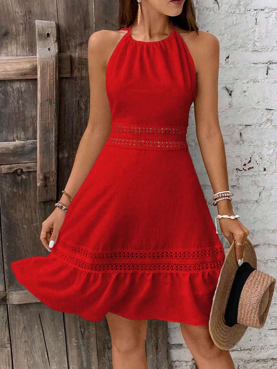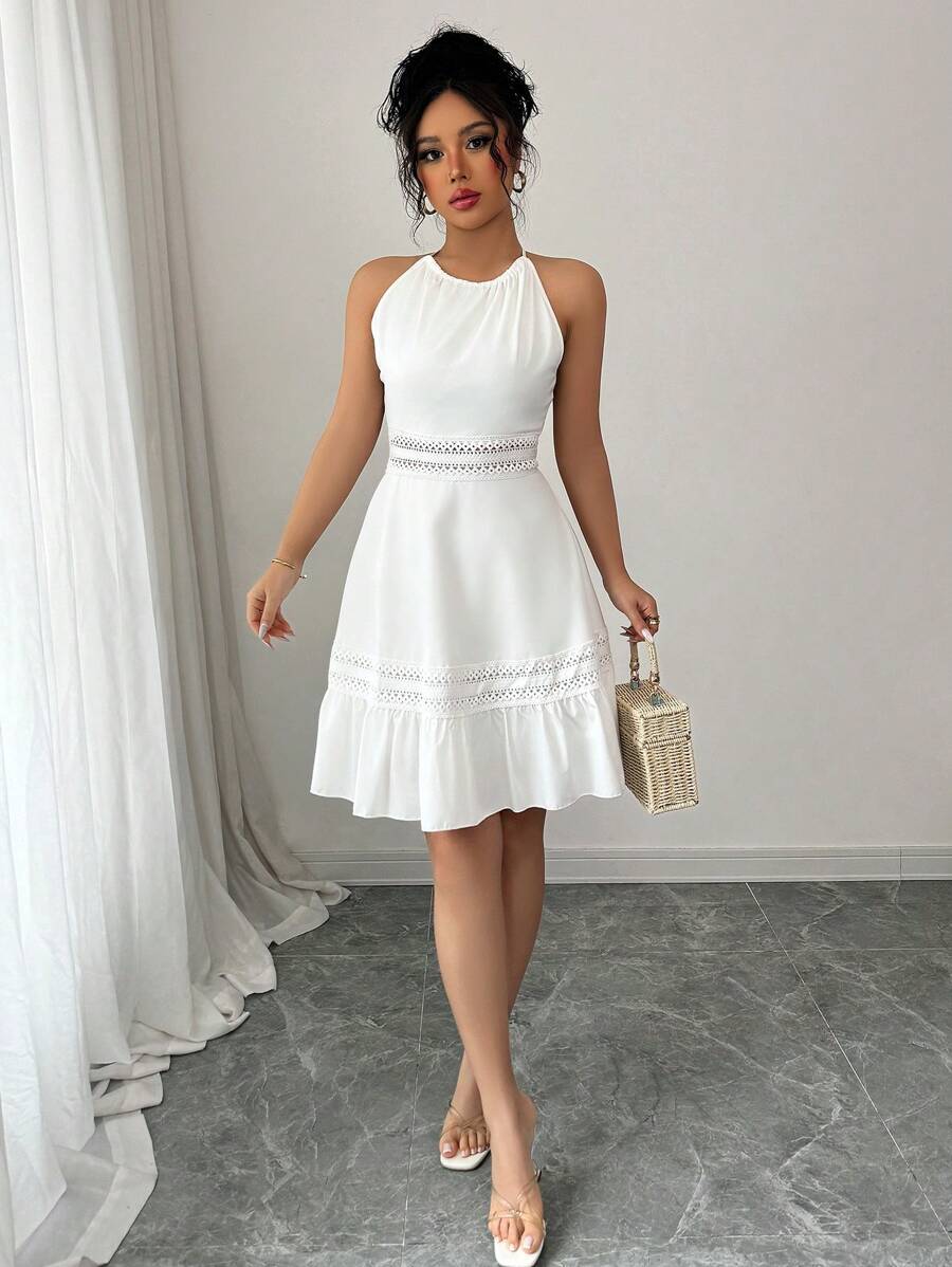 Vestido con bajo asimetrico y espalda descubierta con detalles de encaje soluble, vestido sexy de mujer con espalda descubierta, encaje de contraste, bajo con volantes sin mangas de cuello halter de ajuste regular corto color caqui liso en