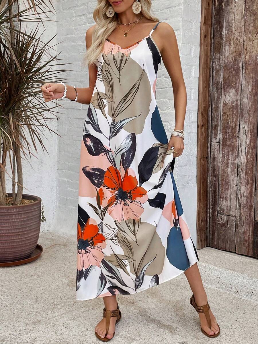Vestido largo de tirantes de mujer con estampado floral y de plantas para vacaciones casual