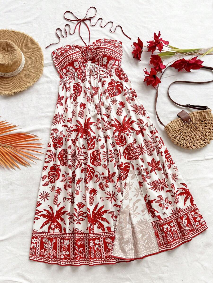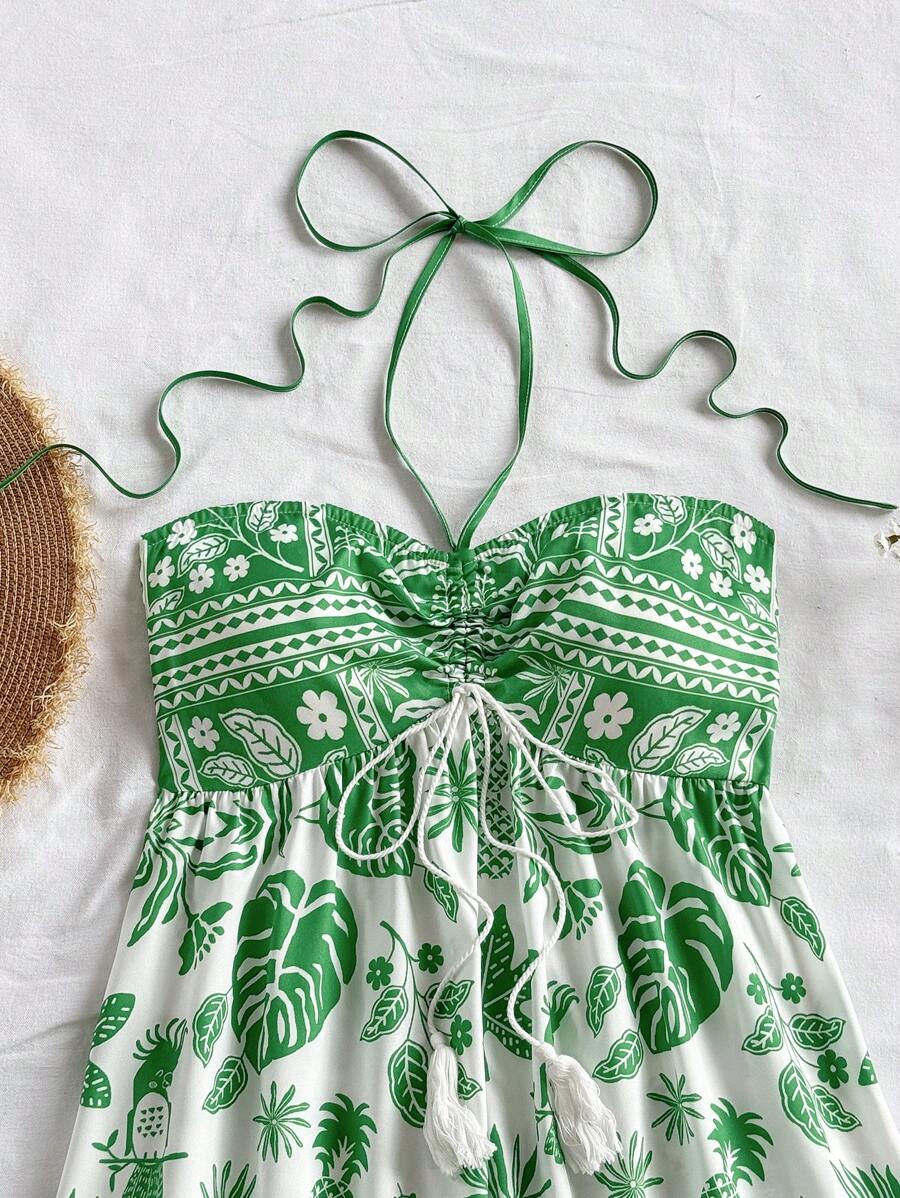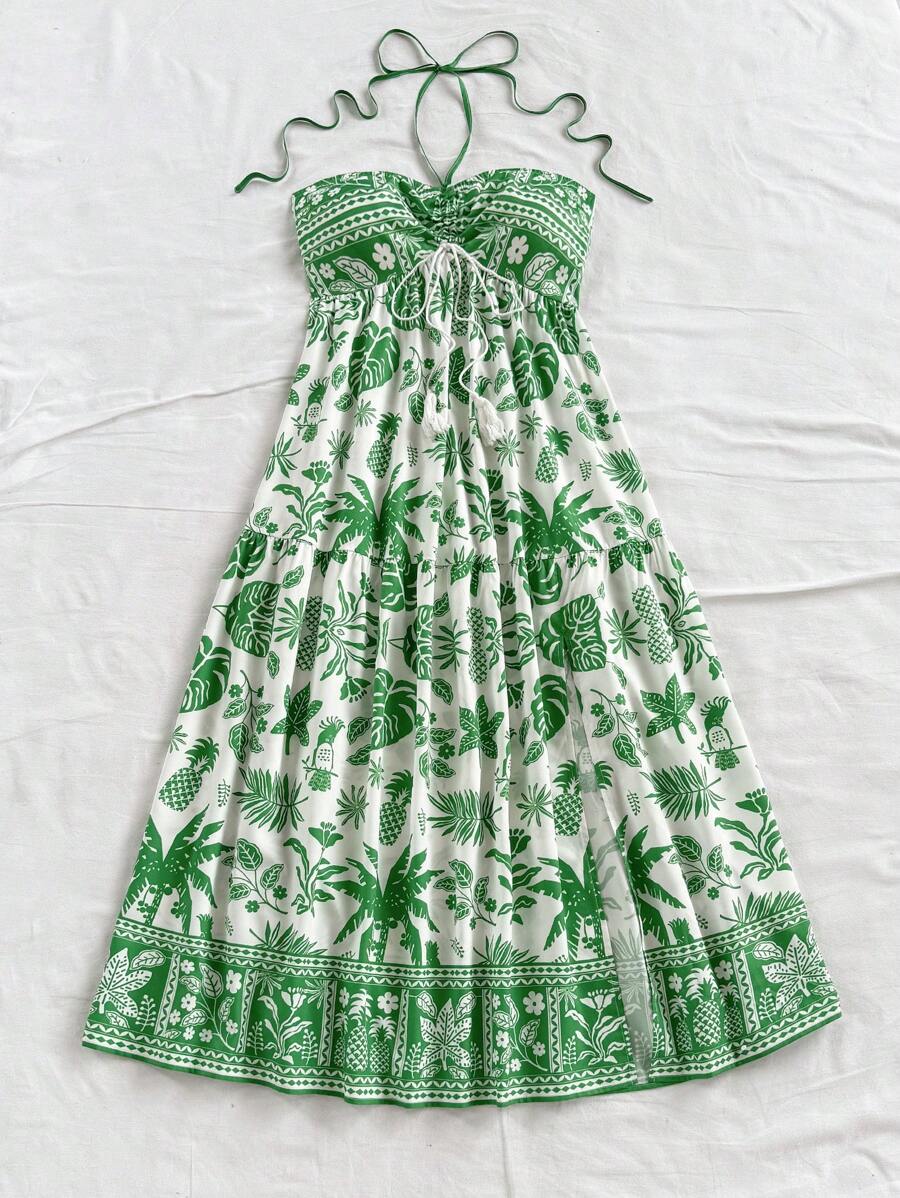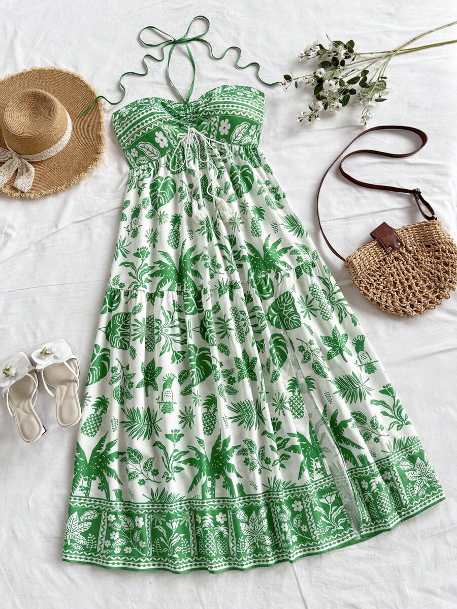 Vestido halter con estampado de plantas tropicales para vacaciones de – Muy Bonita
