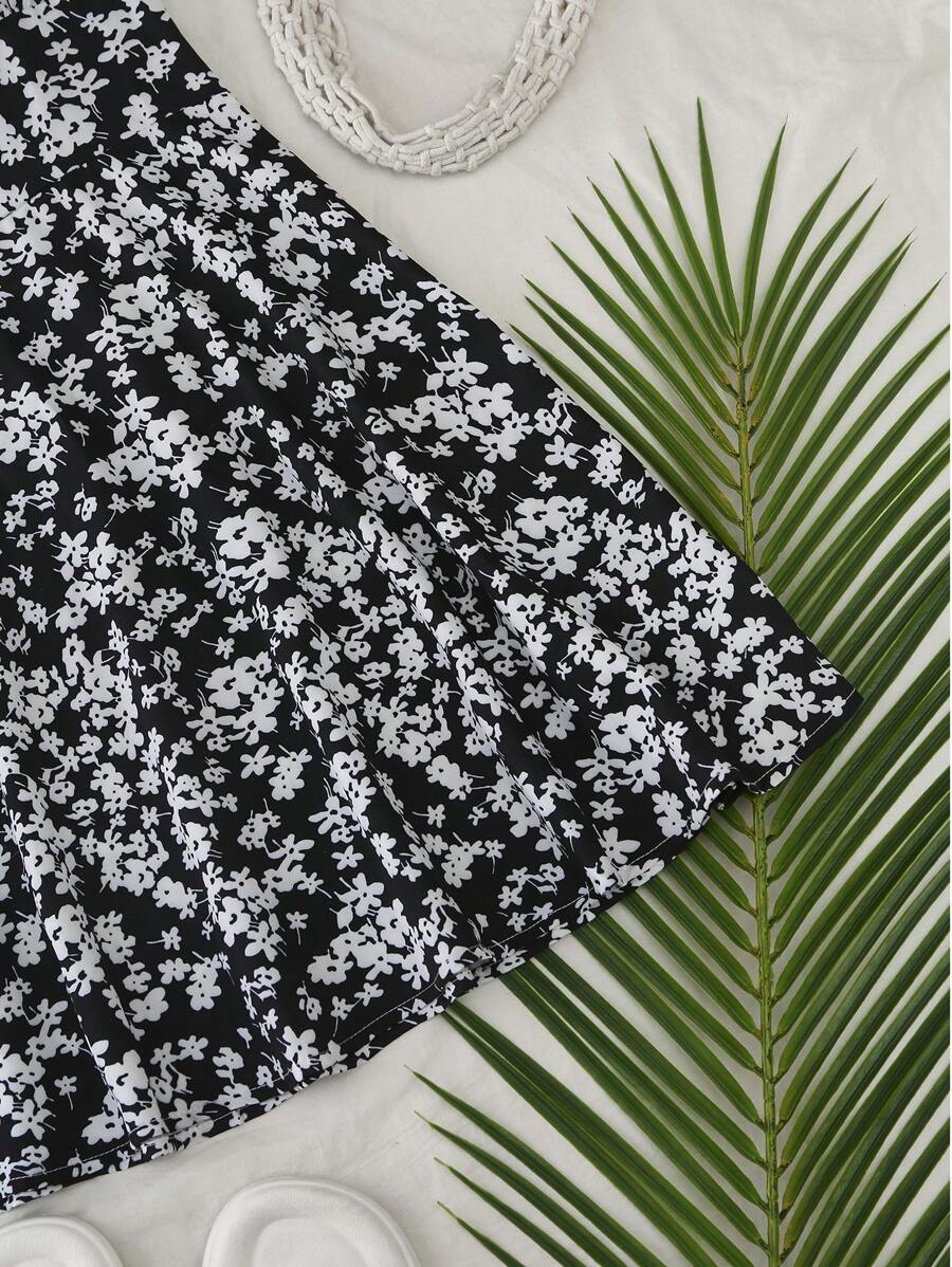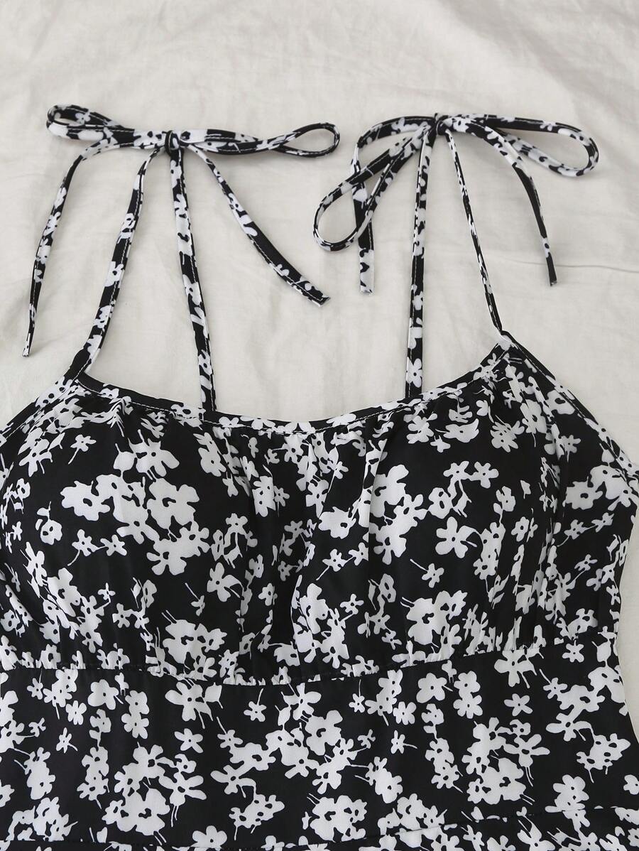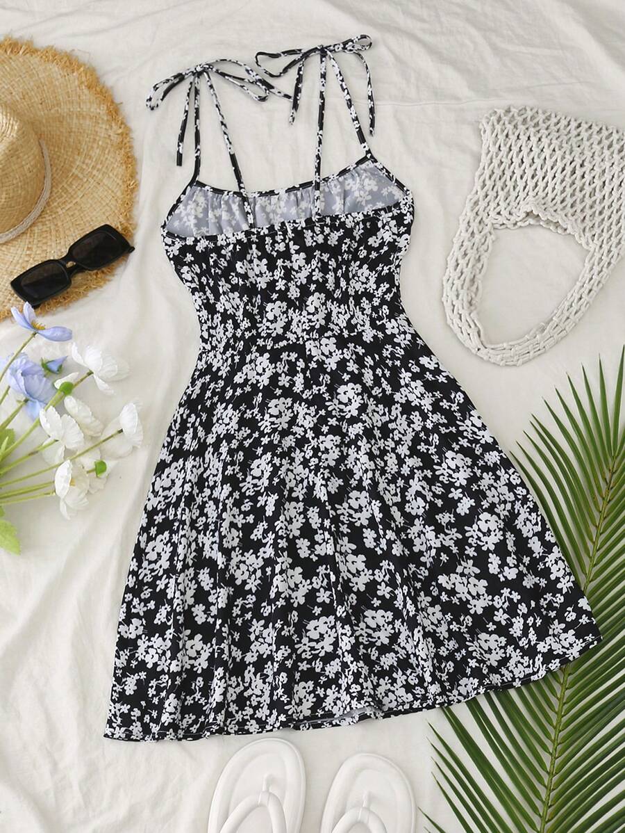 Vestido mini de mujer con tirantes finos y cordones, con estampado floral diminuto