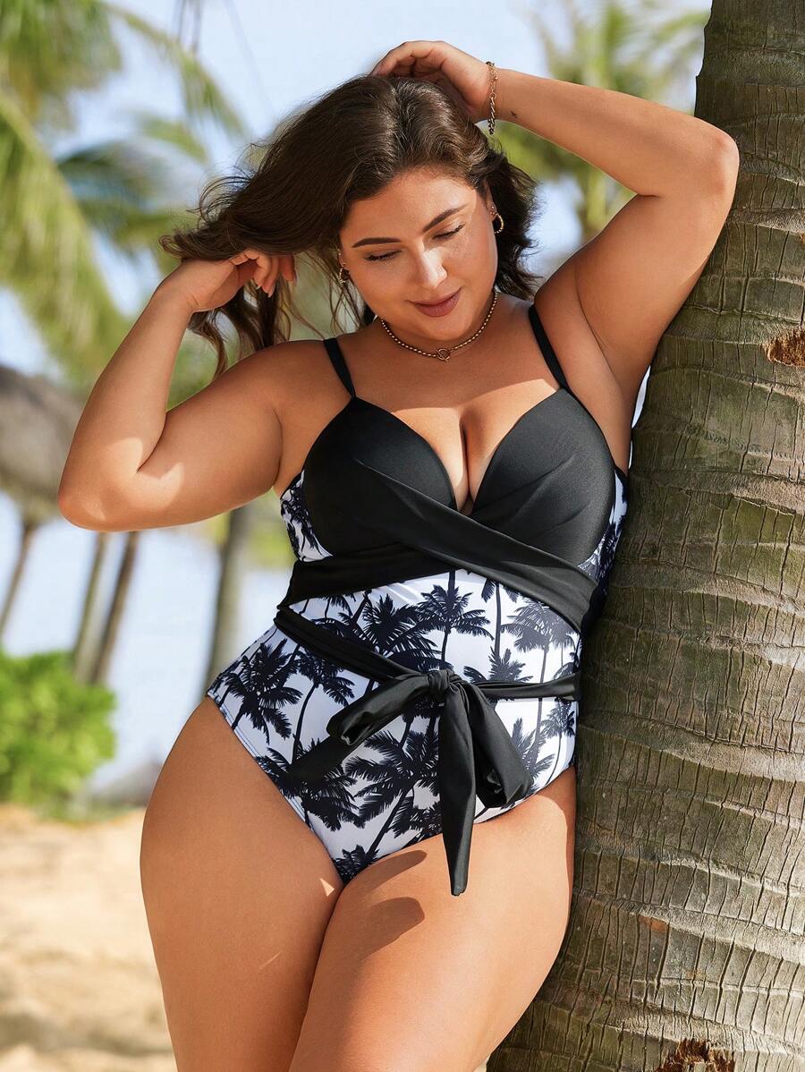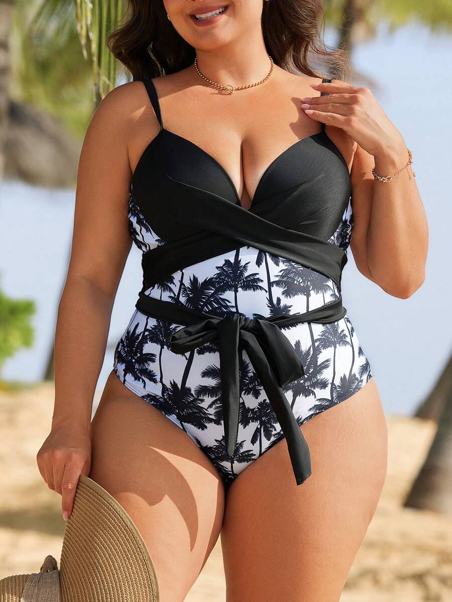 Curve traje de bano de una pieza con tirantes de espagueti, estampado floral, soporte y aros para mujer de talla grande para playa de verano