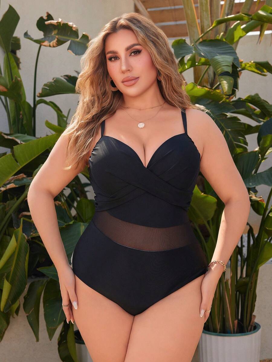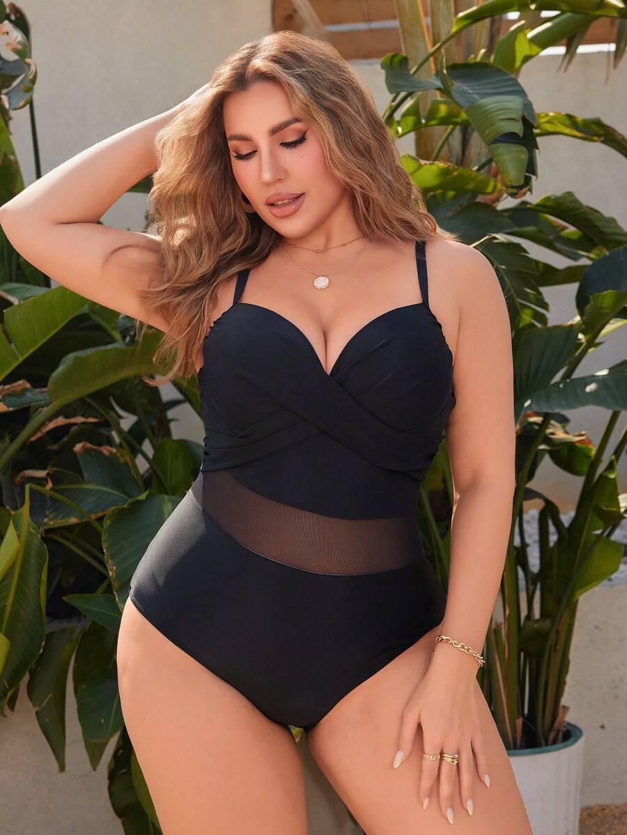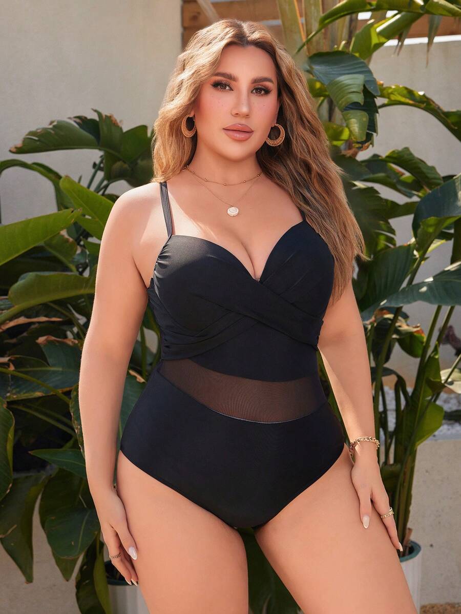 Curve traje de bano de una pieza con tirantes cruzados y copa moldeada para mujer de talla grande, con seccion media de malla transparente, diseno minimalista y casual, para vacaciones de verano en la playa