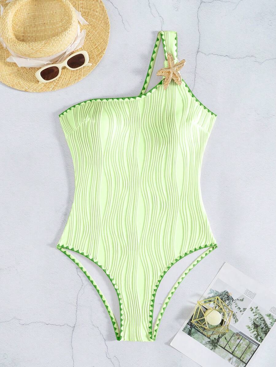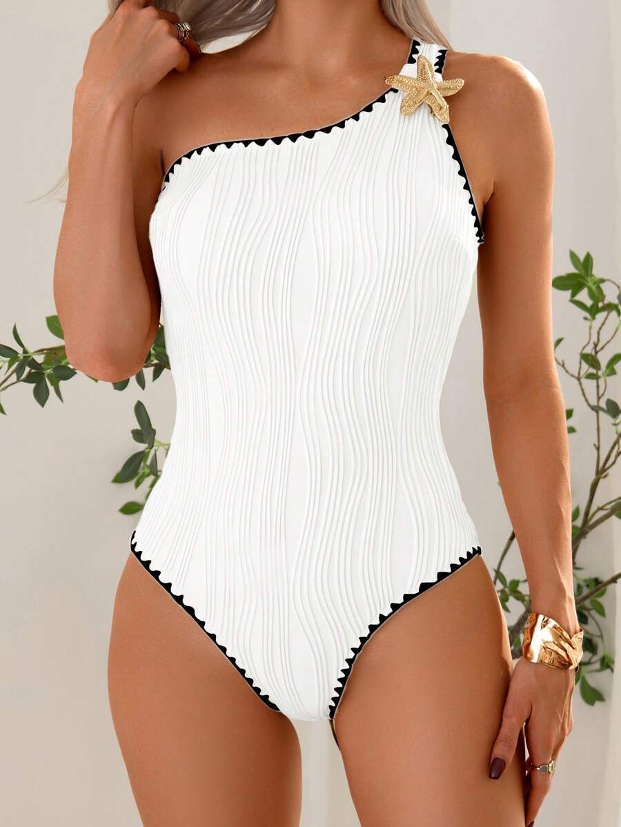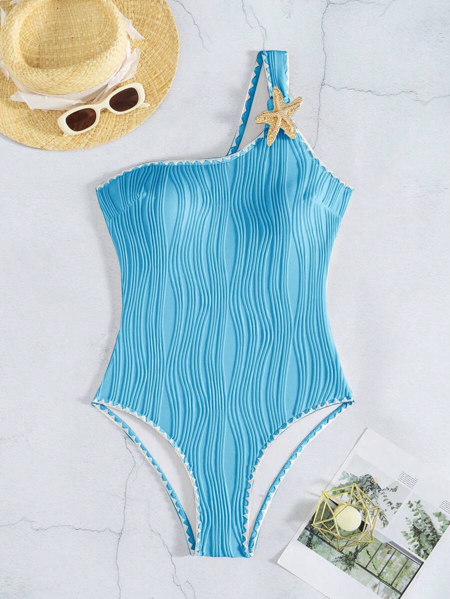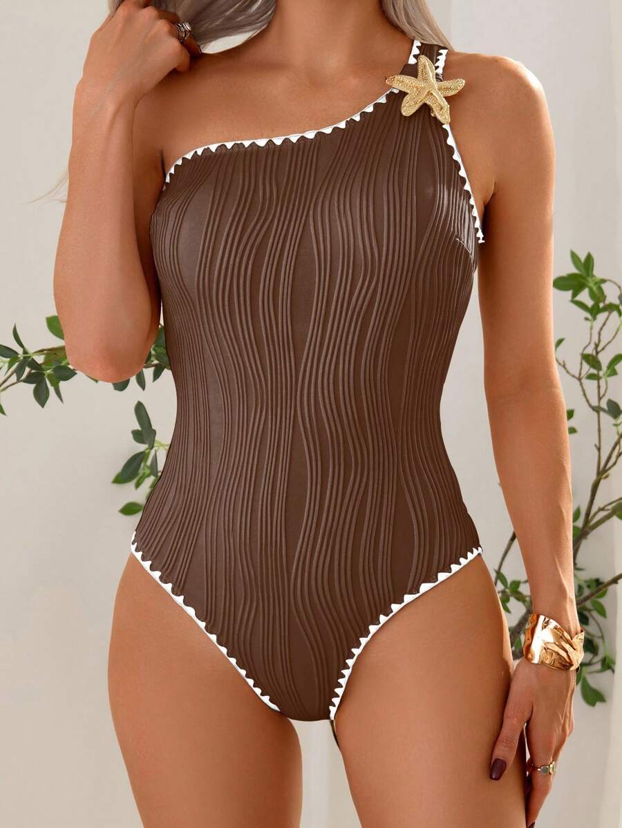 Traje de bano de una sola pieza sexy para mujer, de un solo hombro, con decoracion de concha y estrella de mar, traje de bano ajustado para vacaciones en la playa