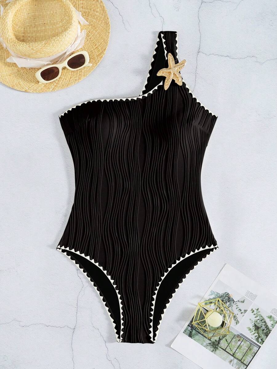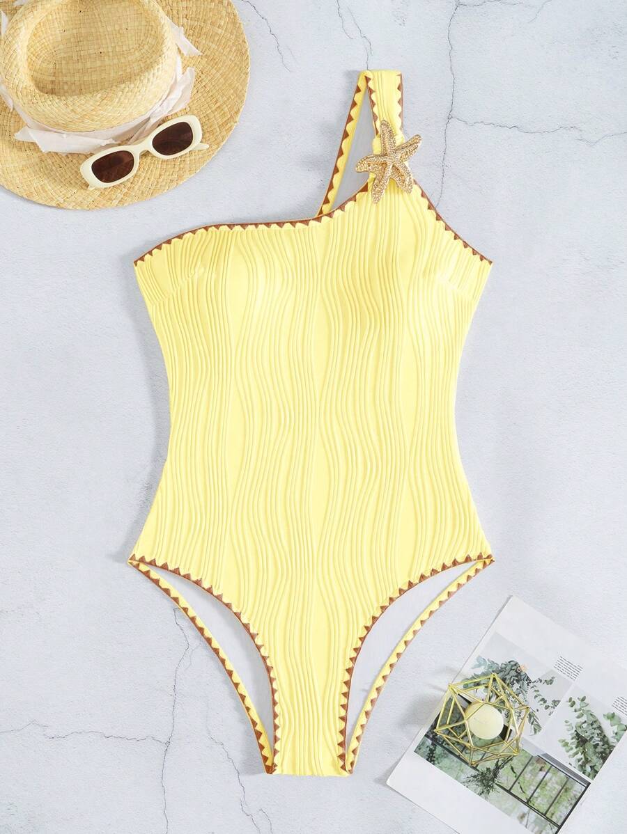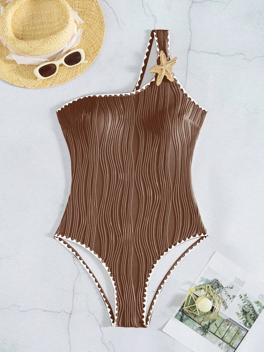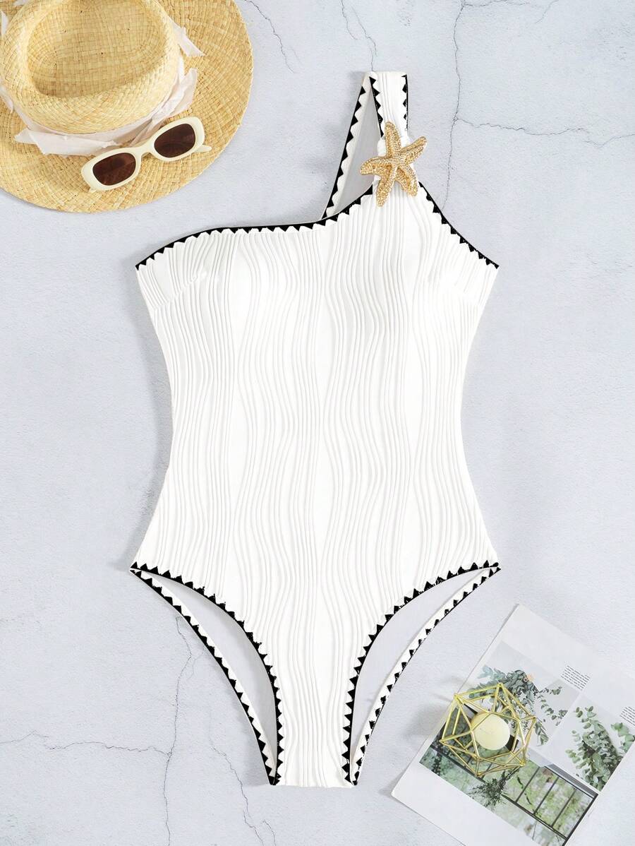 Traje de bano de una sola pieza sexy para mujer, de un solo hombro, con decoracion de concha y estrella de mar, traje de bano ajustado para vacaciones en la playa