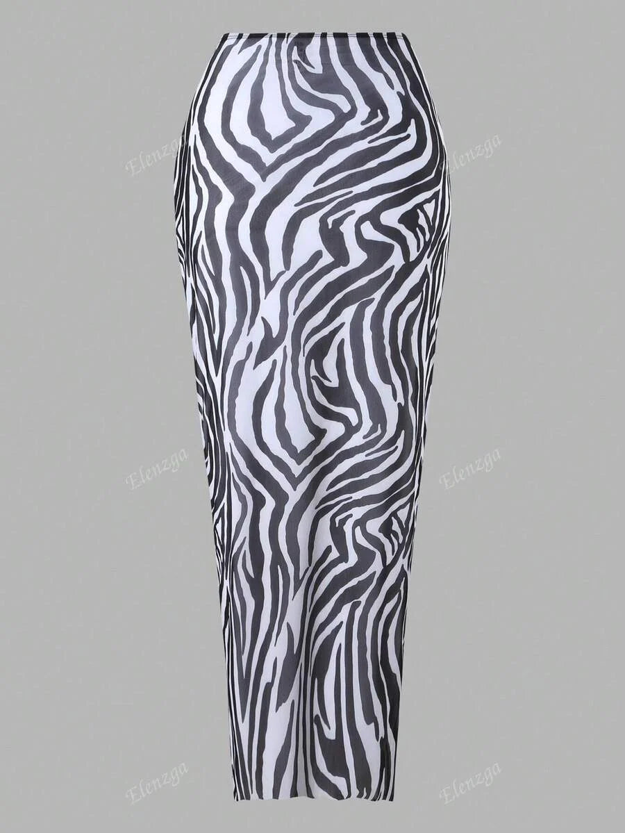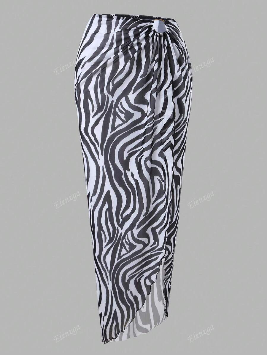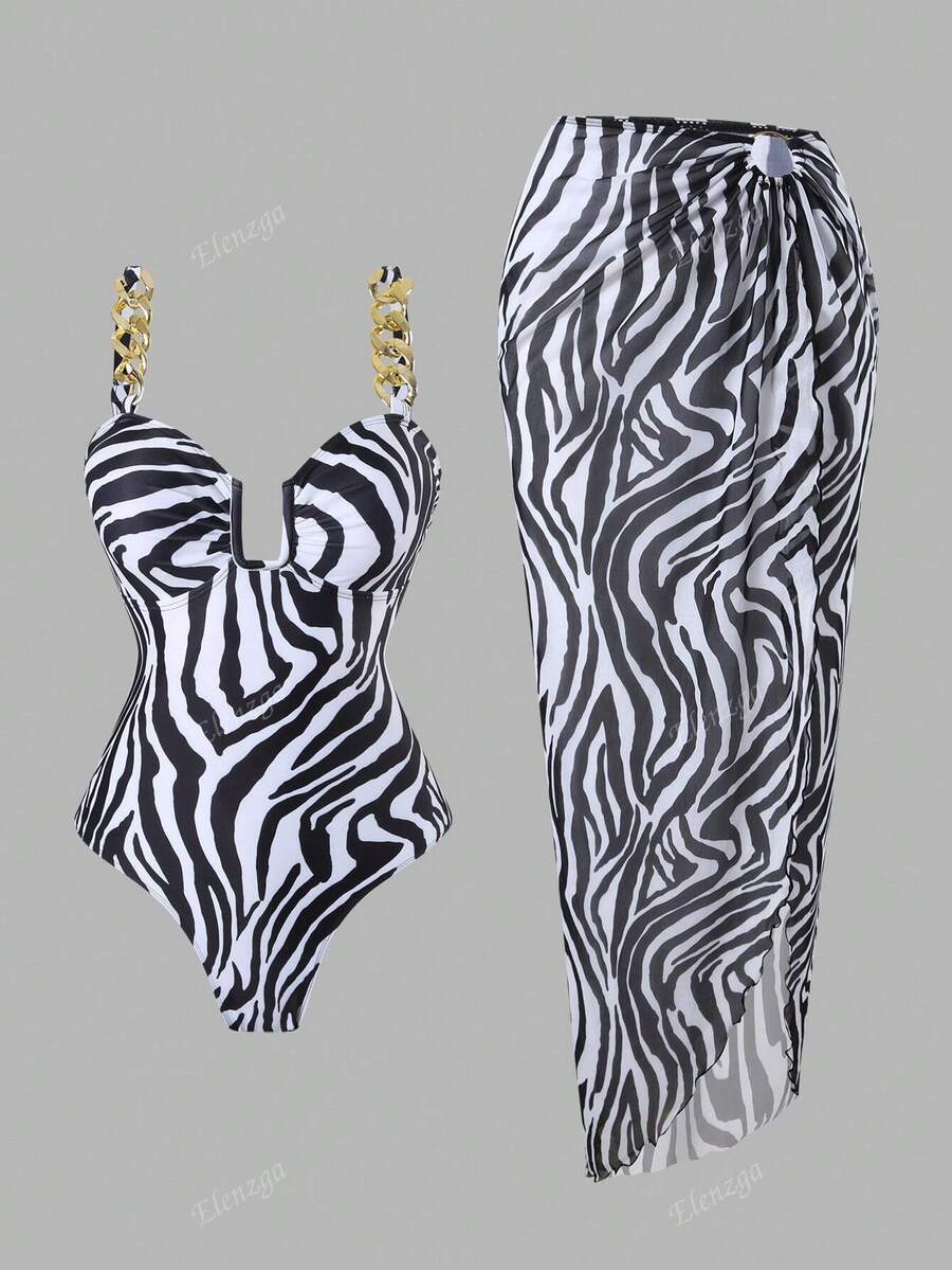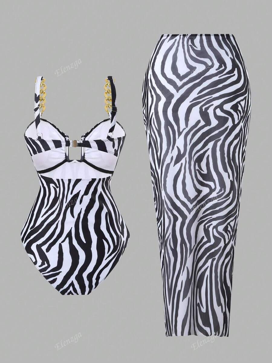 Traje de bano de una pieza con estampado de cebra y detalles de cadena metalica para mujer, combinado con falda de malla, elegante para usar en la playa