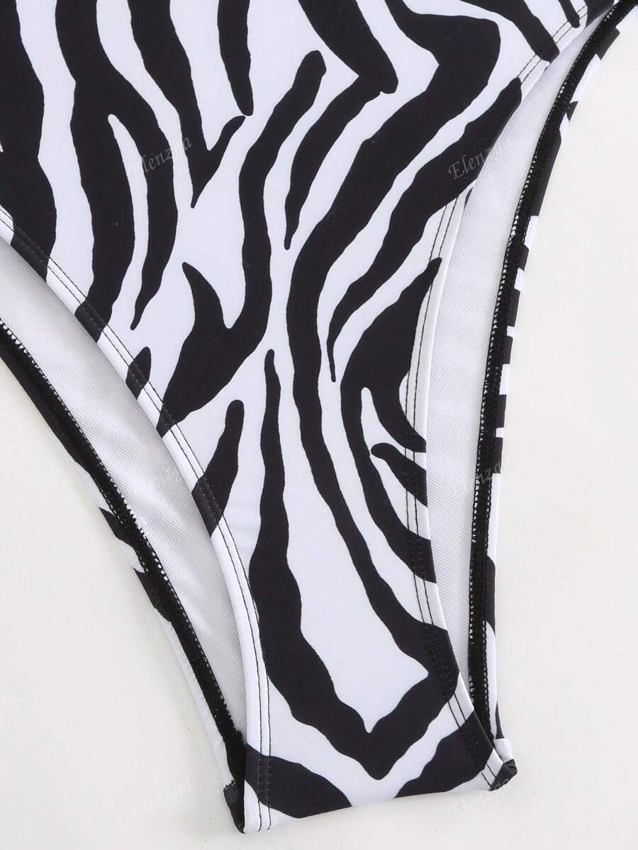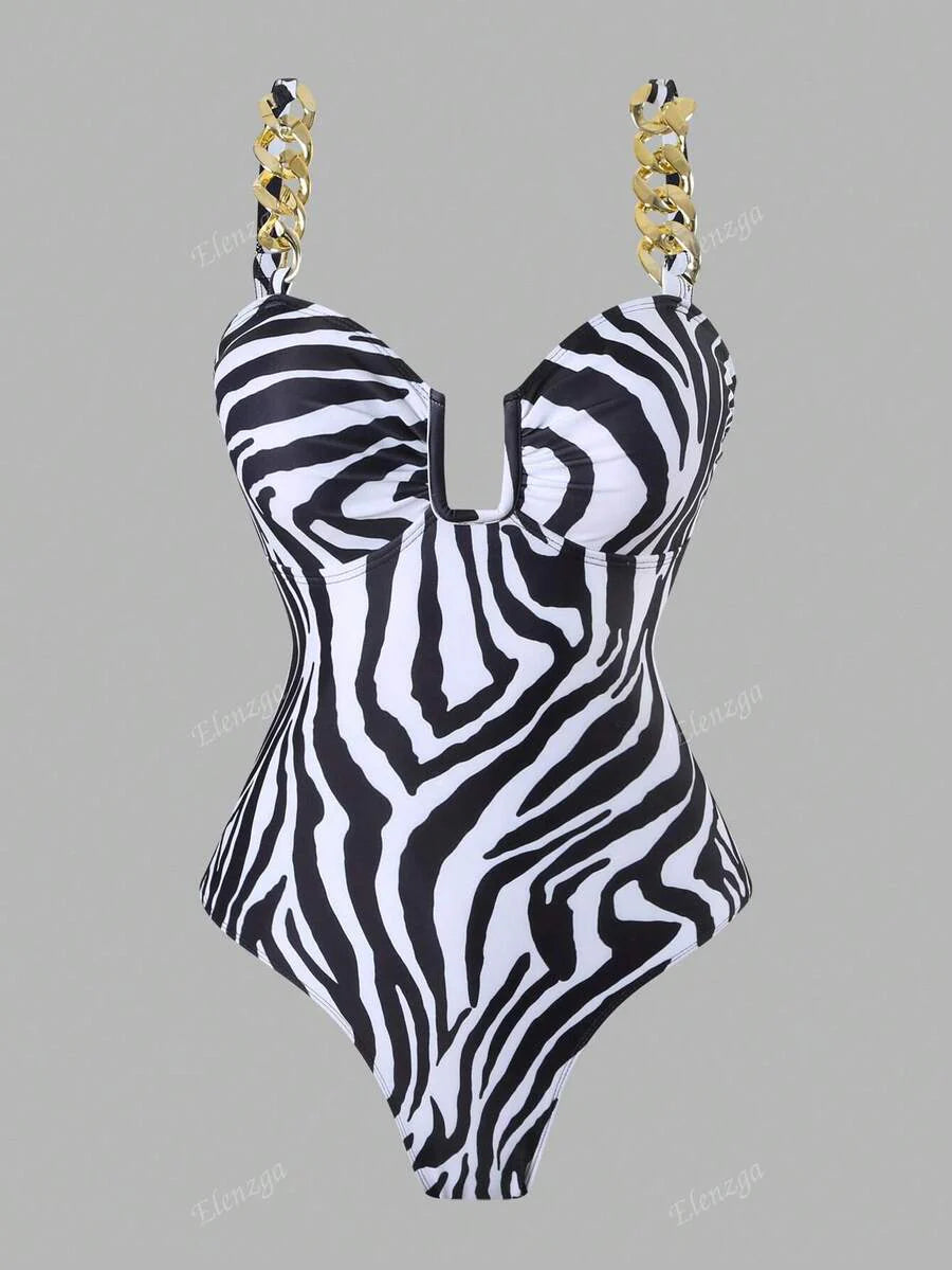 Traje de bano de una pieza con estampado de cebra y detalles de cadena – Muy Bonita