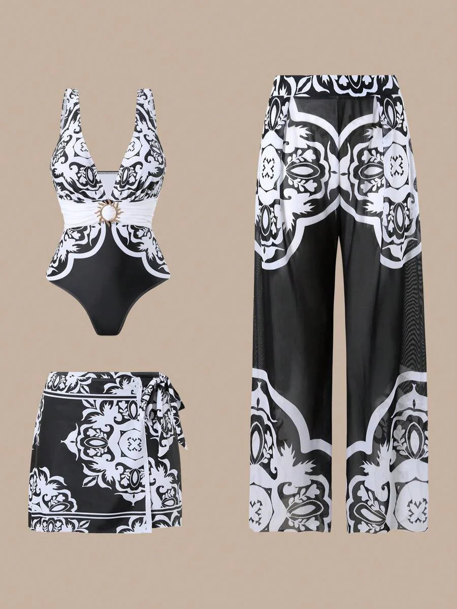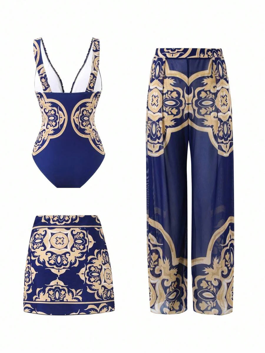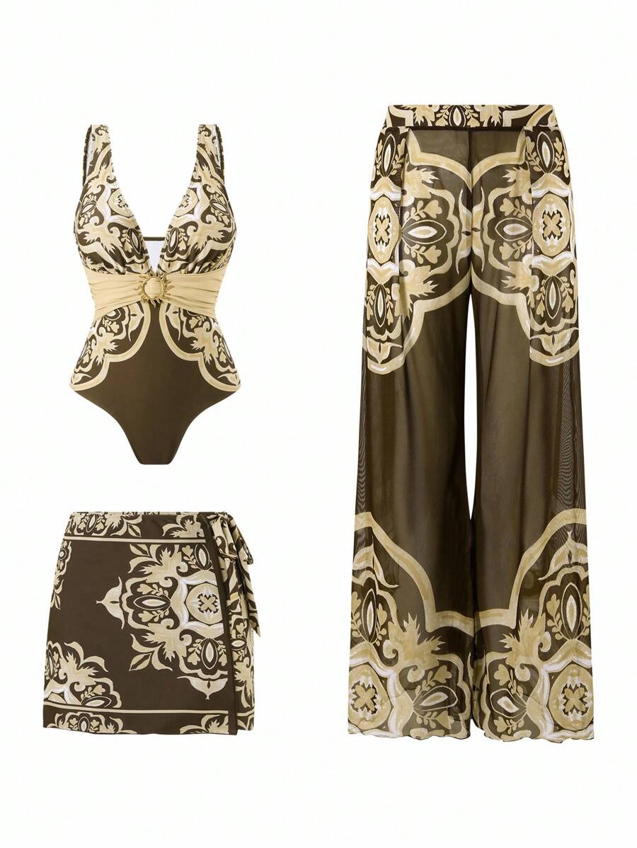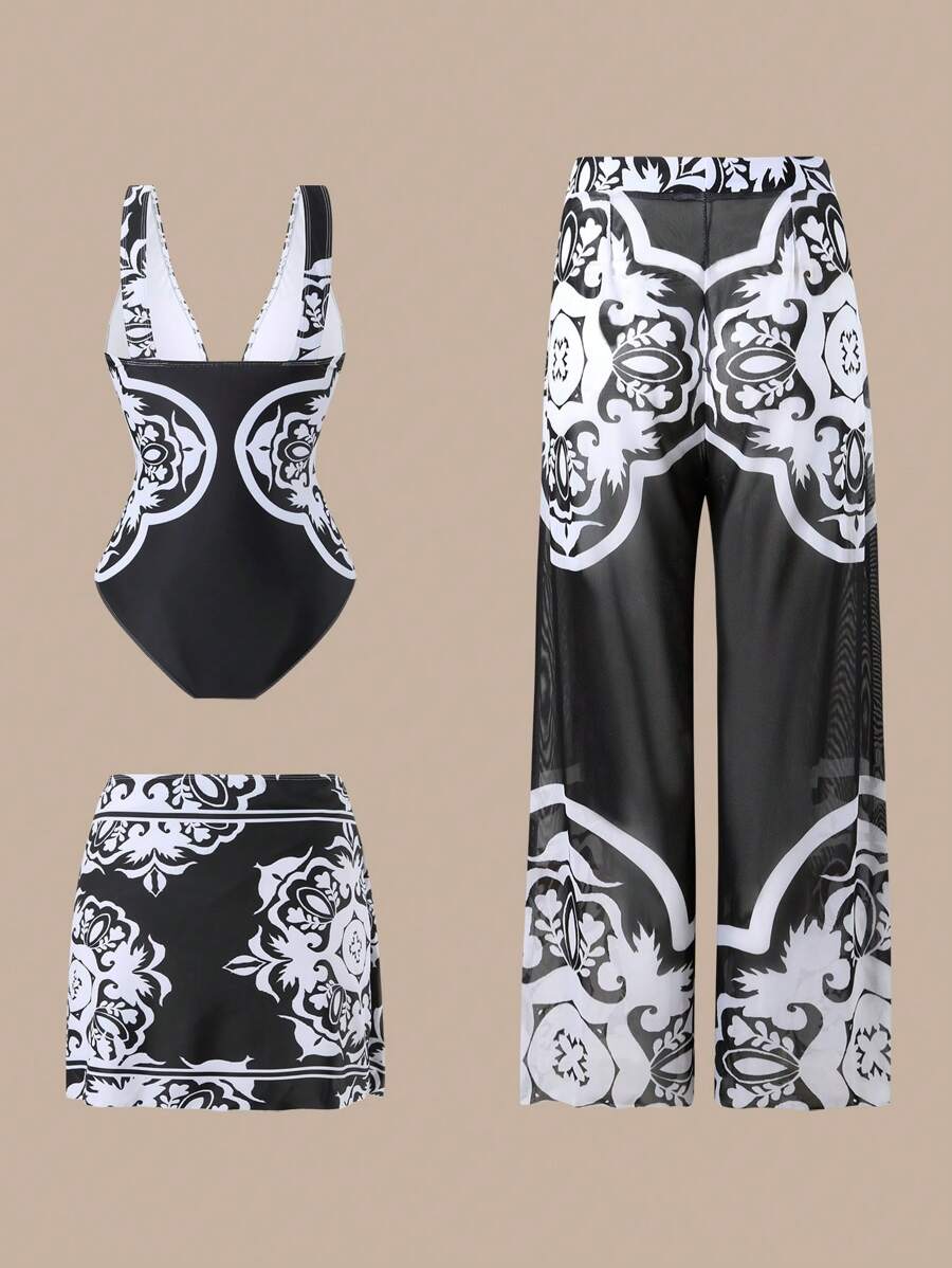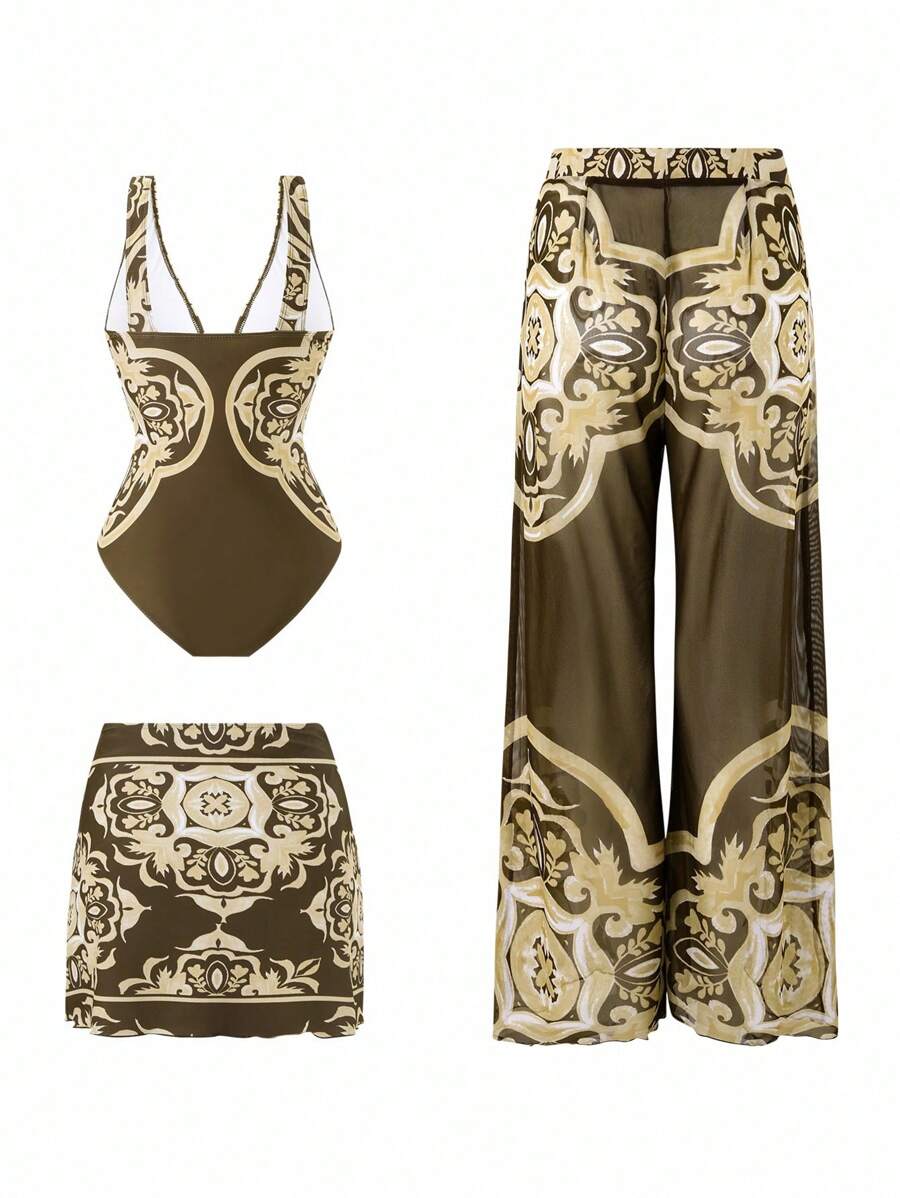 Oasis conjunto de 3 piezas 2025 nuevo: enterizo estampado con falda y pantalones de malla para mujer, conjunto de vacaciones de playa casual de verano