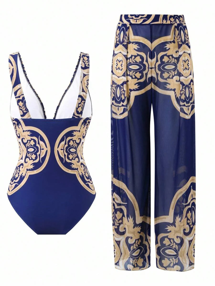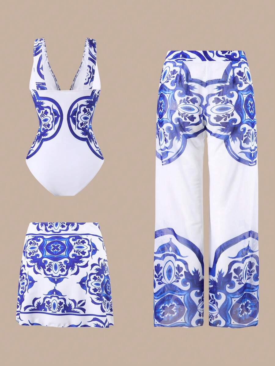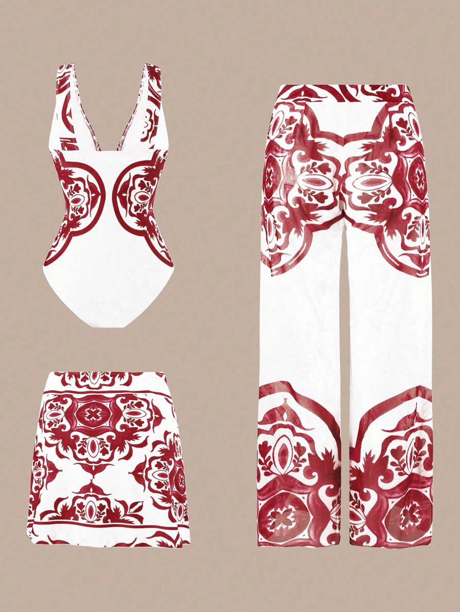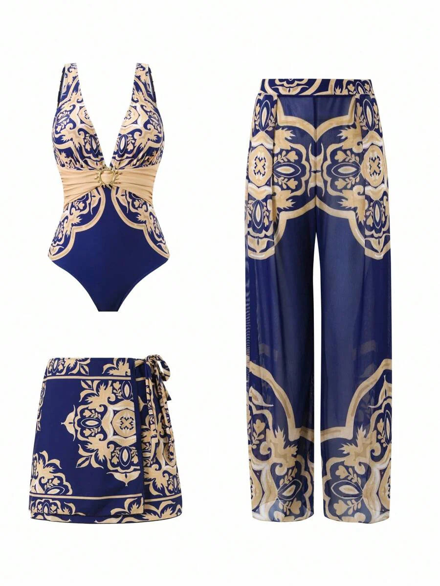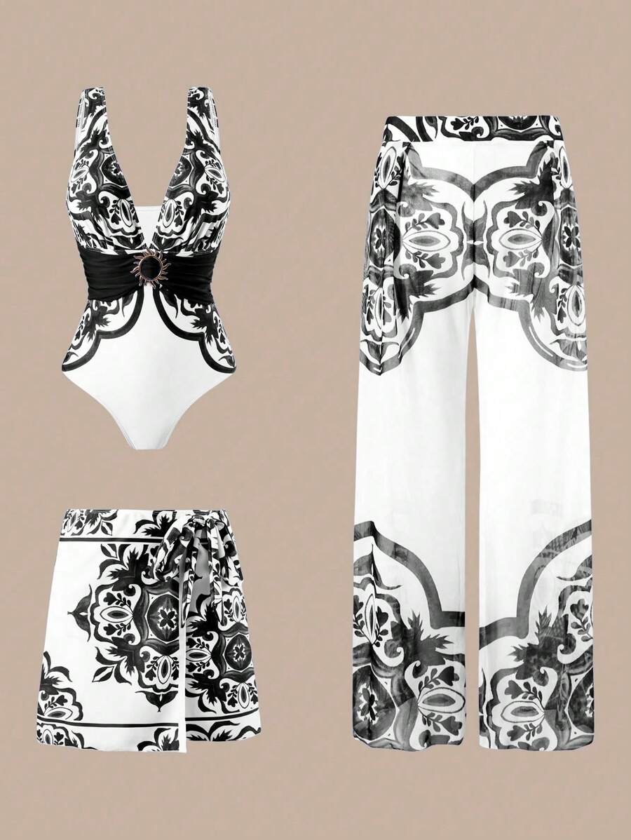 Oasis conjunto de 3 piezas 2025 nuevo: enterizo estampado con falda y pantalones de malla para mujer, conjunto de vacaciones de playa casual de verano
