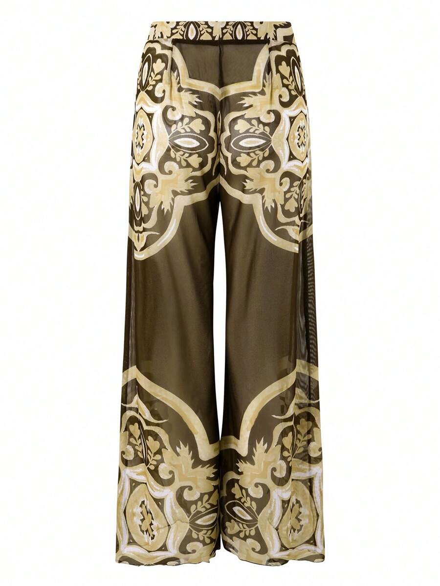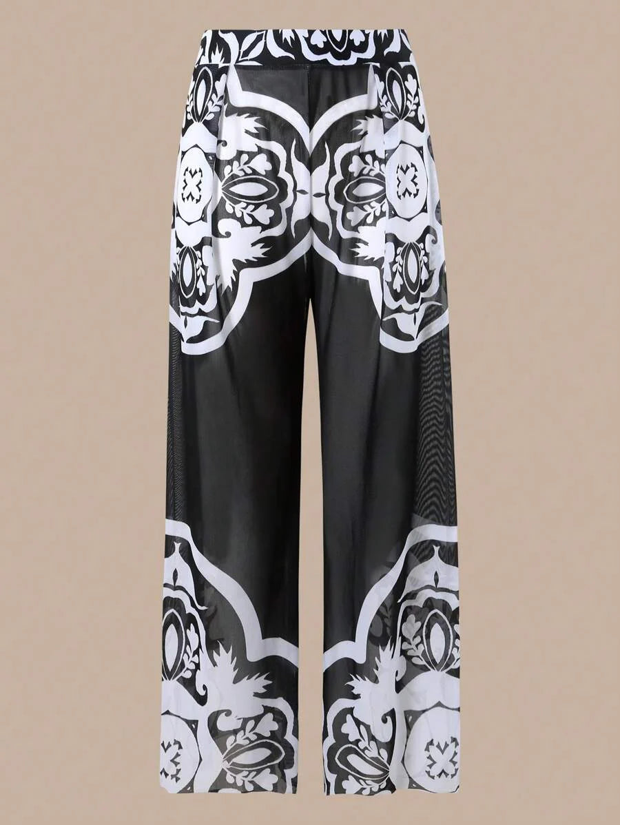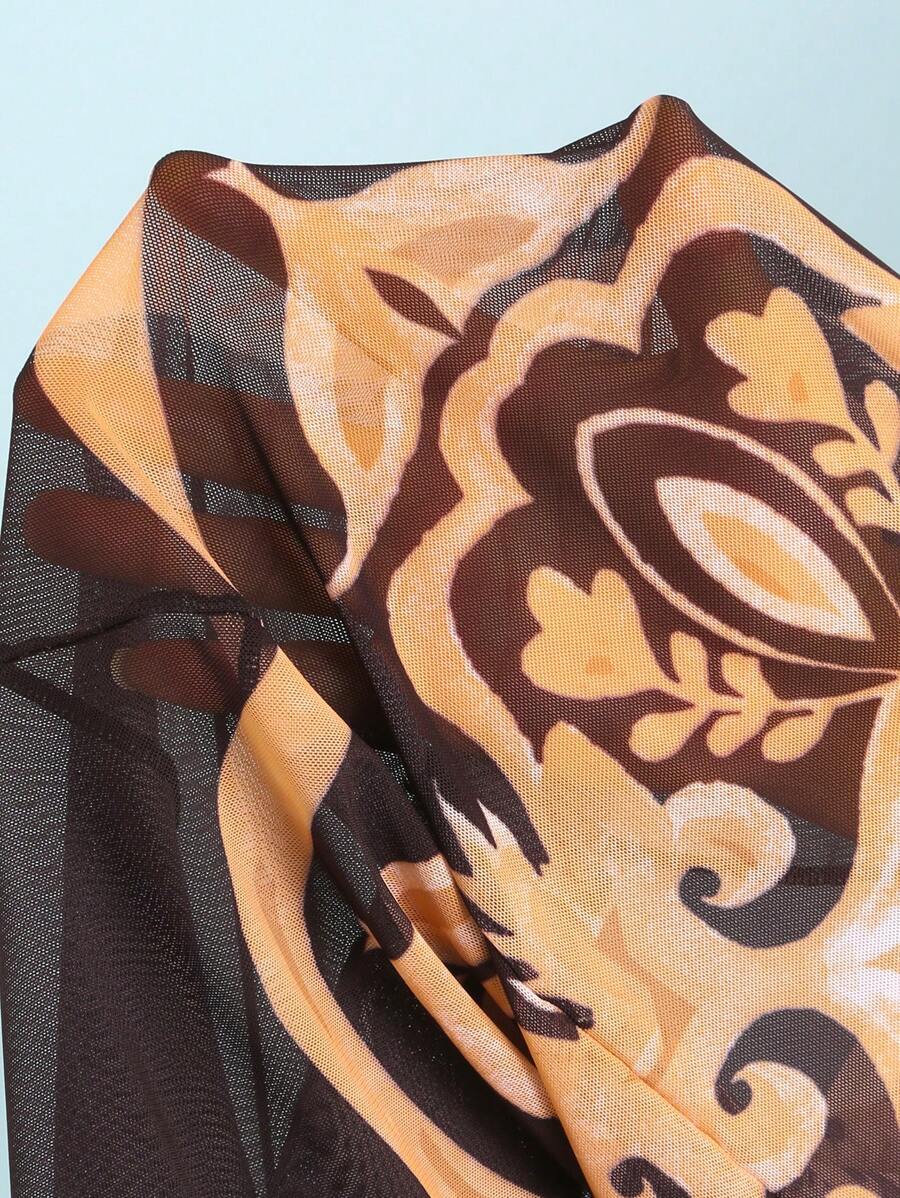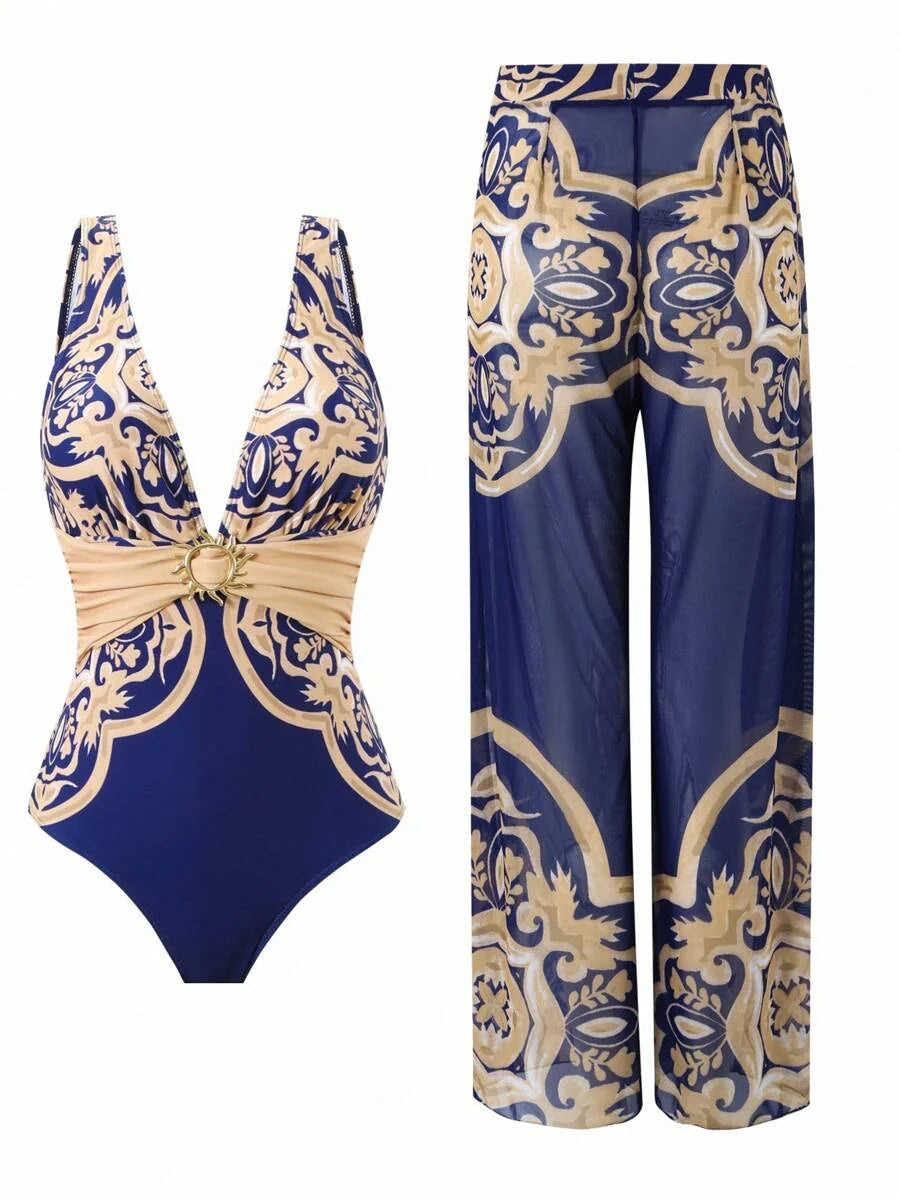 Oasis conjunto de 3 piezas 2025 nuevo: enterizo estampado con falda y pantalones de malla para mujer, conjunto de vacaciones de playa casual de verano