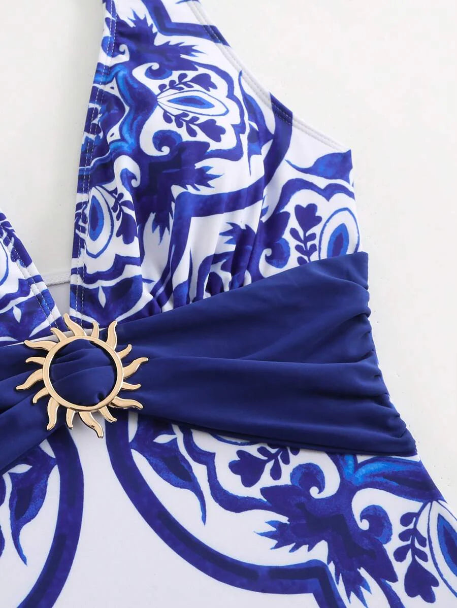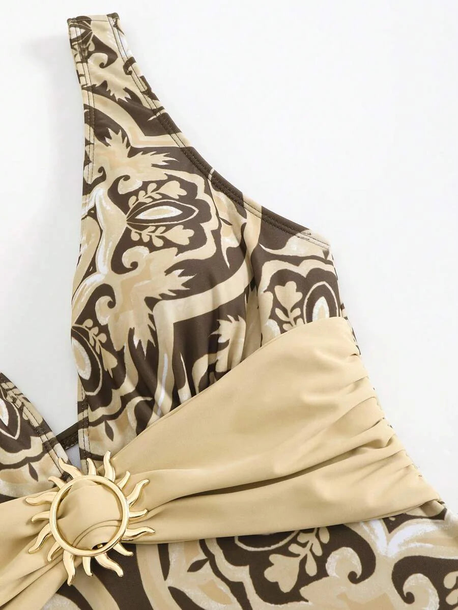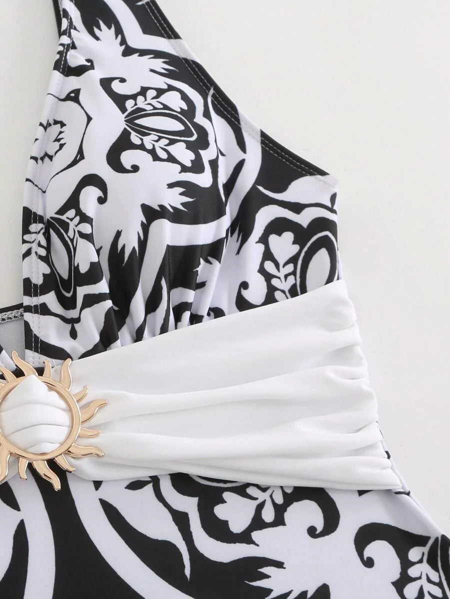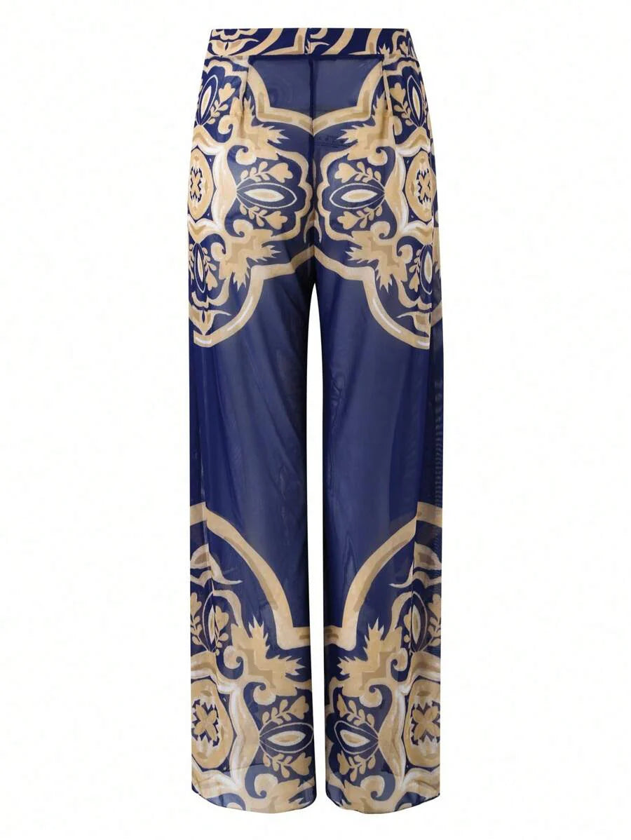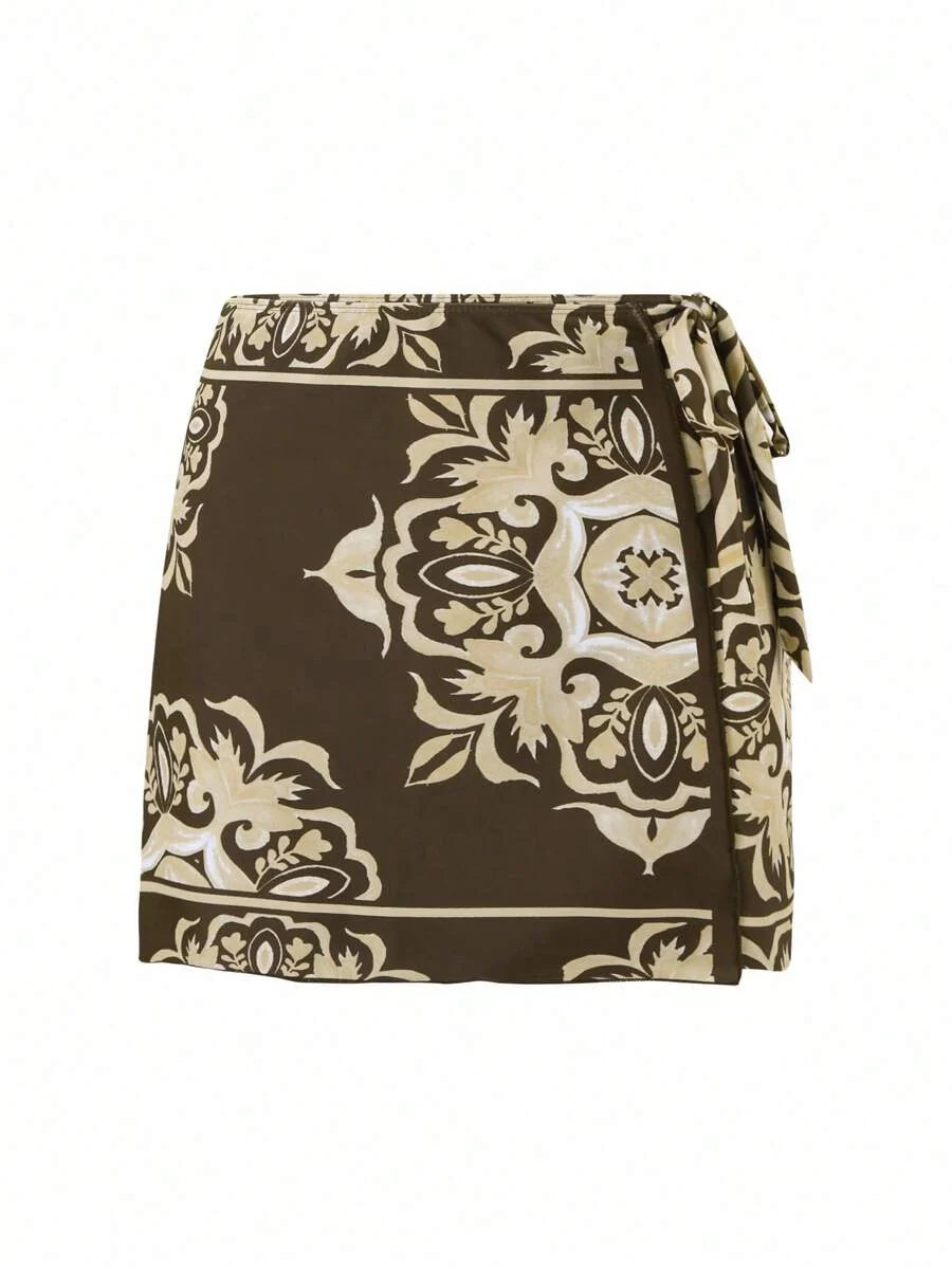 Oasis conjunto de 3 piezas 2025 nuevo: enterizo estampado con falda y pantalones de malla para mujer, conjunto de vacaciones de playa casual de verano