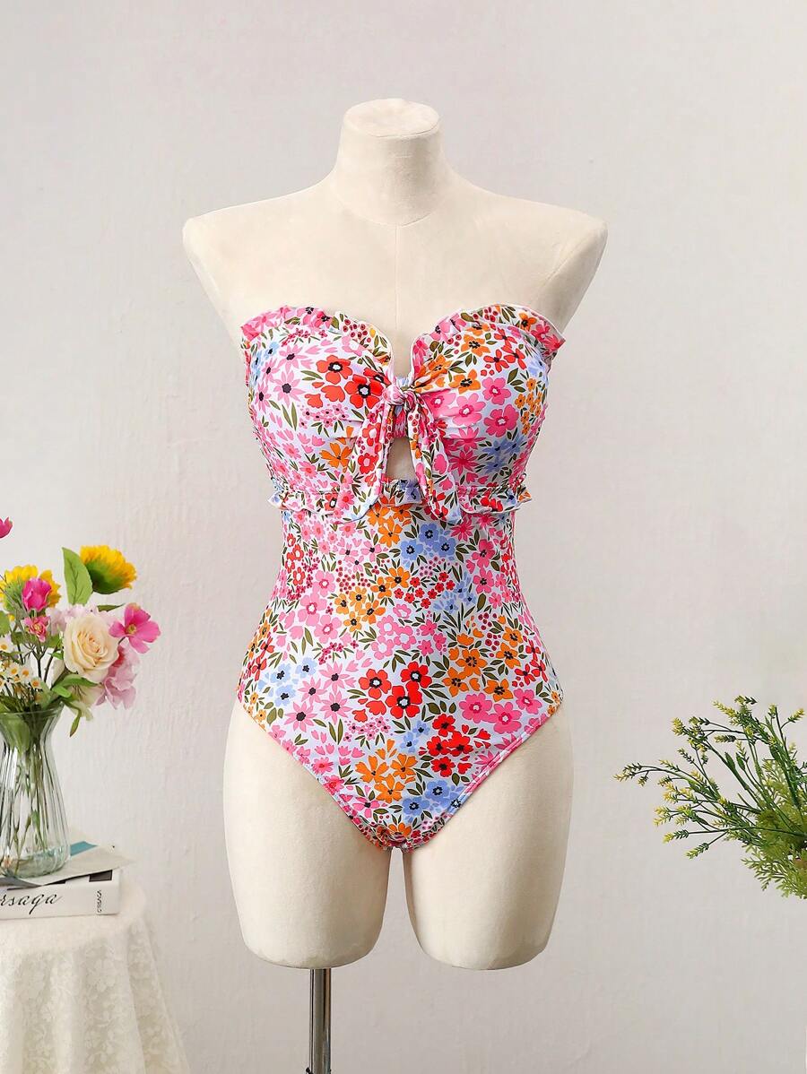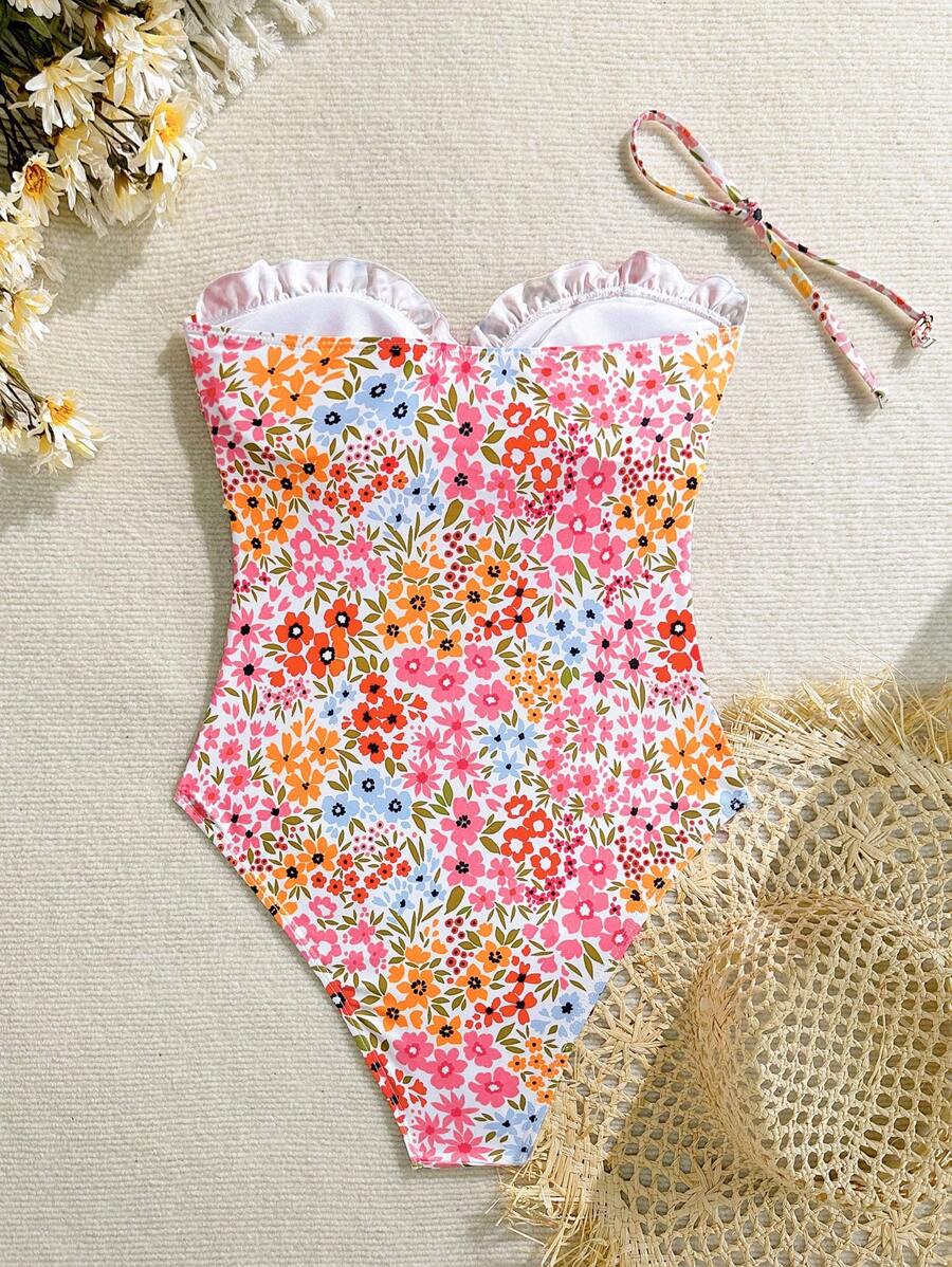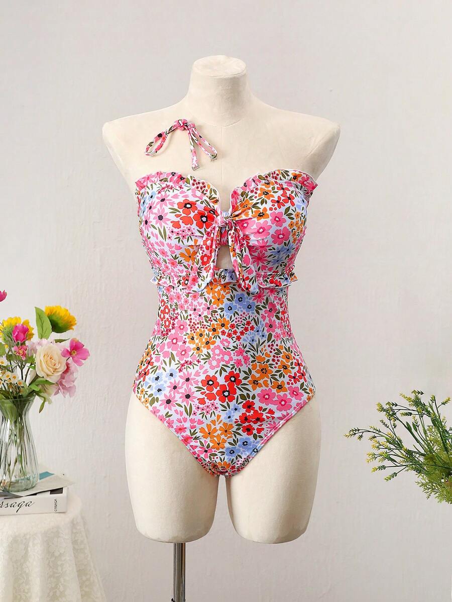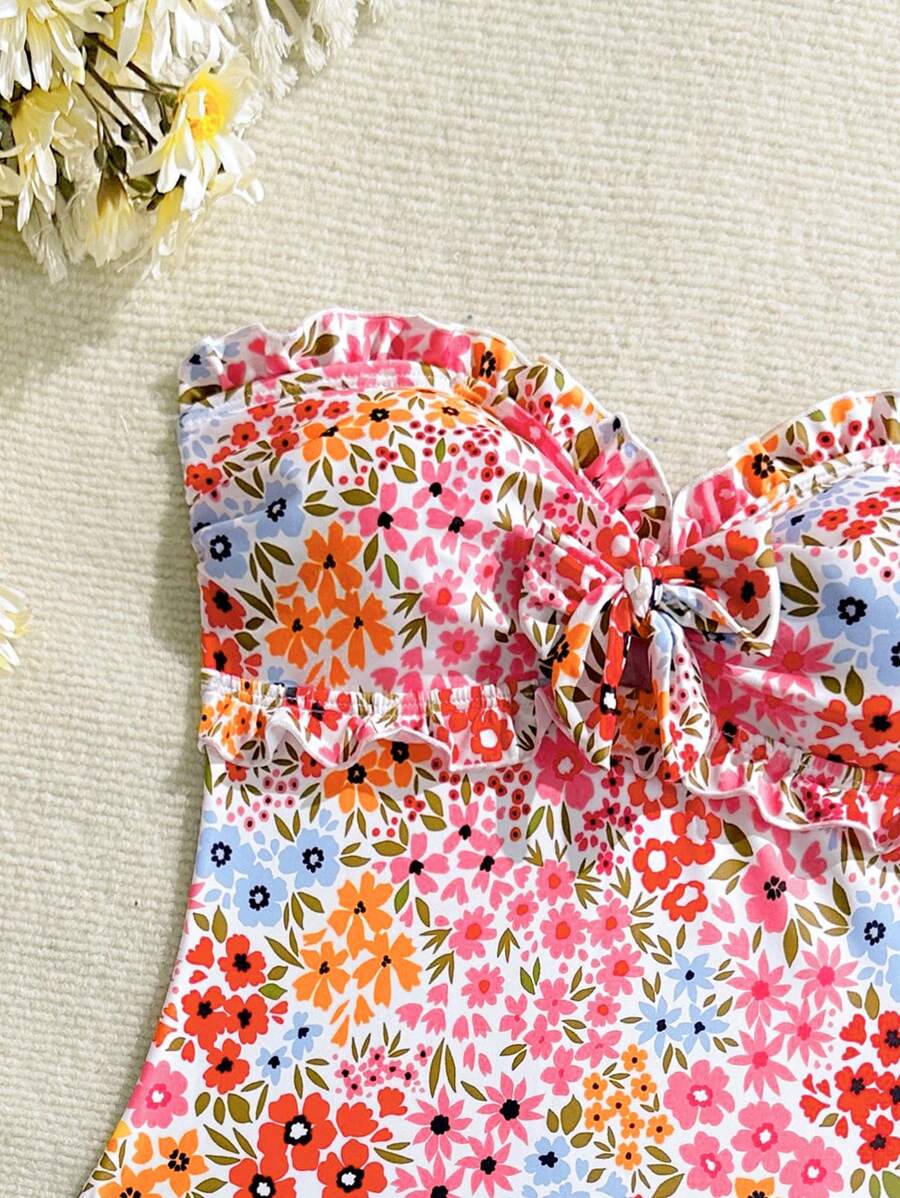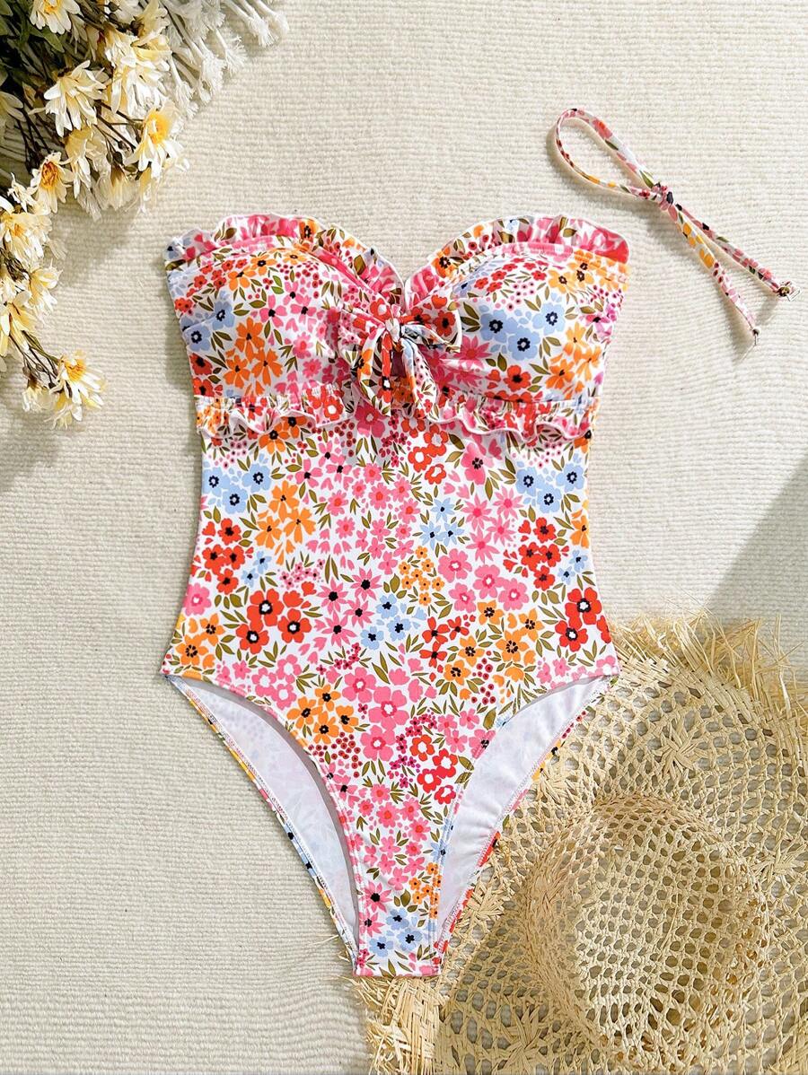 1 pieza vestido de playa con volantes y estampado floral diminuto, conjunto de vacaciones dulce y elegante para mujer