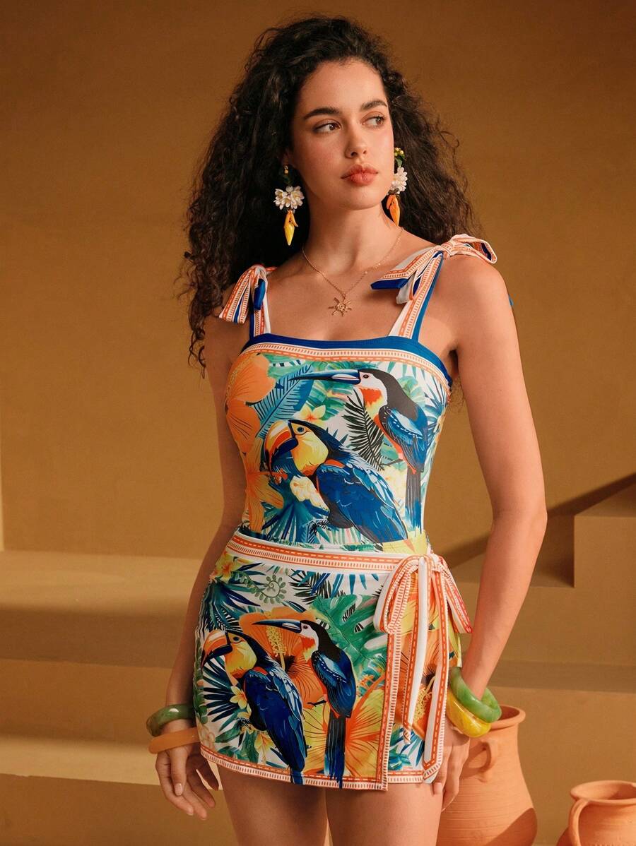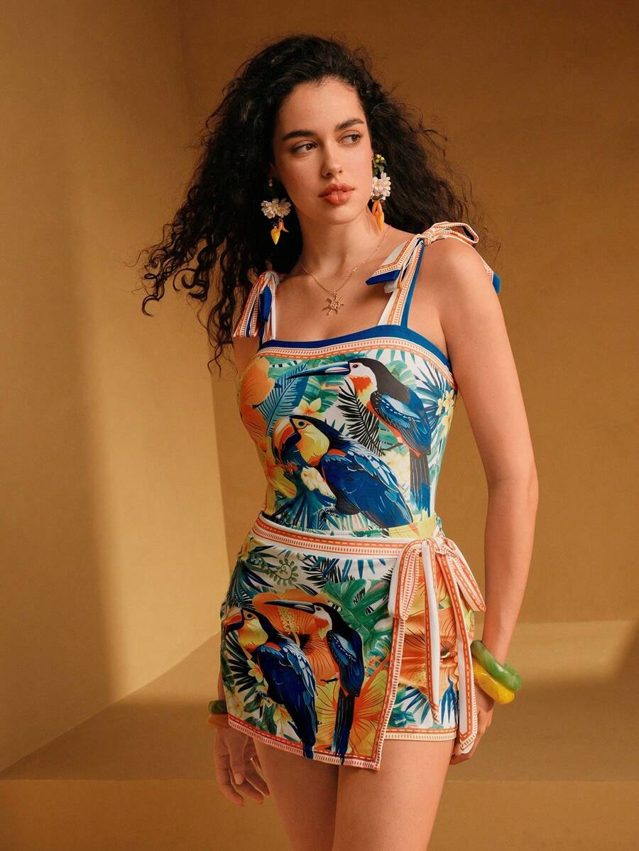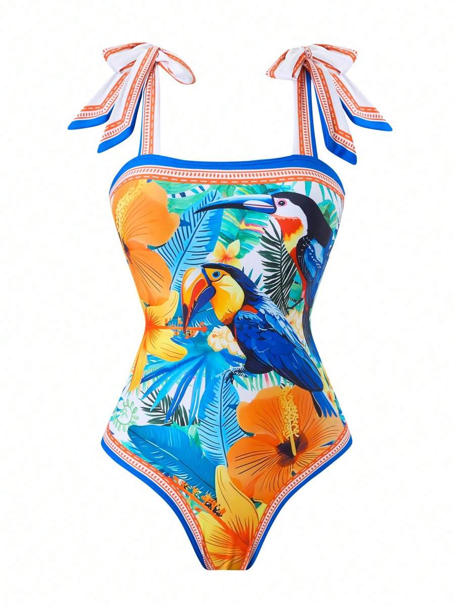 Oasis traje de bano de una pieza con estampado tropical de flores y loros, estilo europeo y americano para mujeres