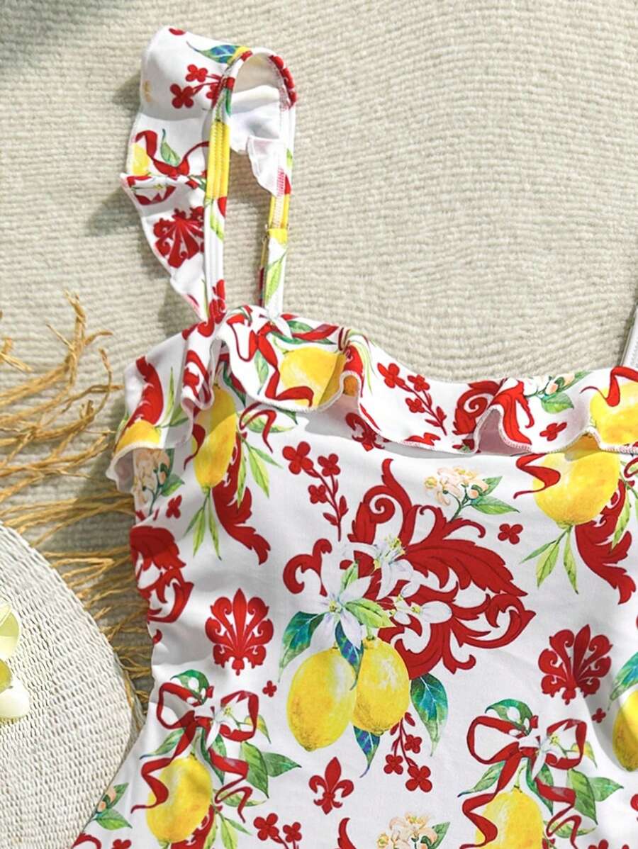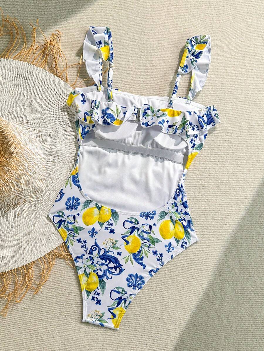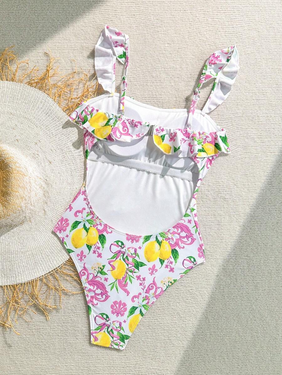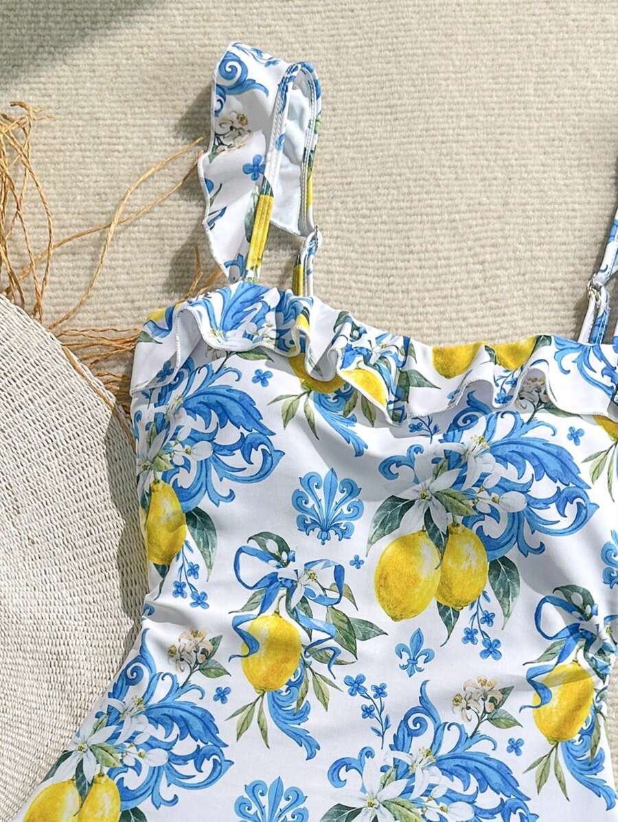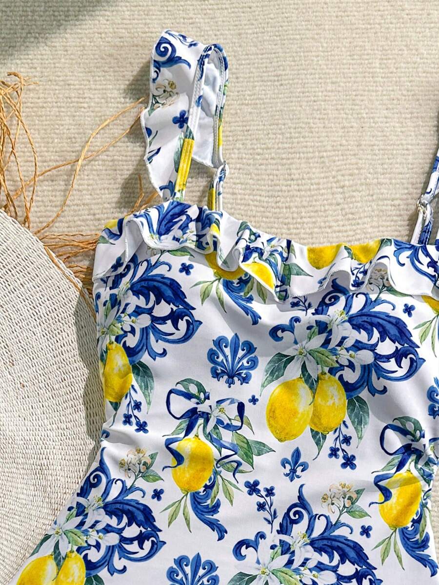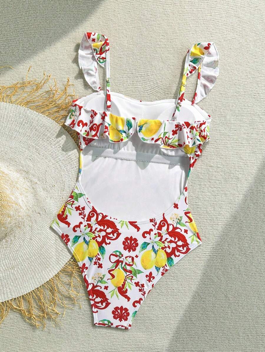 Traje de bano de una pieza sexy con volantes, abertura y estampado tropical de flores y frutas para mujer