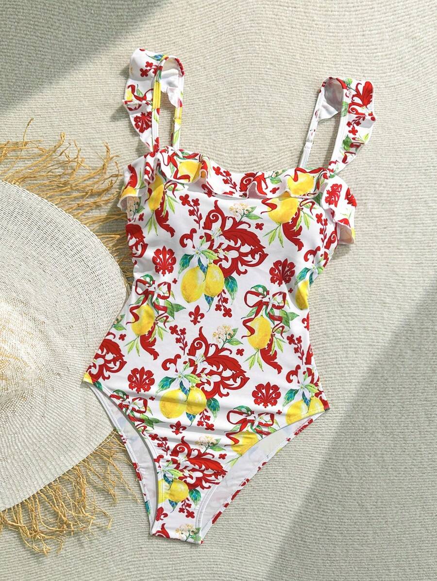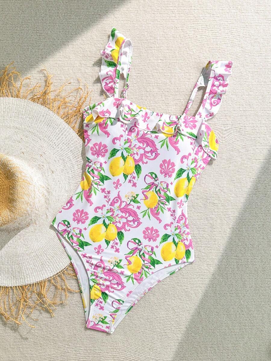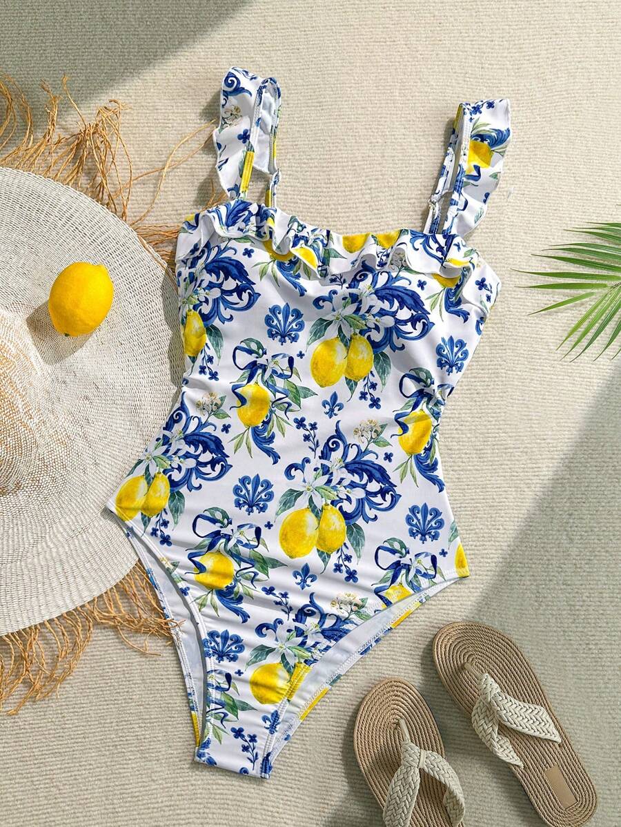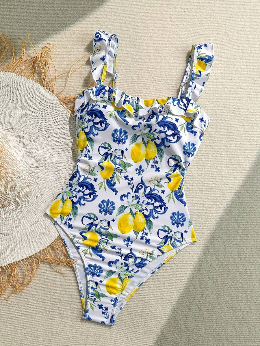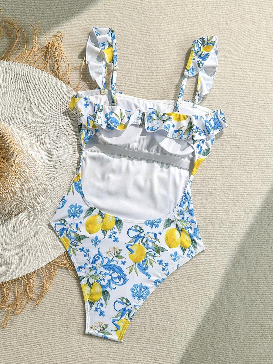 Traje de bano de una pieza sexy con volantes, abertura y estampado tropical de flores y frutas para mujer