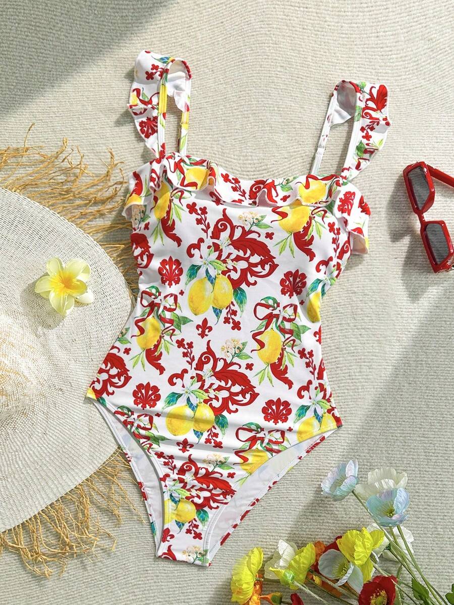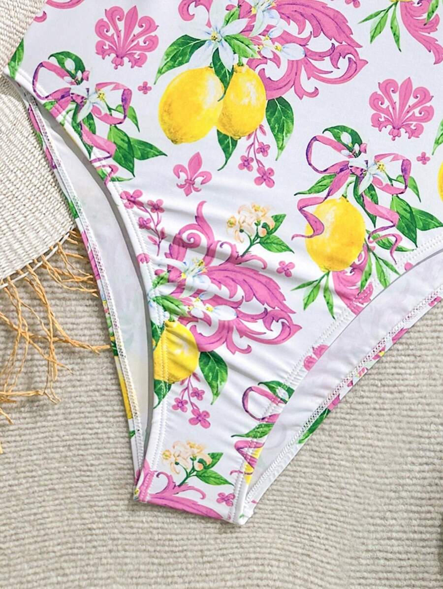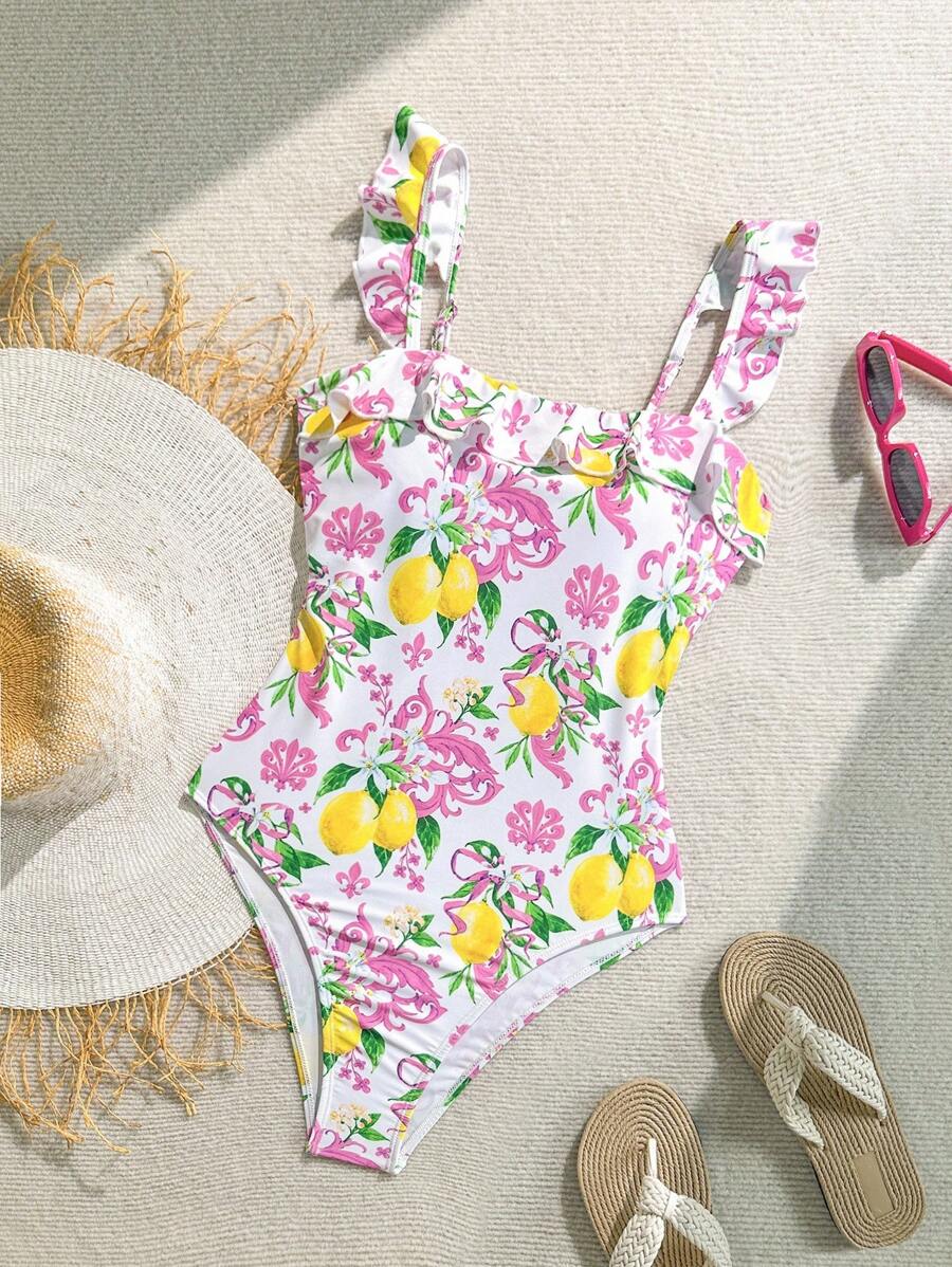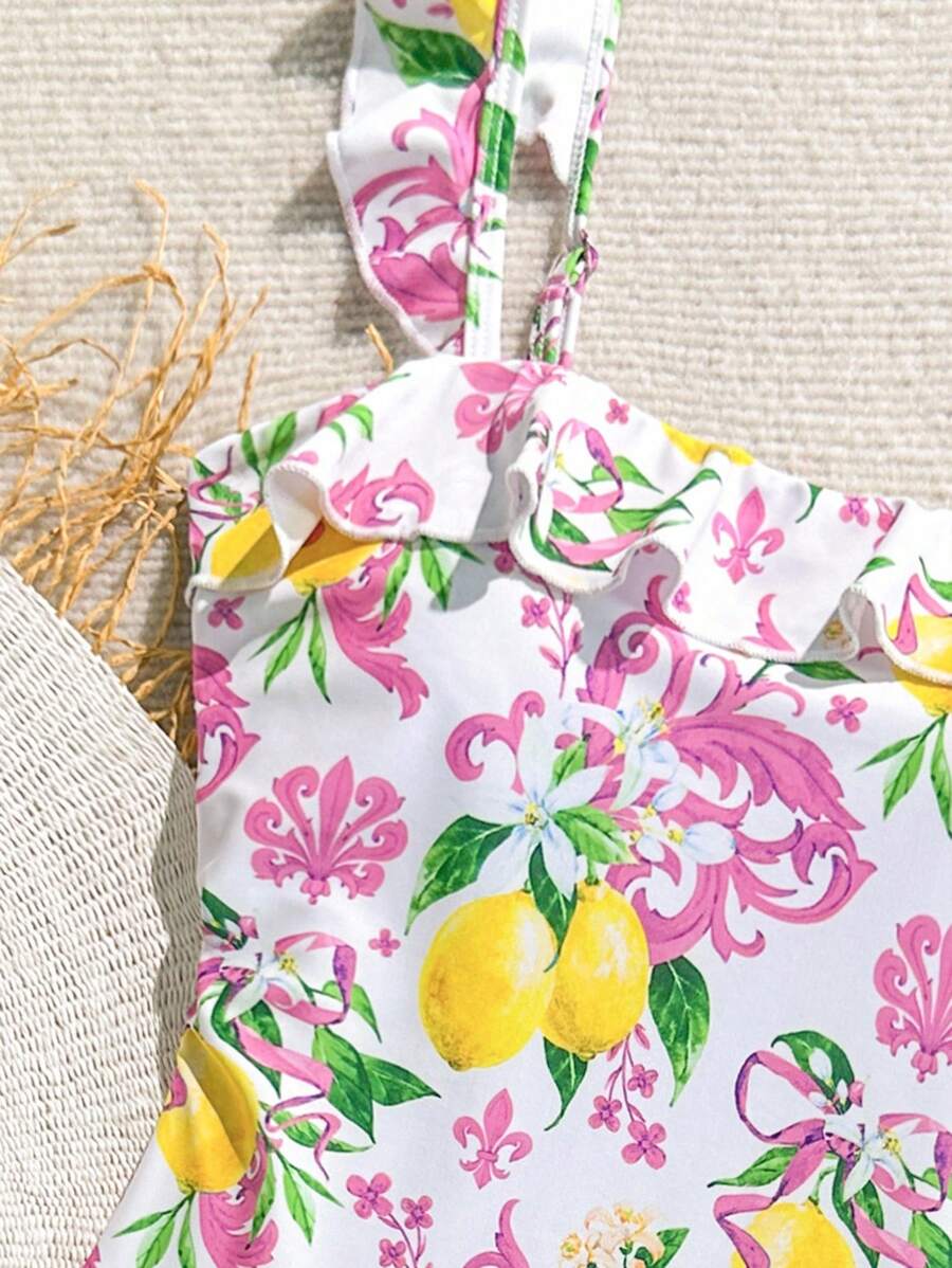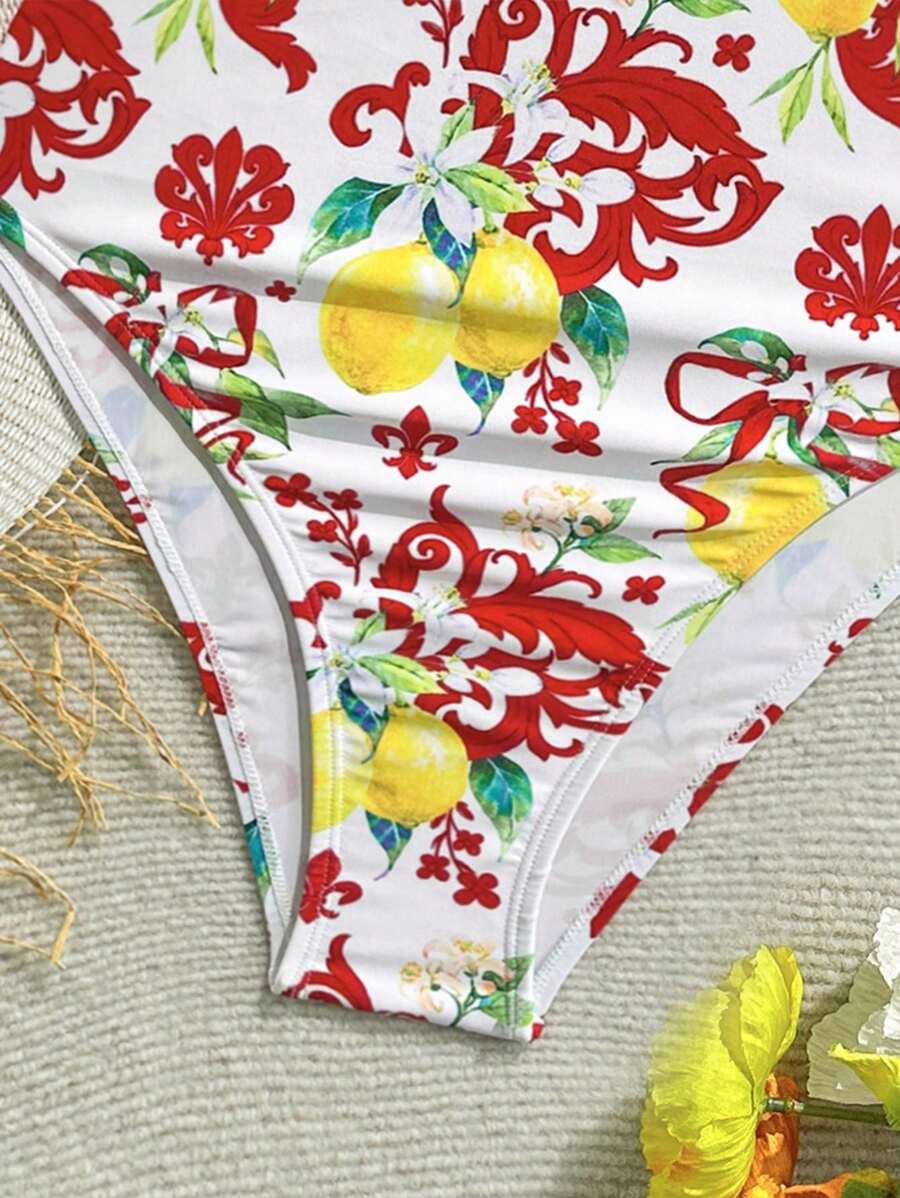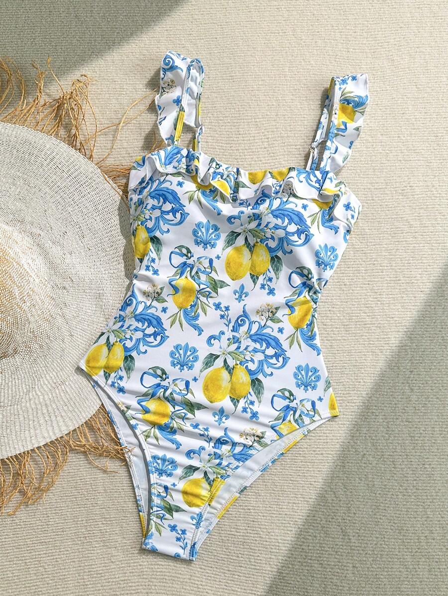 Traje de bano de una pieza sexy con volantes, abertura y estampado tropical de flores y frutas para mujer