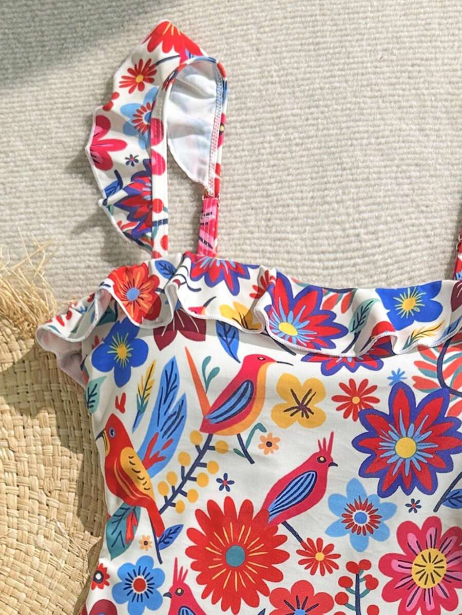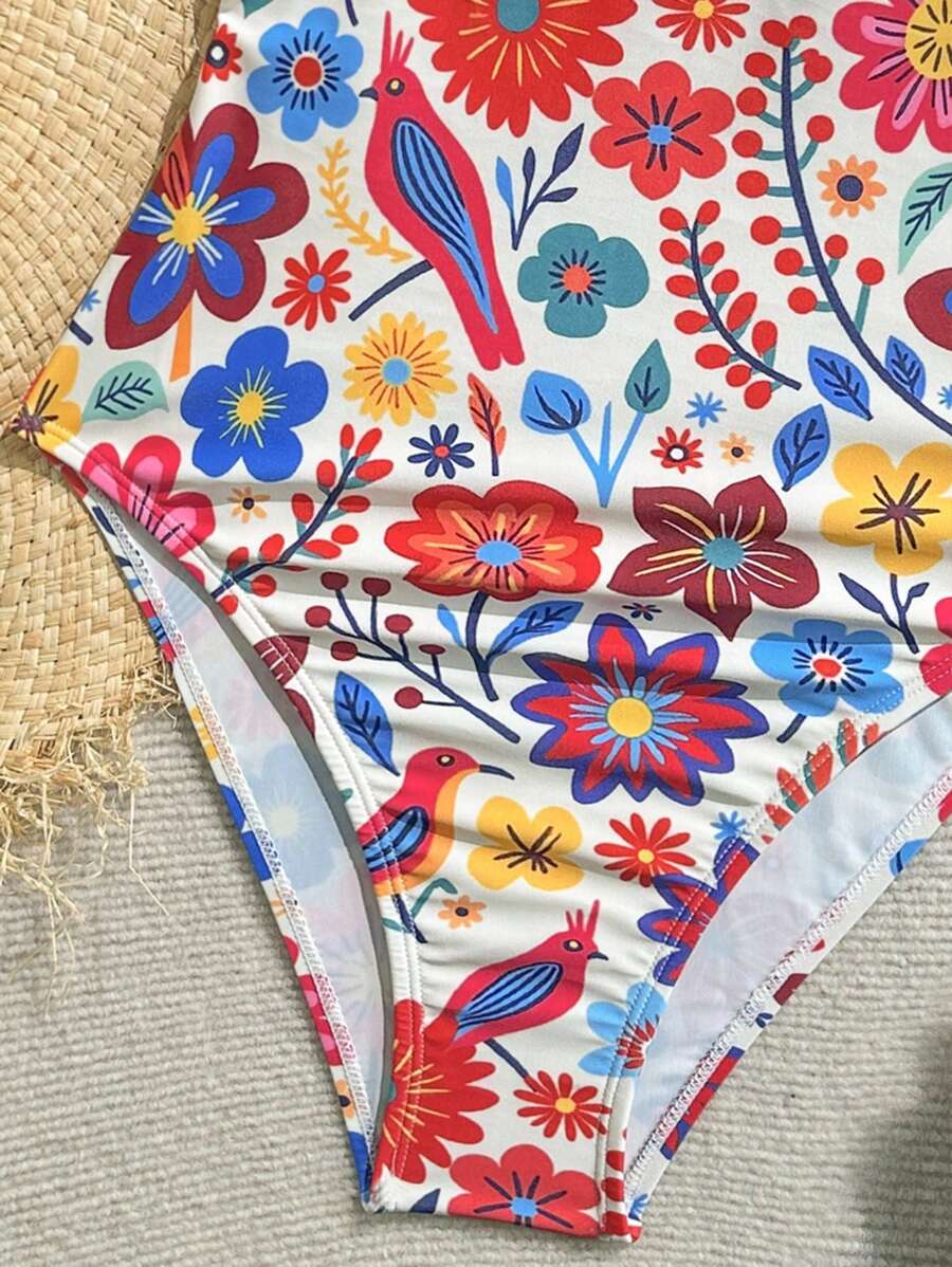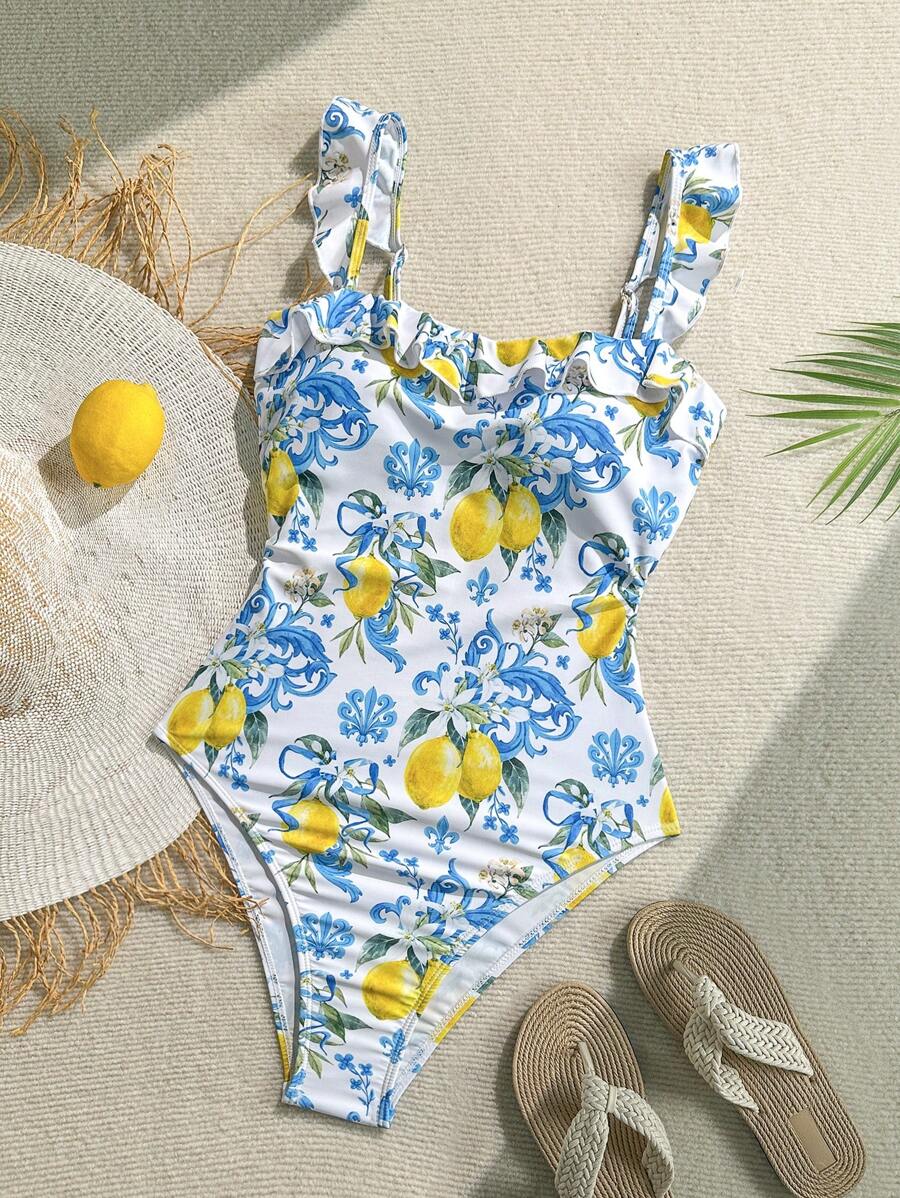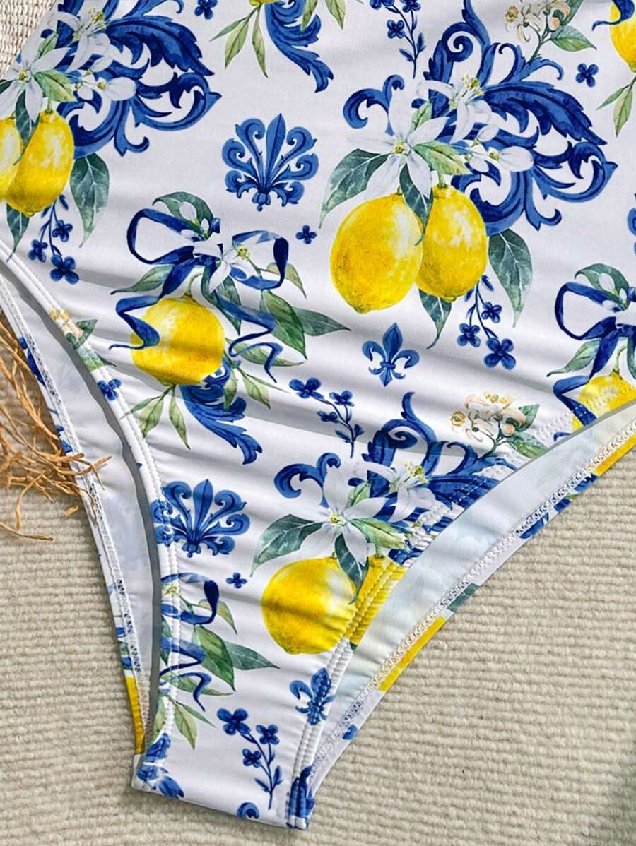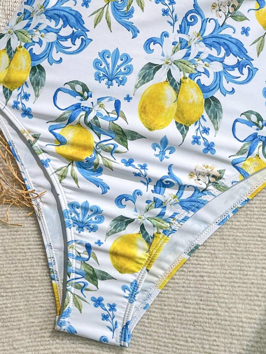 Traje de bano de una pieza sexy con volantes, abertura y estampado tropical de flores y frutas para mujer