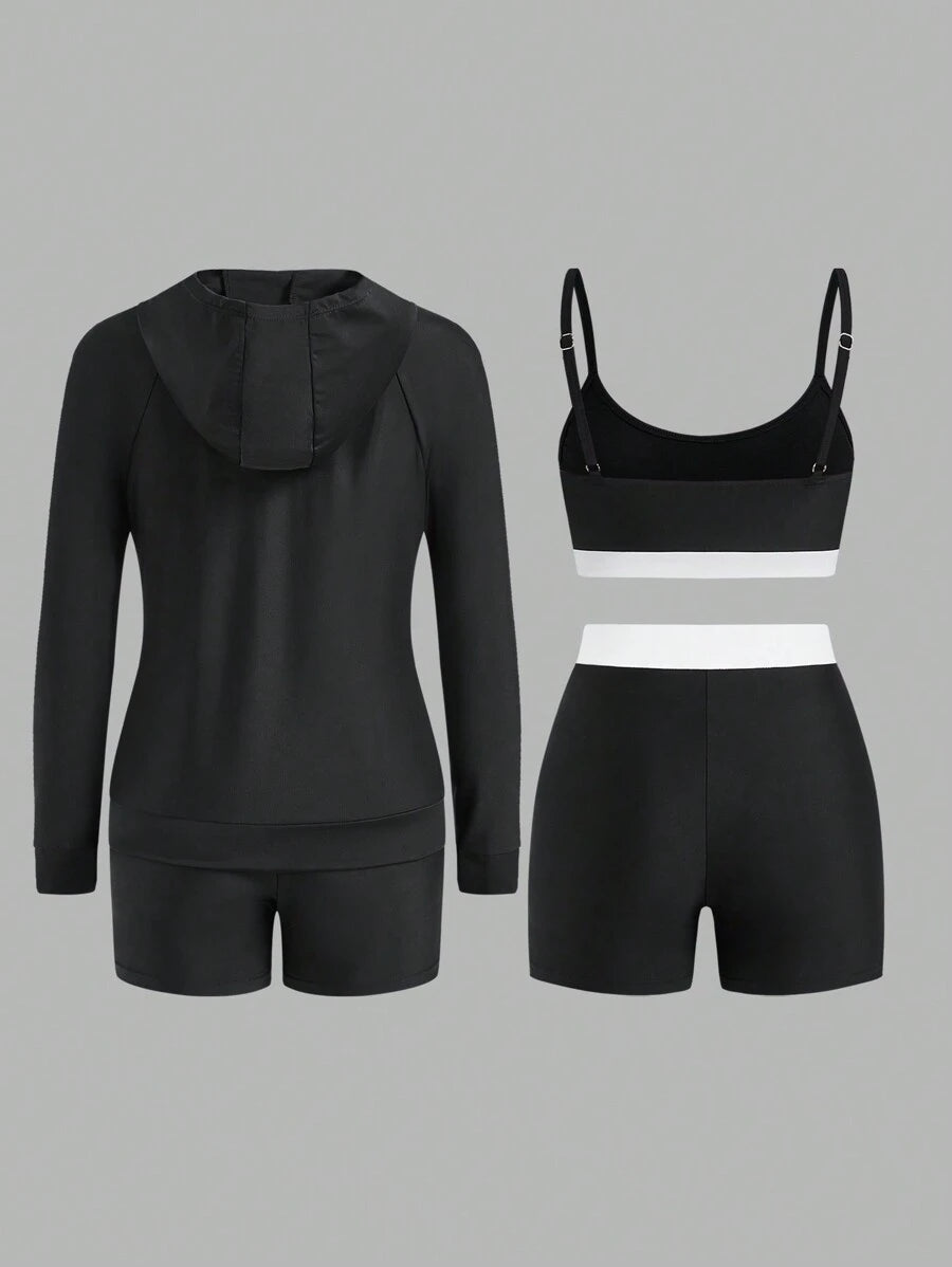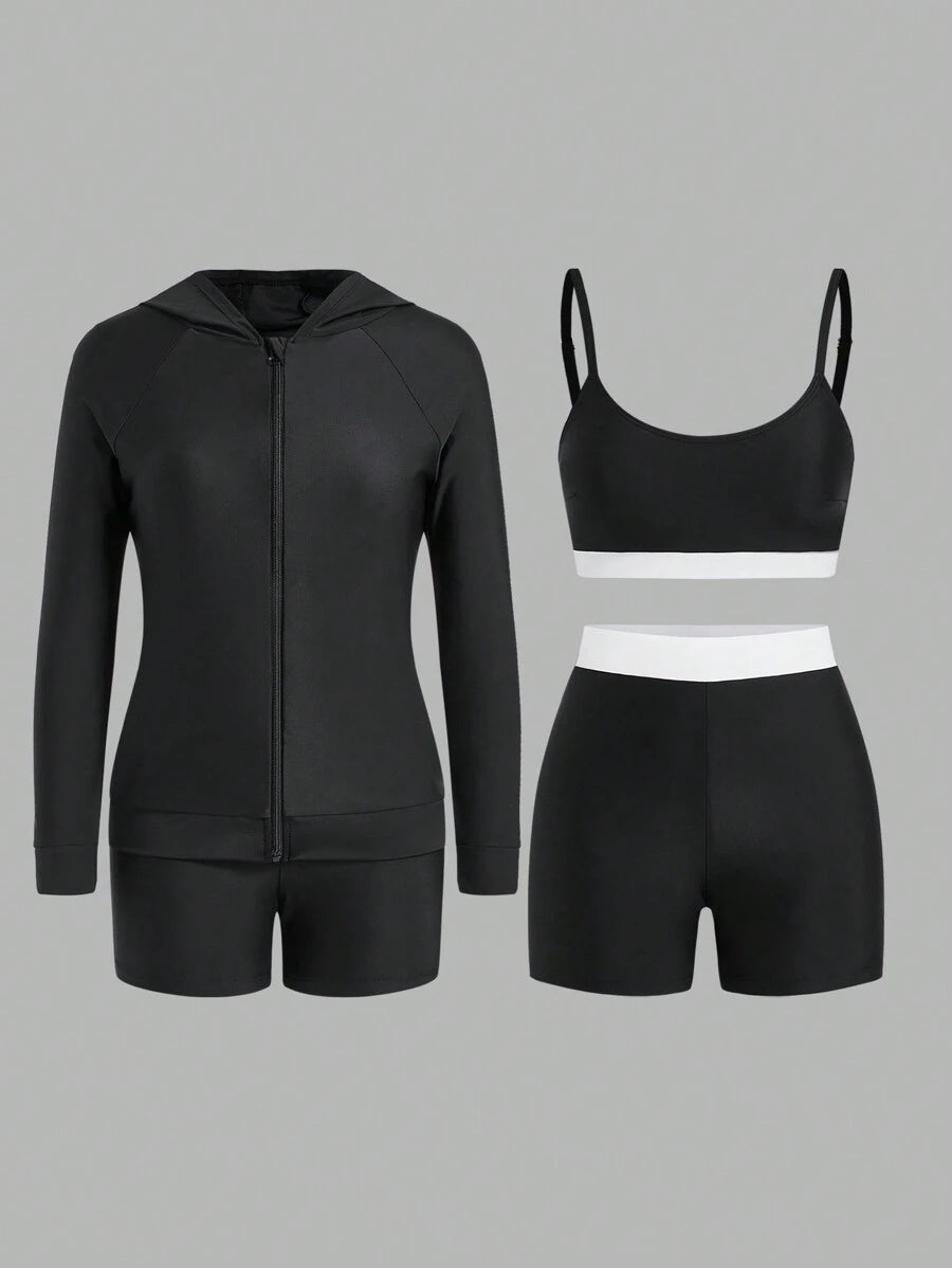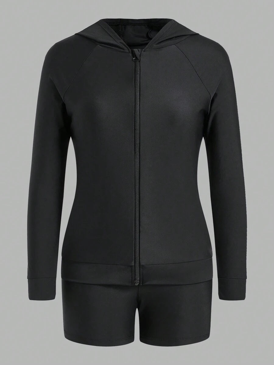 Chaqueta larga de mujer con cremallera delantera lisa, parte superior minimalista de tirantes finos con empalmes lisos y shorts para surf de verano