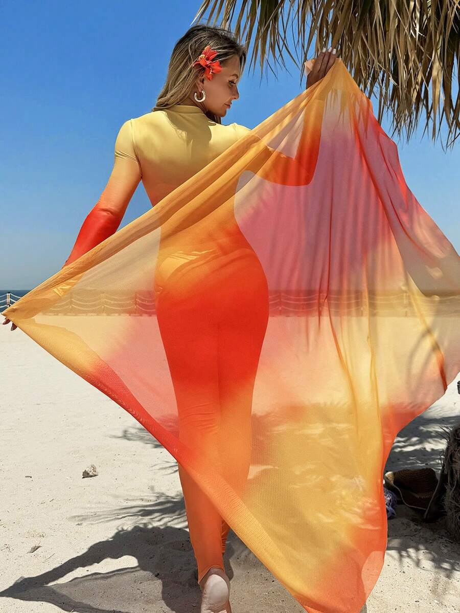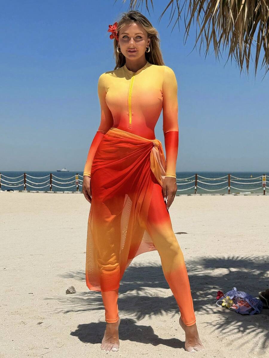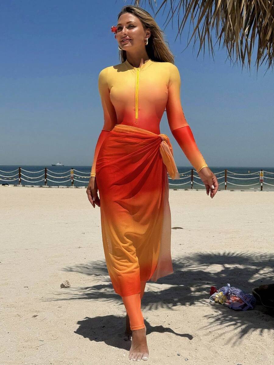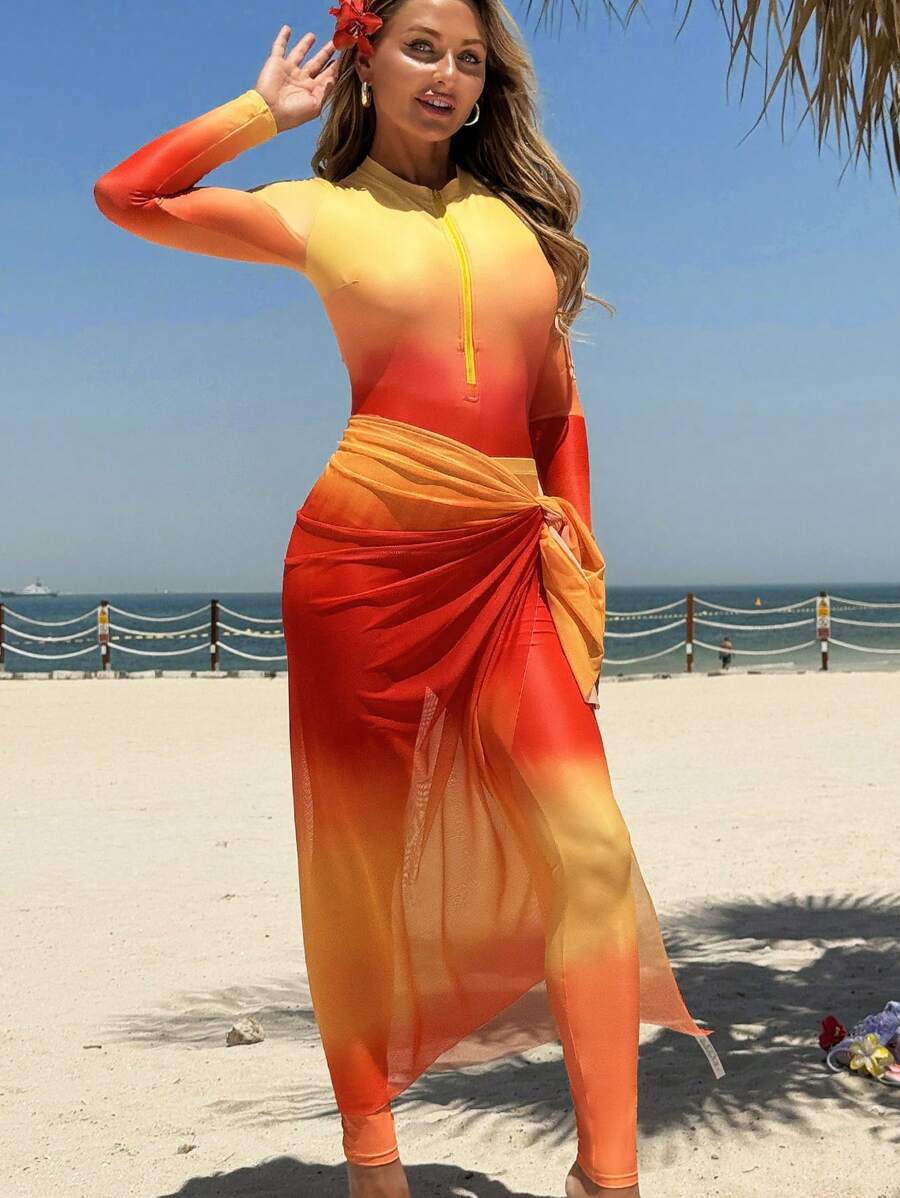 Shayni conjunto de traje de bano de 3 piezas para mujer: camiseta con cuello redondo de manga larga con estampado, pantalones slim fit de cintura alta y falda de playa, traje de bano conservador para vacaciones
