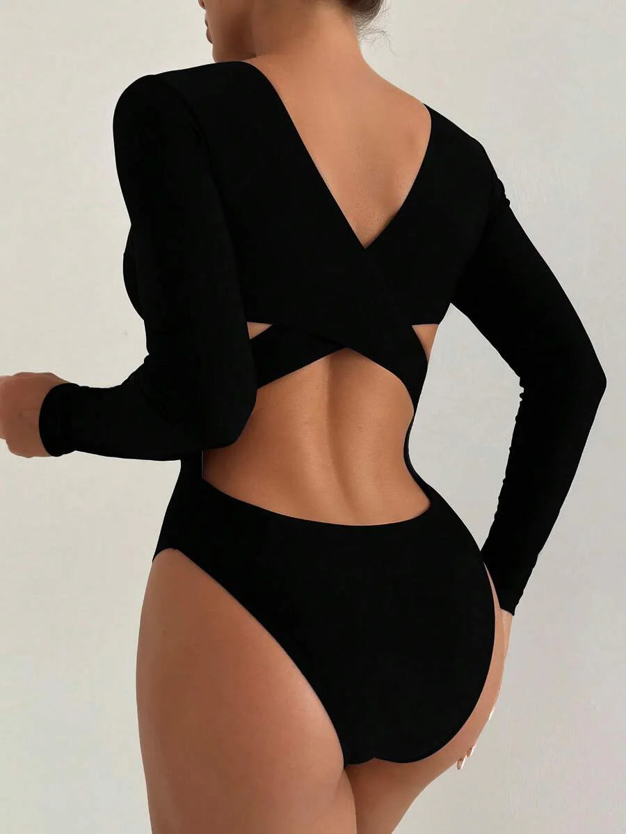 Traje de bano de una pieza para mujer con diseno sin espalda, parches – Muy Bonita