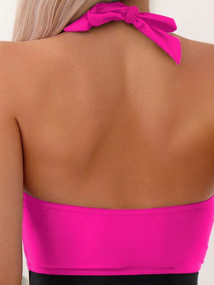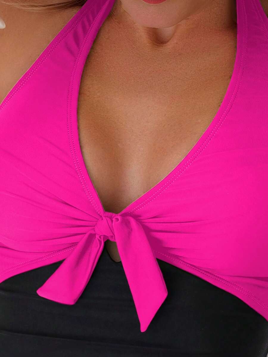 Vestido de bano una pieza de dos tonos con nudo delantero halter