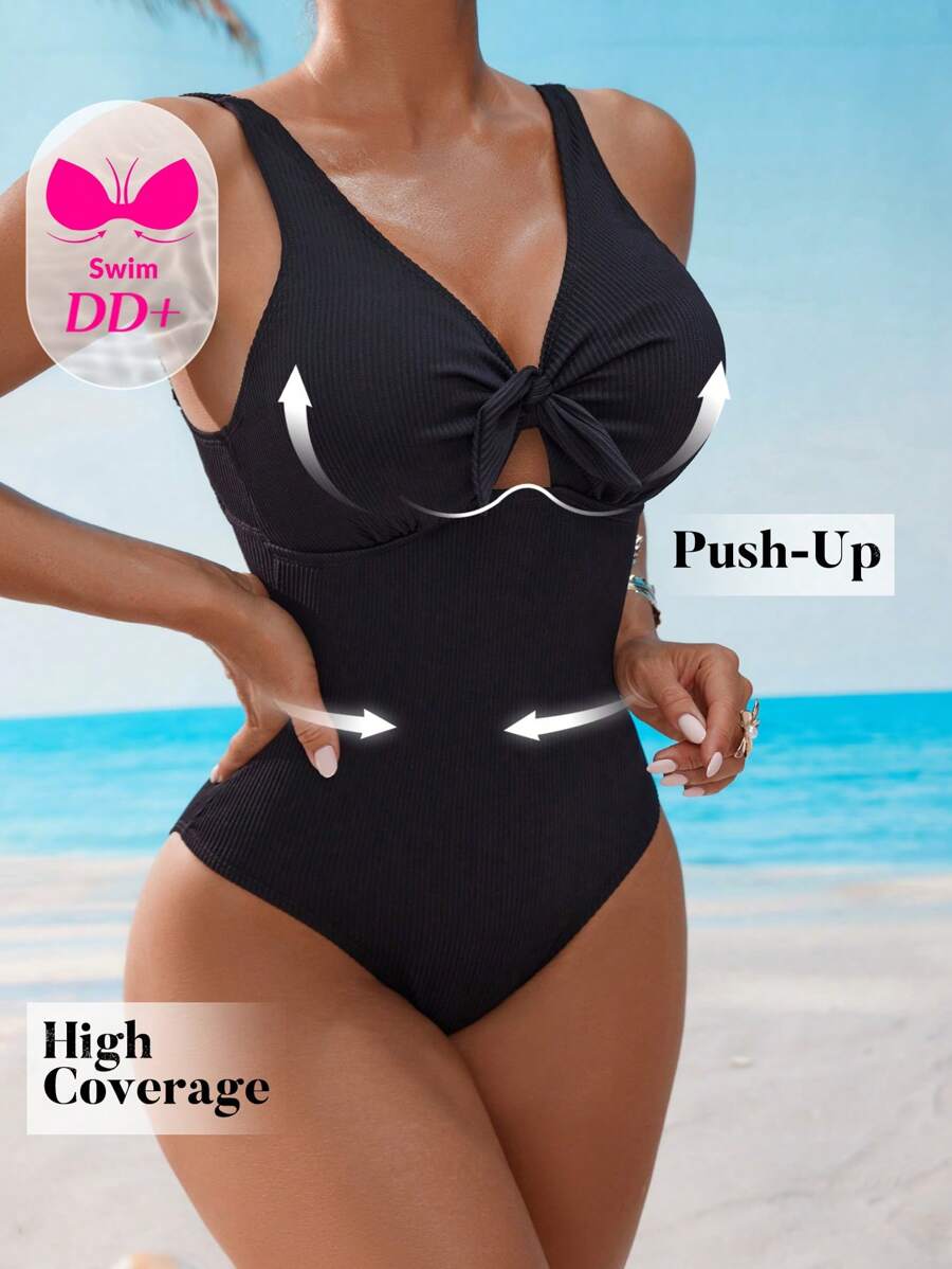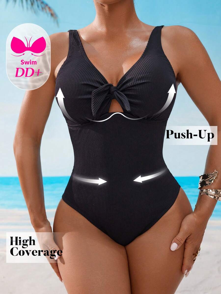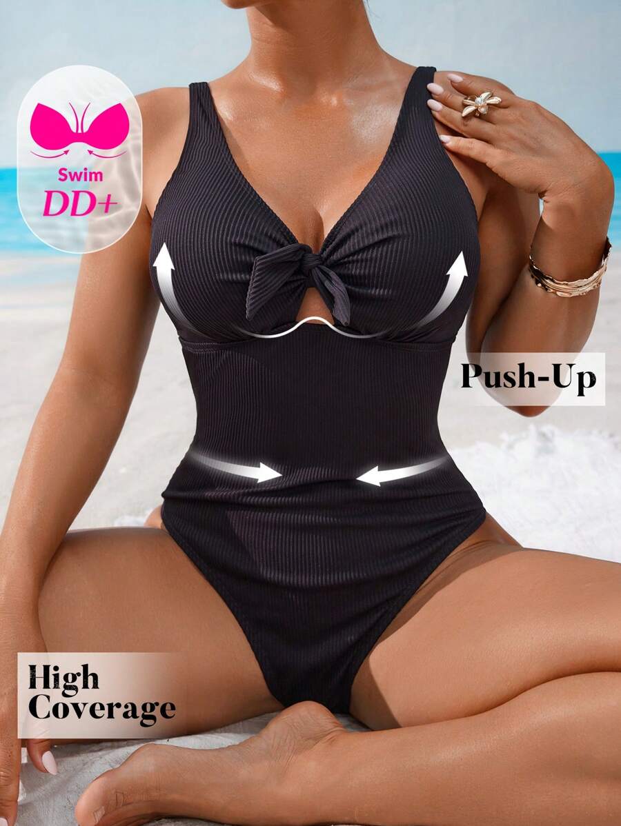 Dd+ traje de bano de una pieza para mujer con detalle de nudo delantero, unicolor para playa/vacaciones, verano