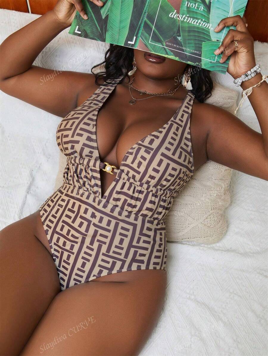 Traje de bano de una pieza con escote en v para tallas grandes de verano
