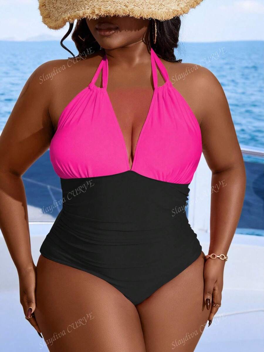 Traje de bano de una pieza con cuello de halter, plisado y bloques de color para tallas grandes para la playa de verano