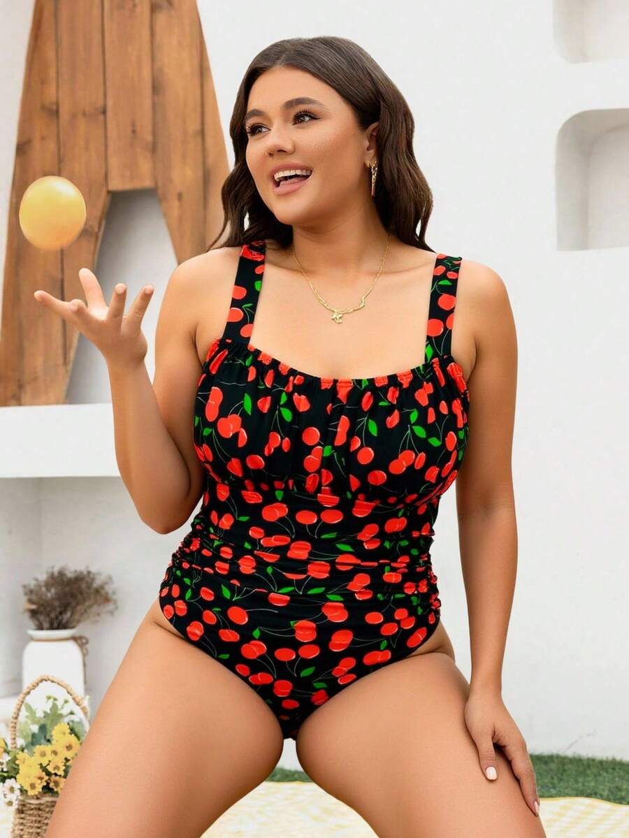 Traje de bano de una pieza talla grande con estampado de cerezas lindo y decoracion de cintura fruncida, adecuado para la playa