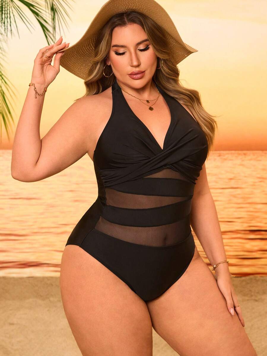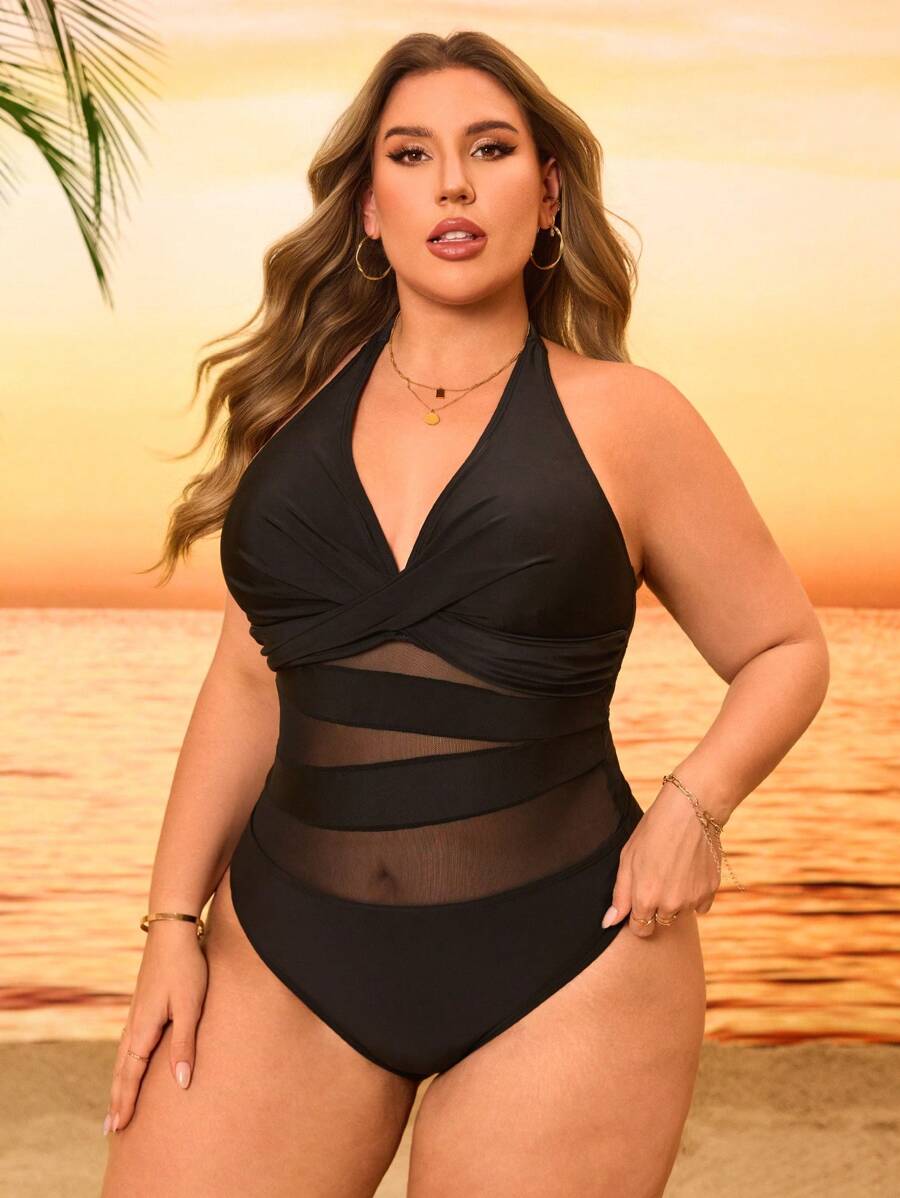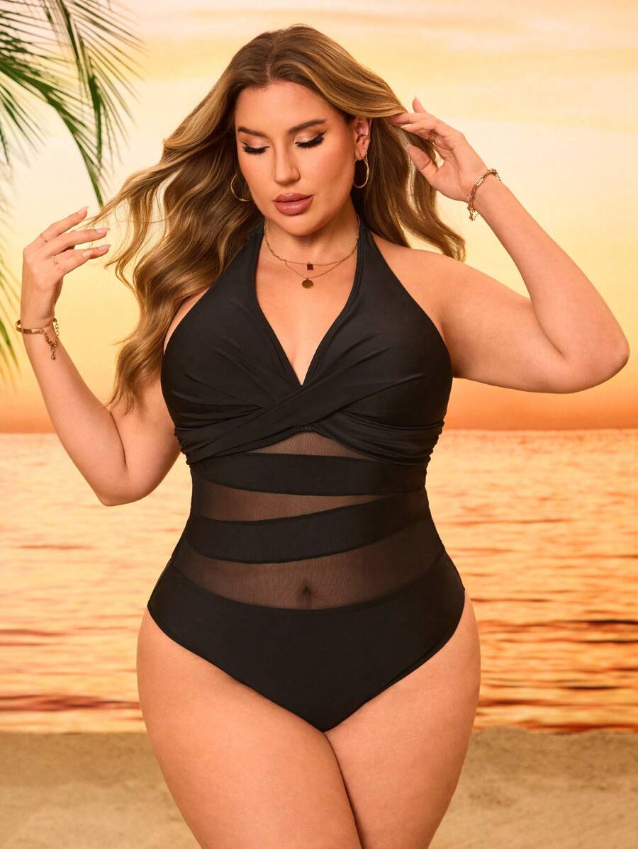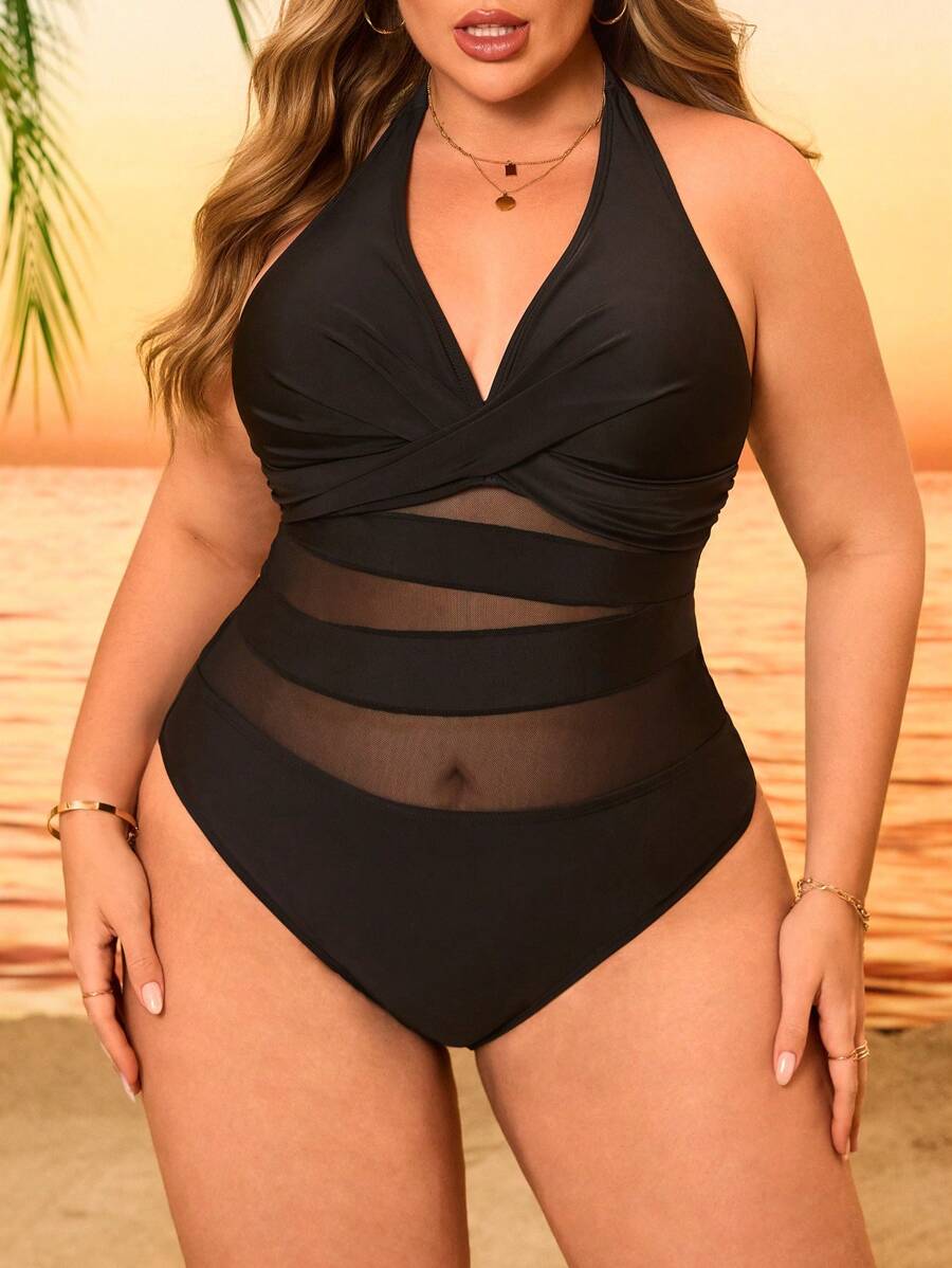 Lushoire traje de bano de una pieza con diseno simple y casual de verano para mujer, con parches de malla negra en tallas grandes