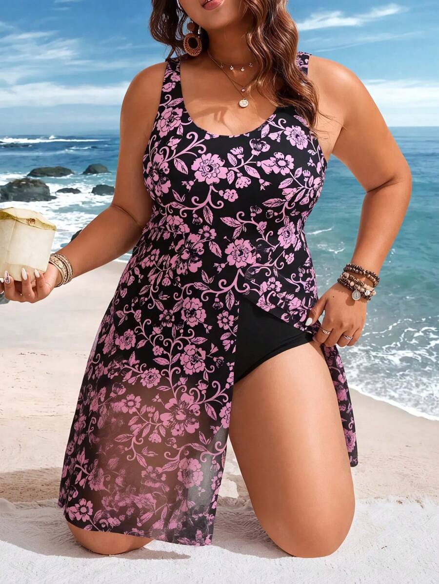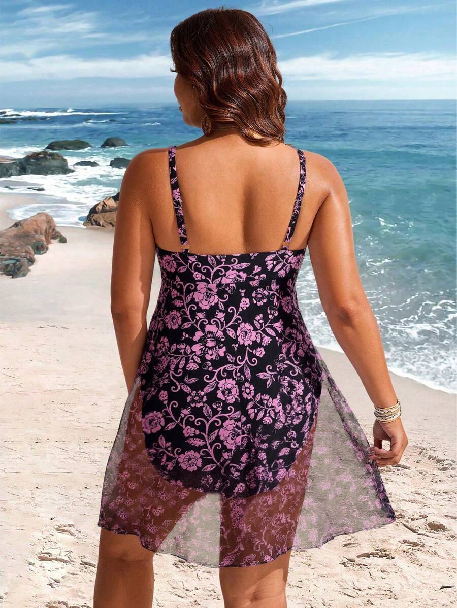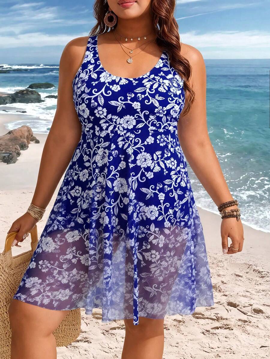Lushoire vestido de traje de bano de una sola pieza con estampados y contraste de malla para mujer de talla grande