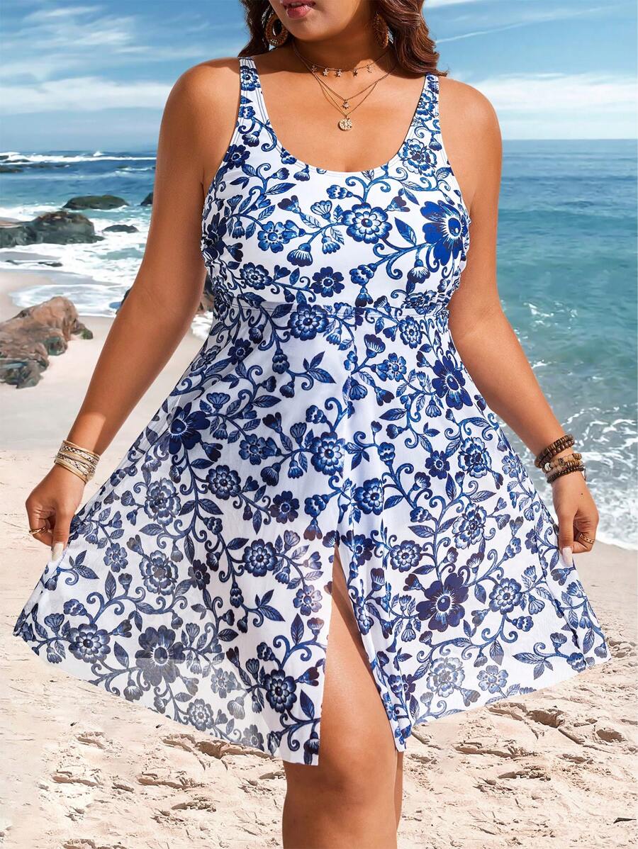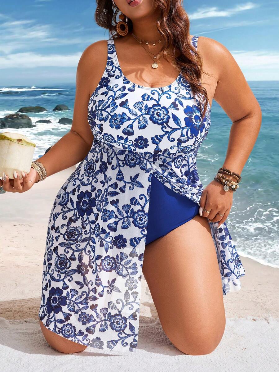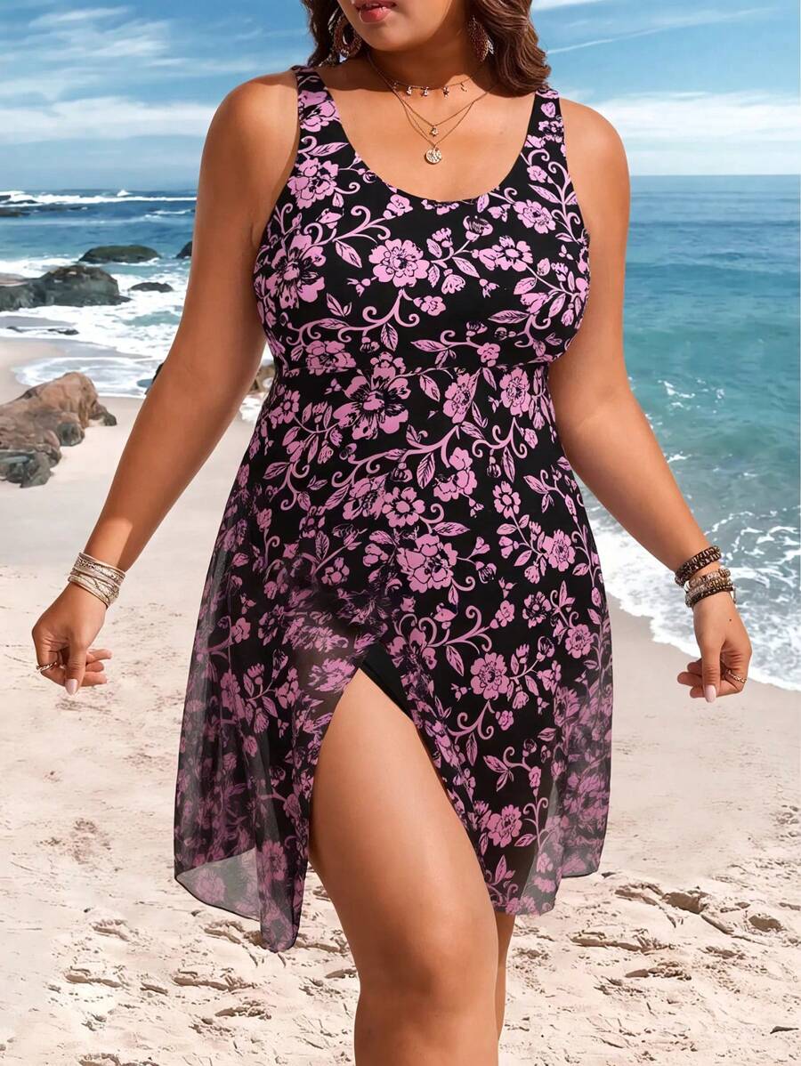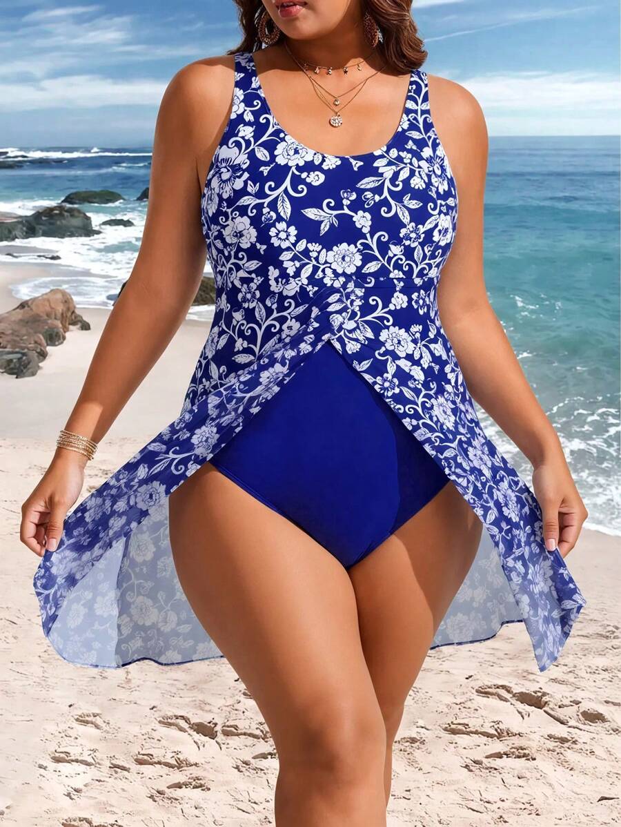 Lushoire vestido de traje de bano de una sola pieza con estampados y contraste de malla para mujer de talla grande