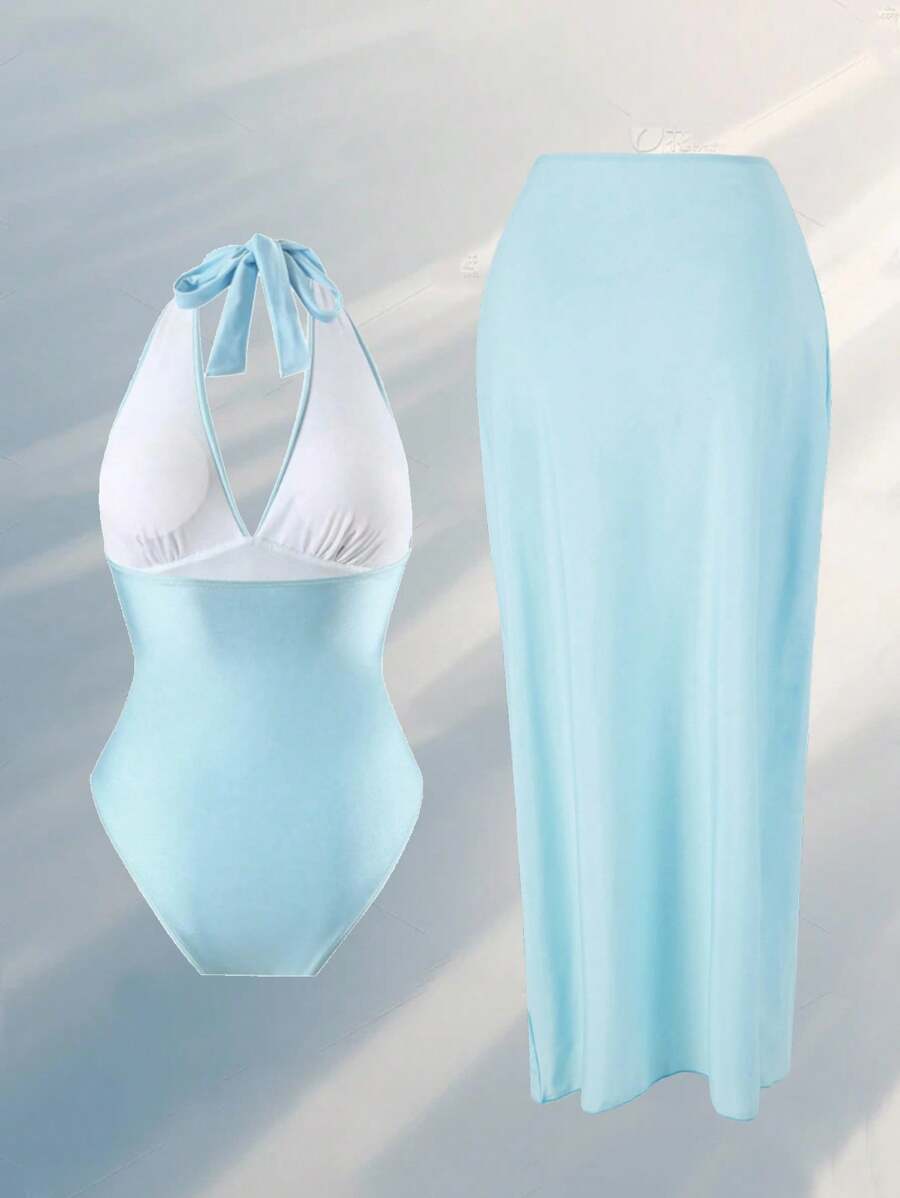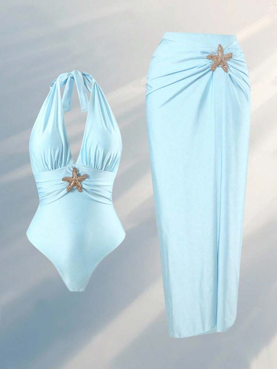 Oasis traje de bano de una pieza con cuello en v con plisado metalico con diseno de estrella de mar talla grande + falda media alta de estrella de mar de alta gama
