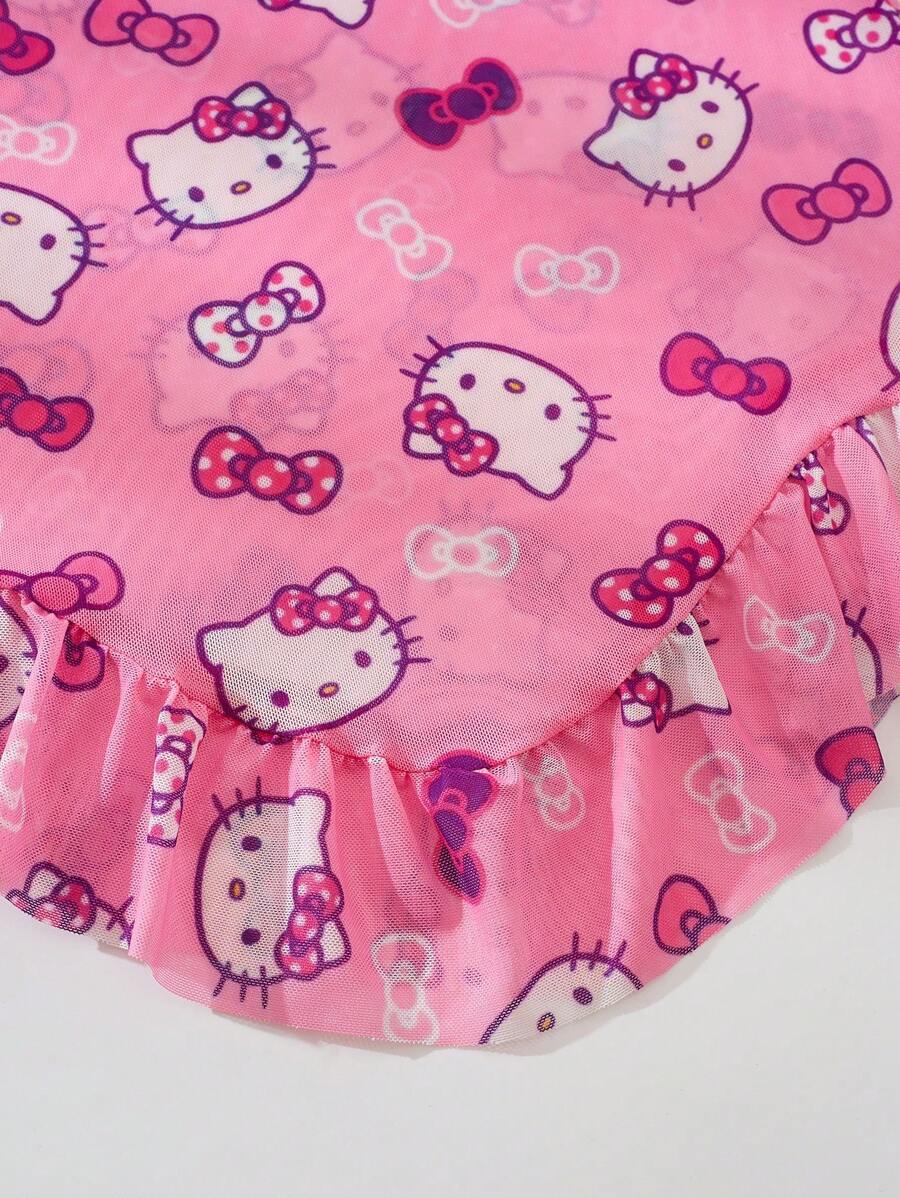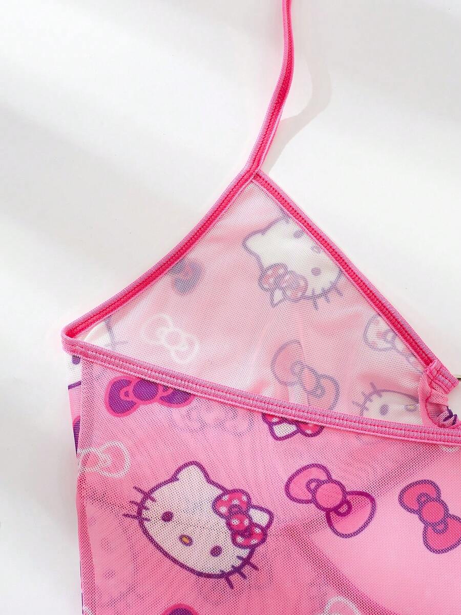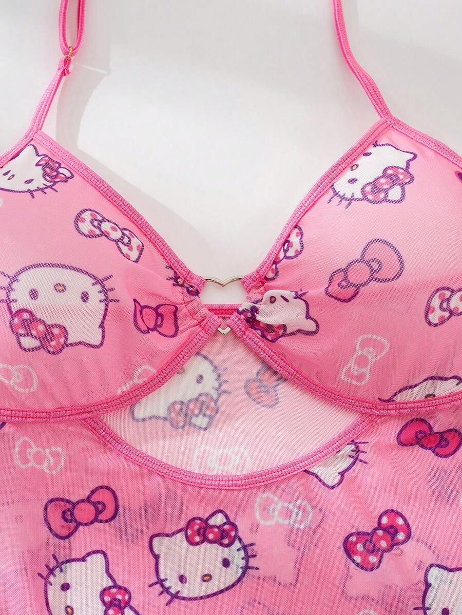 Sanrio 1 pieza vestido de lenceria sexy para mujer con diseno de hello kitty de sanrio, cuello en v rosa, halter, transparente, espalda descubierta y calado, volantes en el bajo, camison sexy