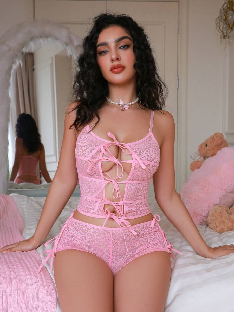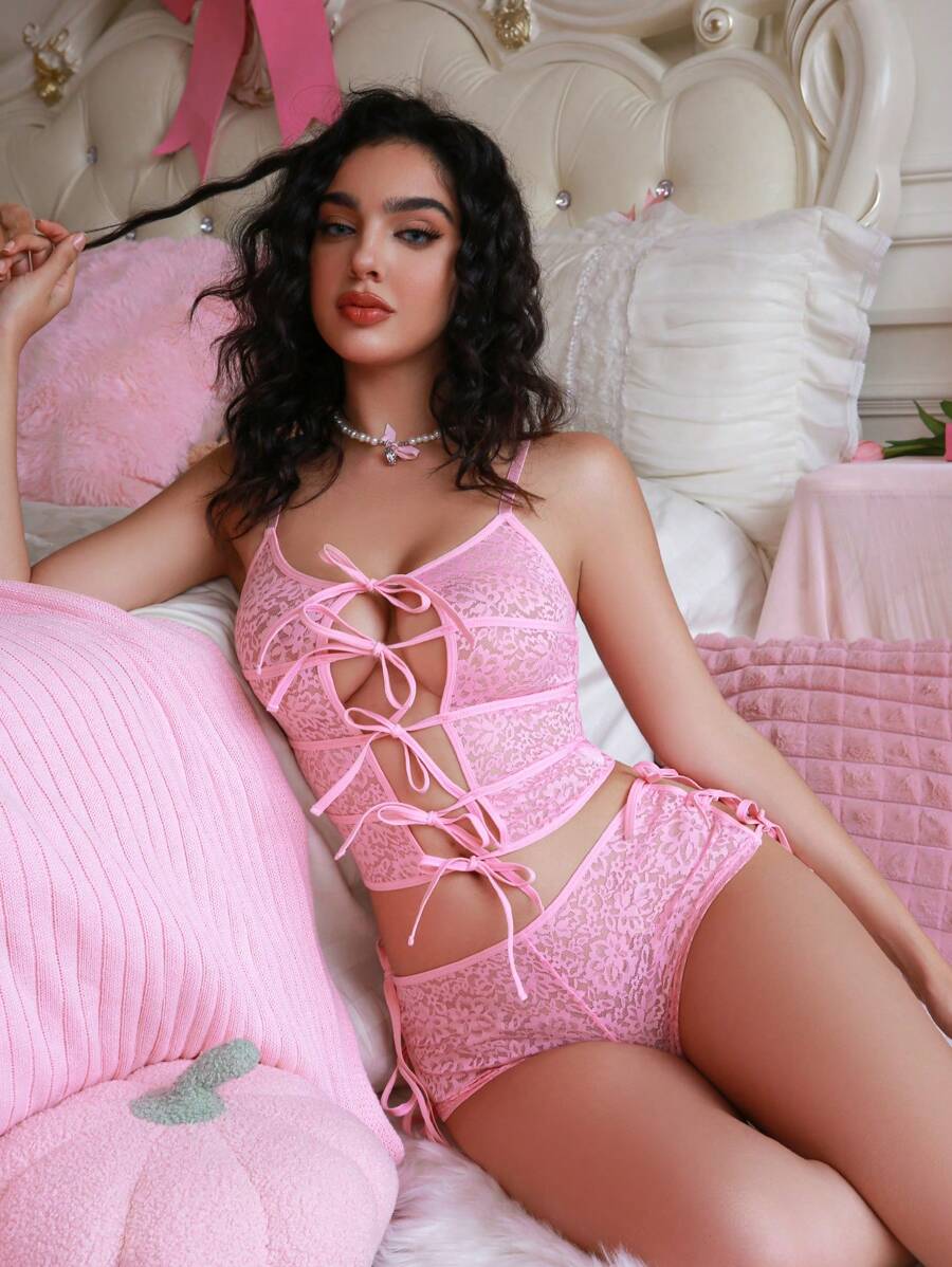 Conjunto de lenceria sexy para salir con brasier bralette y pantis de unicolor con cordones cruzados y calados para mujer