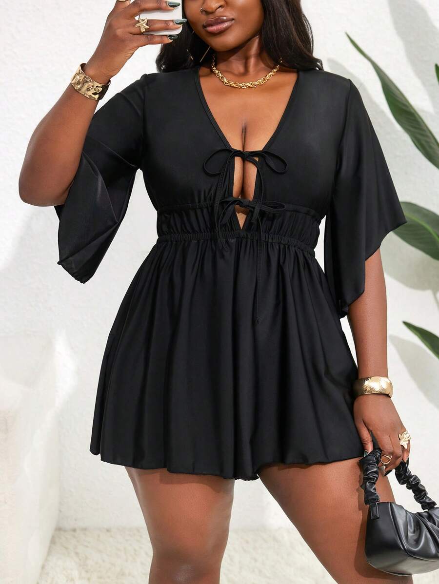 Vestido de traje de bano sexy con mangas con volantes y nudo delantero en unicolor para mujer talla grande