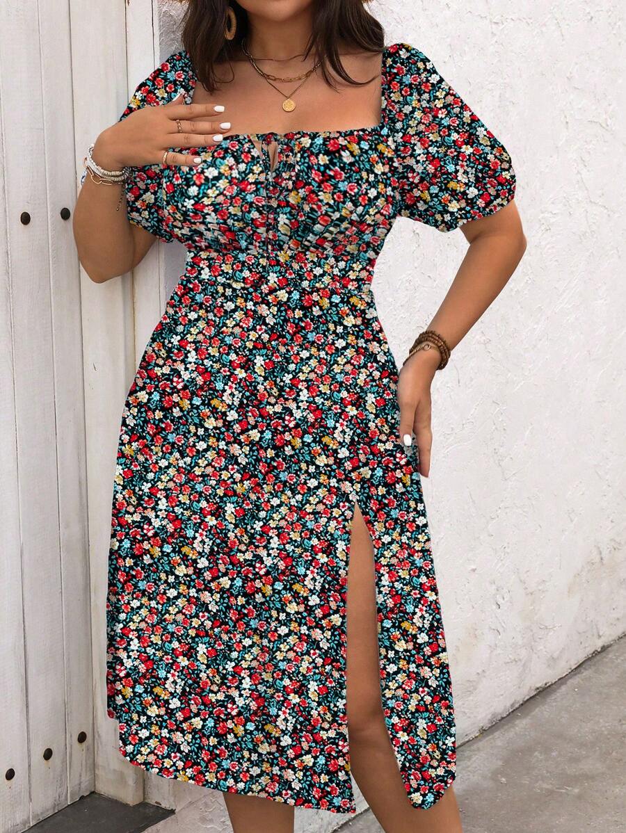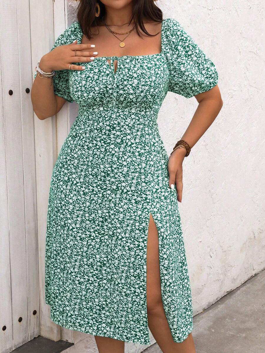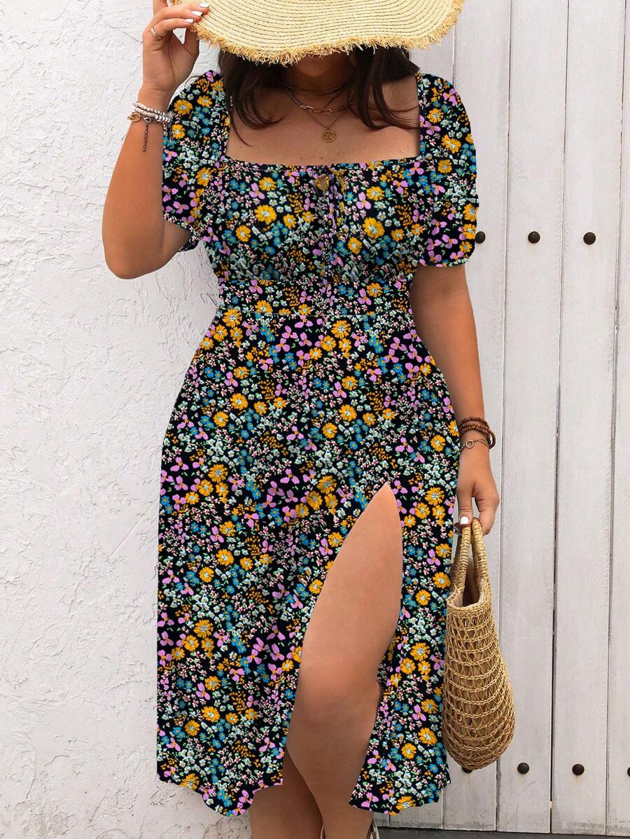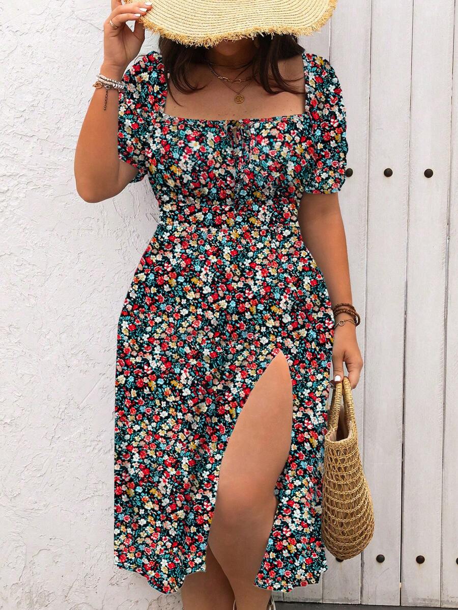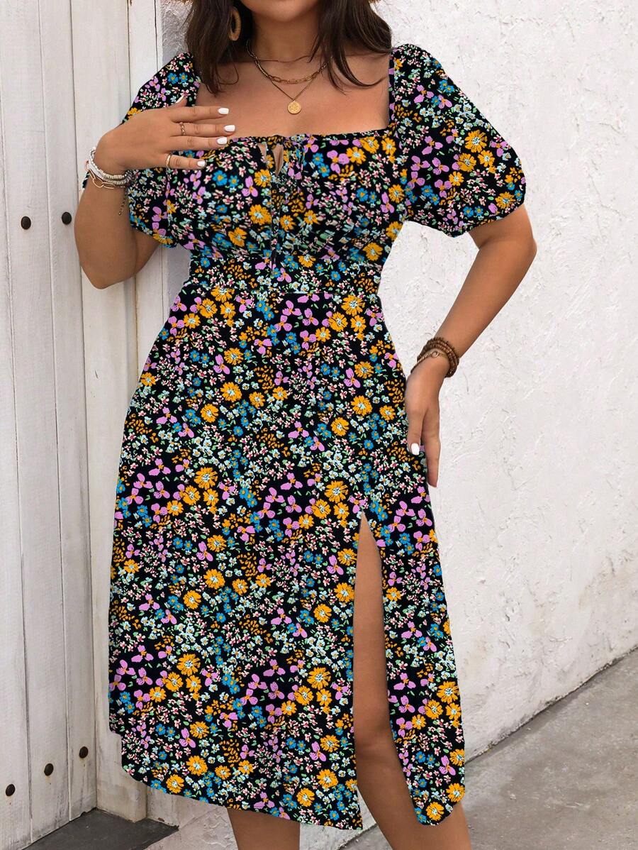 Vestido de verano de talla grande con escote cuadrado, estampado floral "ditsy", lazo delantero y abertura lateral para vacaciones, para mujeres
