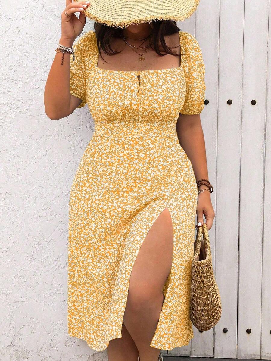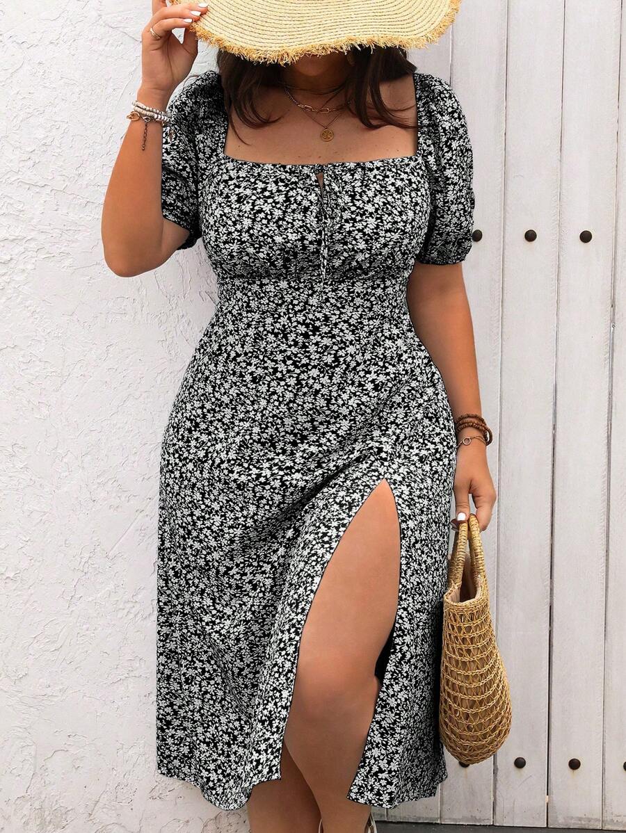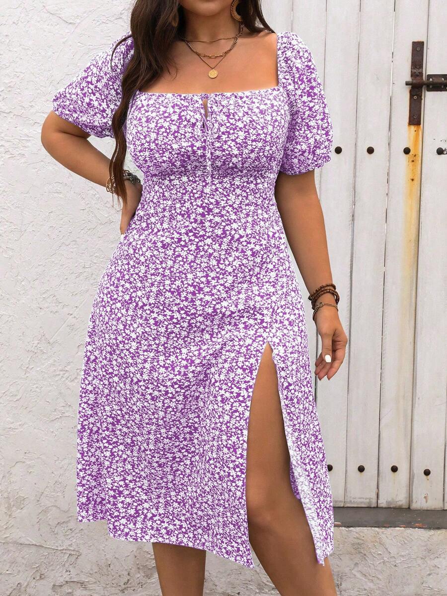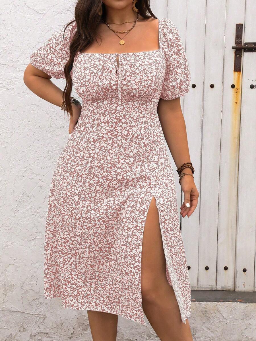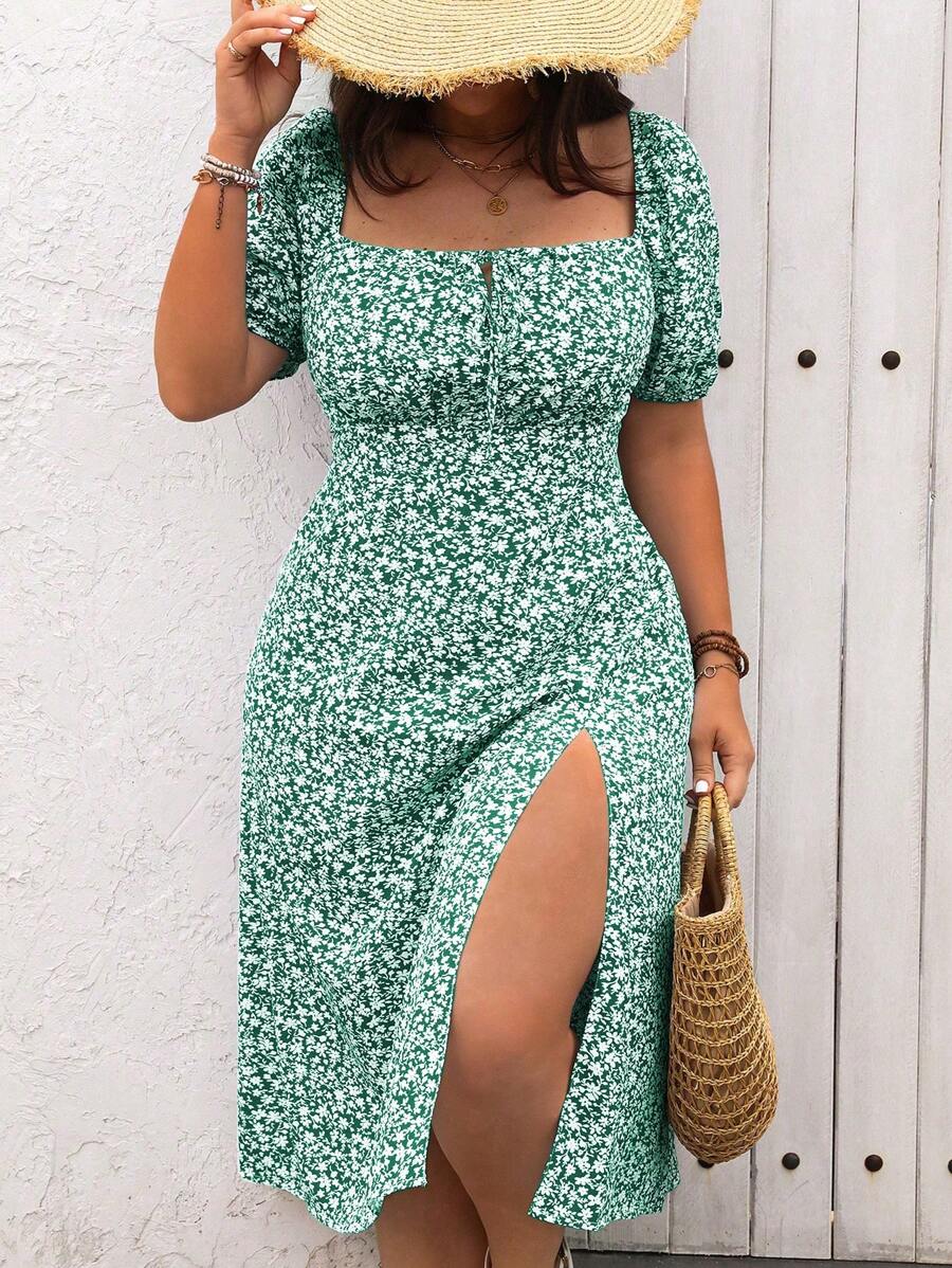 Vestido de verano de talla grande con escote cuadrado, estampado floral "ditsy", lazo delantero y abertura lateral para vacaciones, para mujeres
